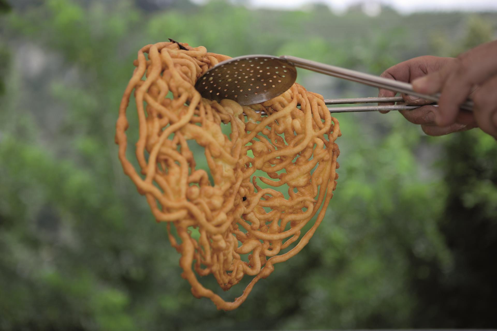 Rozpalte olej nebo tuk na pánvi, těsto nalijte do trychtýře a od středu jej spirálovitě lijte do horkého oleje. Smažte z obou stran dozlatova. Nechte okapat na papíru a podávejte.