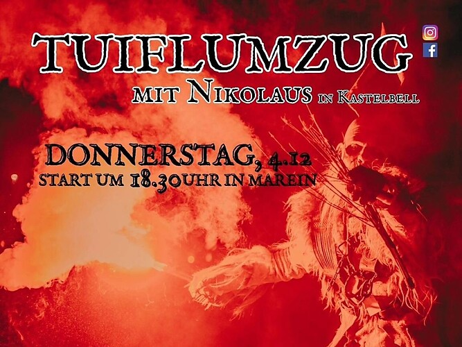 Start ist um 18.30 Uhr bei der Kirche in Marein. Von dort ziehen wir gemeinsam Richtung Kastelbell, weiter zum Dorfplatz und anschließend zum Musikpavillon , wo die Gabenverteilung stattfindet.