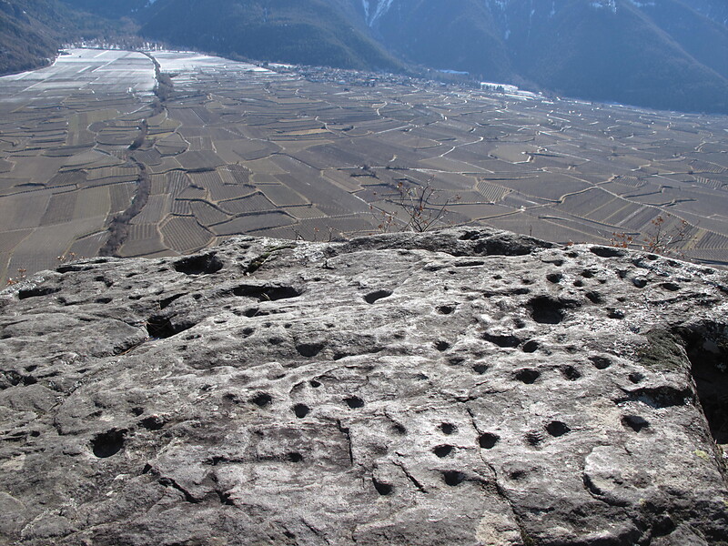 Weltweit verbreitet und rätselhaft wie Menhire und Felsenzeichnungen erscheint heute das Phänomen der Schalensteine. Auch am Sonnenberg zwischen Kastelbell und Goldrain und im Martelltal sind viele unterschiedliche Schalensteine aufzufinden. Dabei handelt es sich um kleinere und größere von Menschenhand geschaffene Vertiefungen in Fels- und Gesteinsoberflächen. Man findet sie einzeln oder auch in Gruppen, meist an alten Wegtrassen, Wasserläufen und häufig an exponierten Stellen. Der Beginn der Schalensteinproduktion reicht im Alpenraum archäologisch nachgewiesen bis in die Jungsteinzeit (eventuell sogar in die Mittelsteinzeit) zurück. In der Bronzezeit wurden auch noch häufig Schalensteine angefertigt. Bis zum Ende der Eiszeit kam es anscheinend zum Abklingen dieses Brauches. Erst im späten Frühmittelalter, als das Christentum bereits weit fortgeschritten war, tritt ein neuer Aufschwung ein. Eine zweite Blüte erlangte dieses Phänomen im Hochmittelalter, um im frühen 18. Jahrhundert endgültig zu versiegen. Ihre Formen reichen von 3-5 cm großen und 2-4 cm tief eingemeißelten konischen Schälchen, bis zu Rillen, Rinnen, Kreuzen und magischen Vierecken. Über ihre Funktion wird viel spekuliert. Man denkt an Opferschälchen, Sternenkarten, Sonnen-, Schamanen- und Fruchtbarkeitskultplätzen, eine Art von Felsbildern und Wegzeichen. Vielleicht wollte man auch nur das Steinmehl gewinnen und schrieb ihm heilende und magische Wirkung zu? Oder sollten (wiederverwendete) Schalensteine vor mittelalterlichen Hauseingängen Hexen fernhalten?