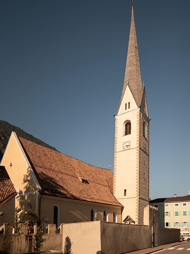 Stammt aus dem 12. Jahrhundert und enthält Stilelemente aus der Romanik bis zur Neugotik. Das Hauptportal in weißem Marmor wurde 1524 von Oswald Furter geschaffen. Im nördlichen Seitenschiff befindet sich ein aus dem Jahre 1350 stammender Grabstein aus rotem Sandstein. Der Grabstein aus weißem Marmor, der kleine Holzaltar und die Statuen der Hl. Anna und des Hl. Josef sind Werke des Meisters Gregor Schwenzengast aus Latsch. Die großen Vesperbilder im Altarraum (18. Jahrhundert) sind Werke von Simon Ybertrachter aus Naturns.