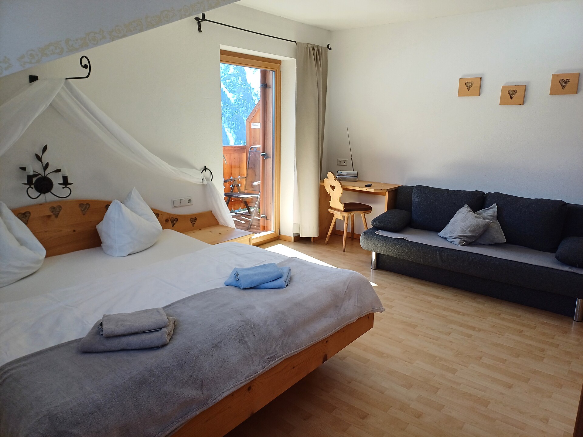 Doppelzimmer, Doppelbett, Babybett, Bettsofa, Balkon, Safe, Nichtraucherzimmer, Dusche / Bad, Haarfön, TV, WLAN, Haupthaus, Panoramablick