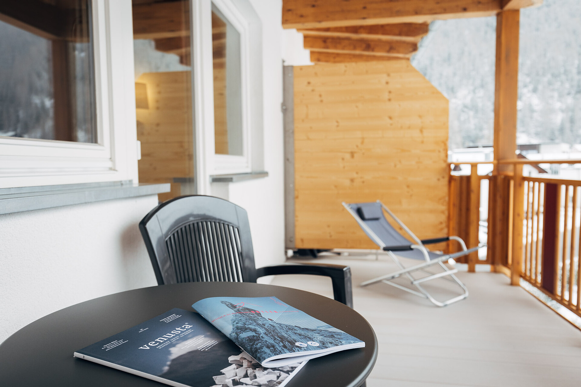 Alle Suiten sind mit einem großzügigen Bad und einem weitläufigem Balkon ausgestatten. Der einen atemberaubenden Blick auf die Ortlergruppe bietet
