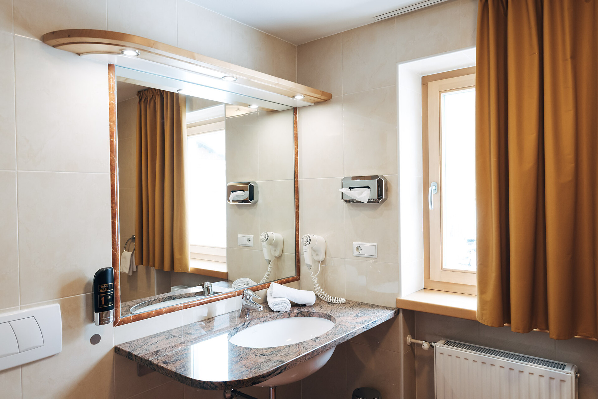 Doppelzimmer mit großzügigem Bad und einem weitläufigen Balkon mit Blick auf die atemberaubende Ortlergruppe.