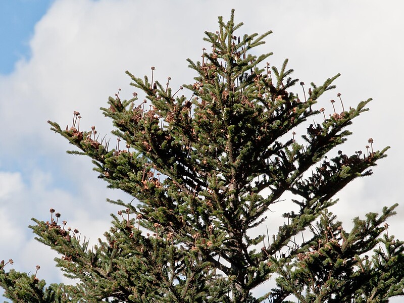 Früchte: Aufrecht stehende längliche Zapfen, die bei Reife am Baum zerfallen; Samen dreieckig, geflügelt