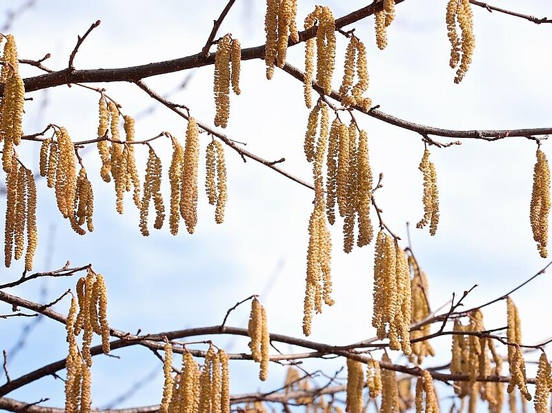 Blüte: einhäusig, Kätzchen (männlich) 8 – 10 cm, Knospe (weiblich) unscheinbar, rote Narbe