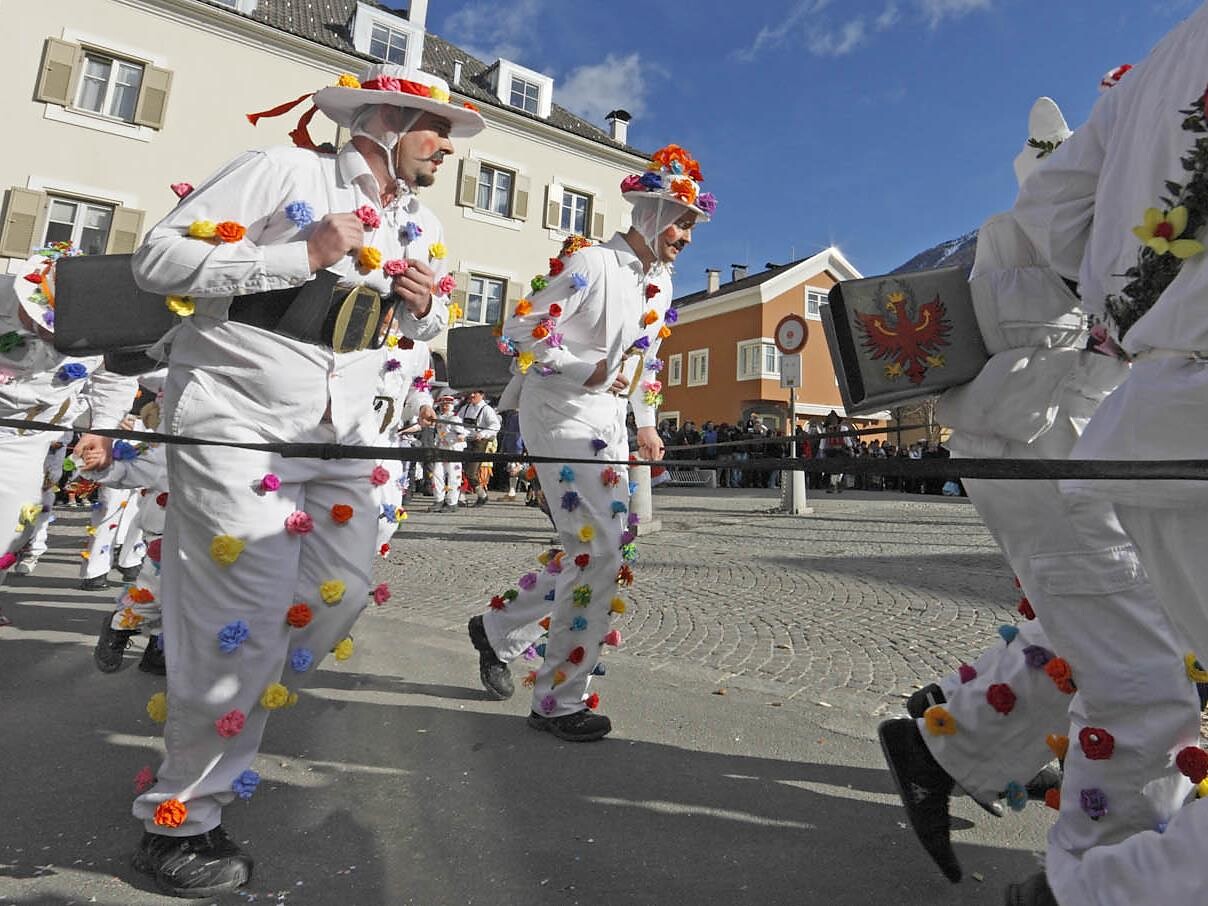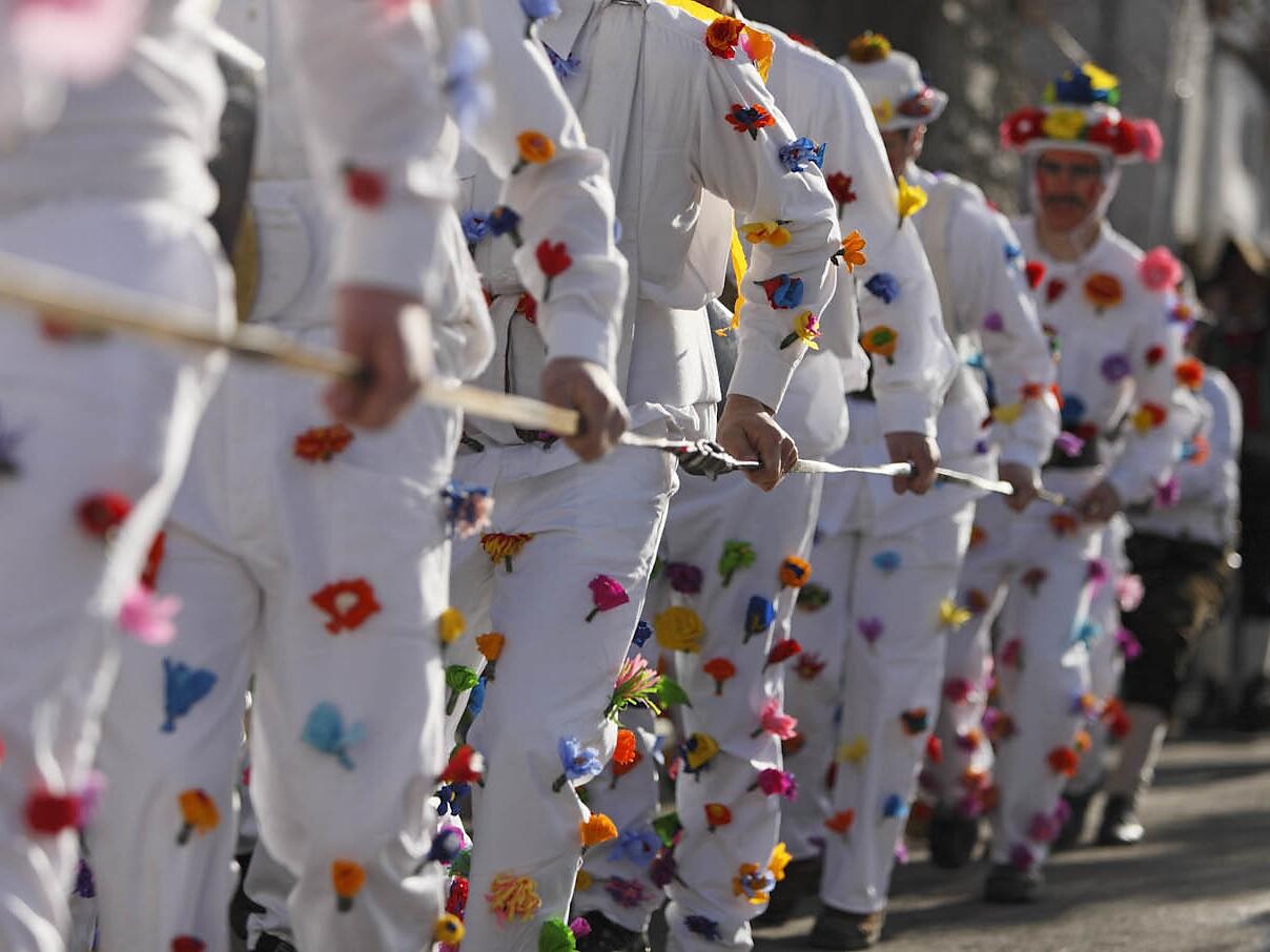 Es ist ein Karnevalsumzug und gleichzeitig ein genau choreographiertes Lärmritual. Am Unsinnigen Donnerstag verkleiden sich junge Burschen in weiße Gewänder, die mit bunten Papierblumen geschmückt sind und um den Bauch große, oft über 20 kg schwere Kuhglocken tragen.