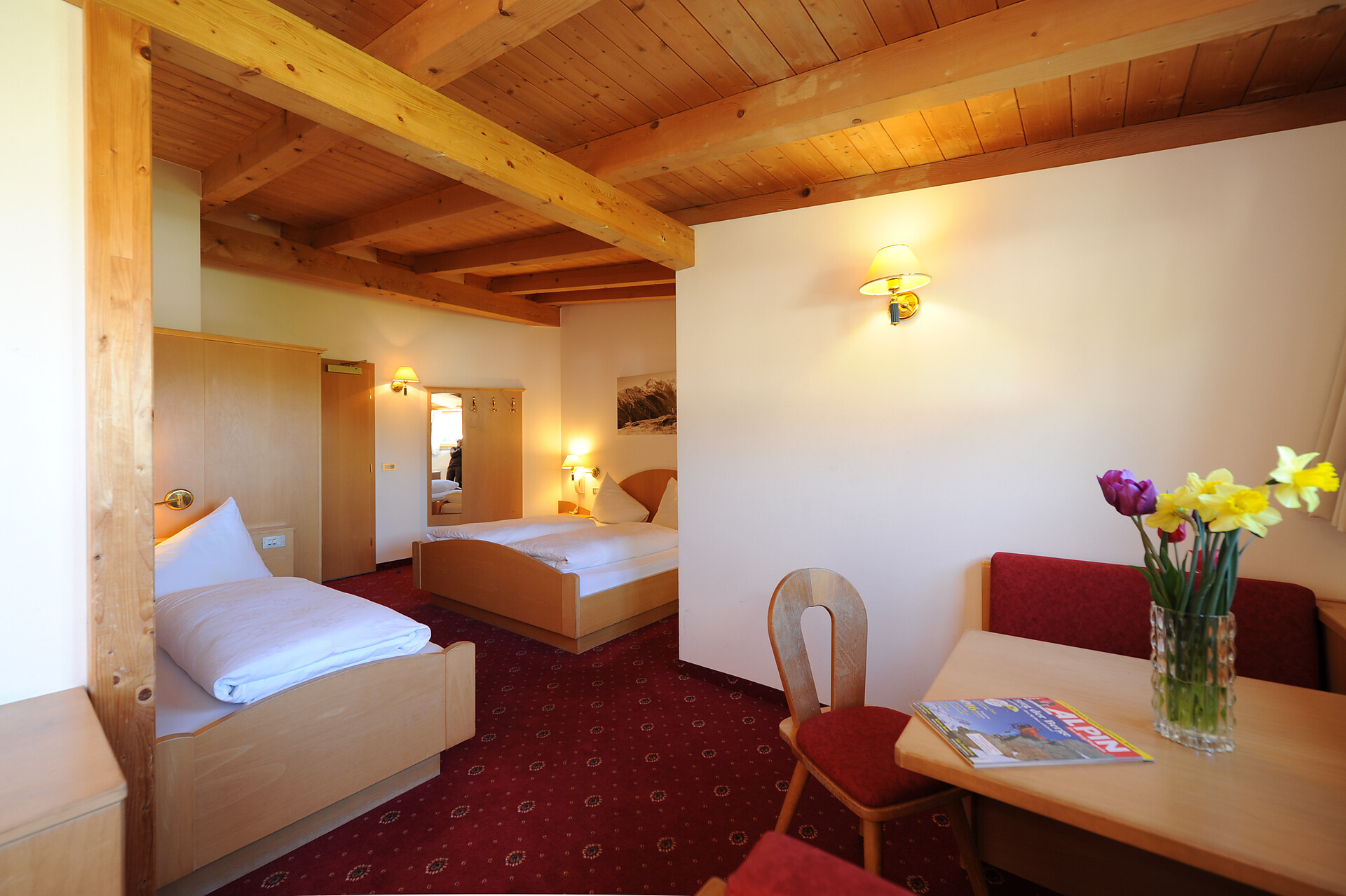 Gemütliches Dreibettzimmer von 23-27m², mit zum Teil Balkon, Berglick, freies W-Lan im ganzen Haus, Dusche-WC, Sat-TV, Safe, Föhn und Telefon.