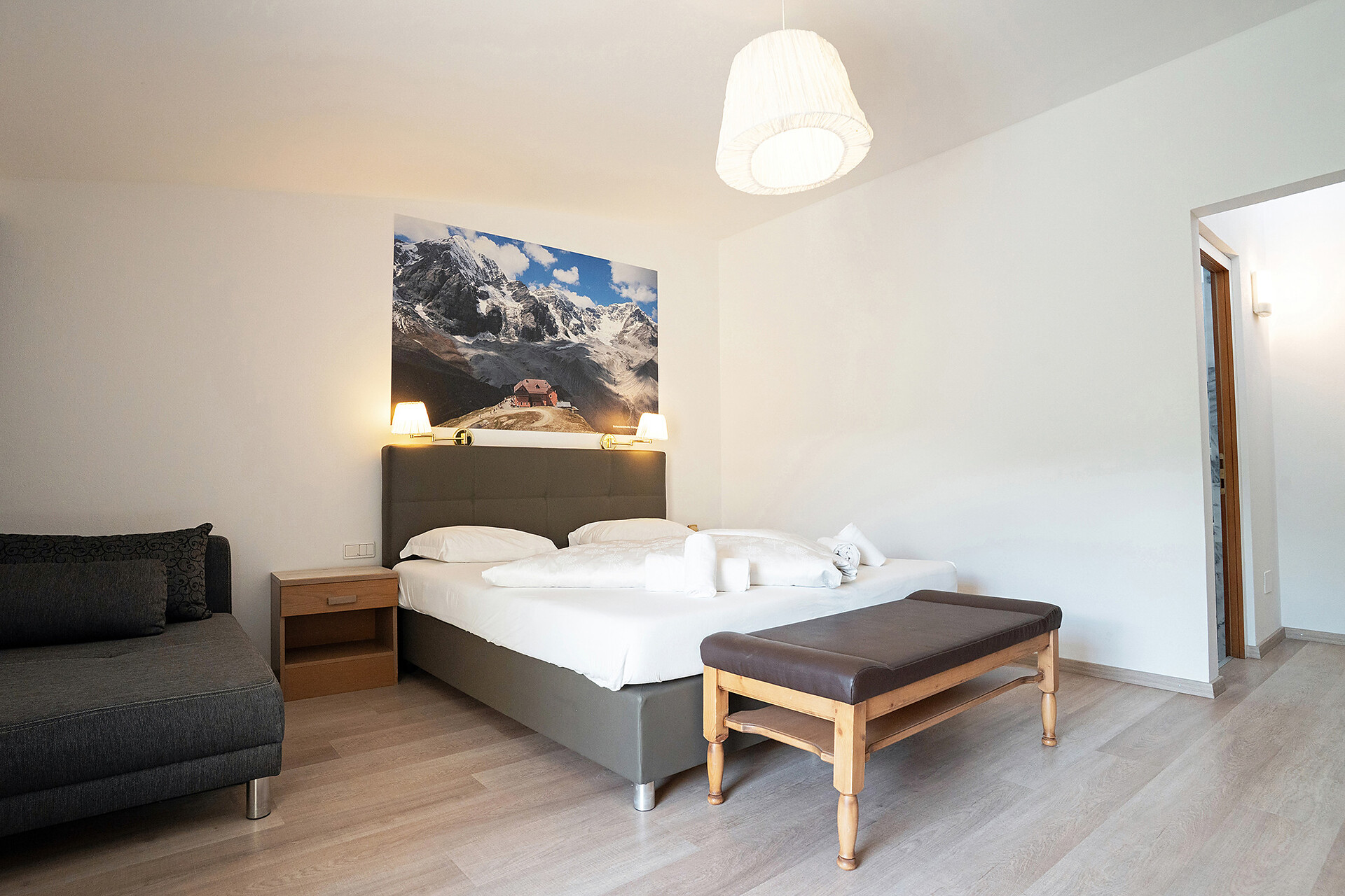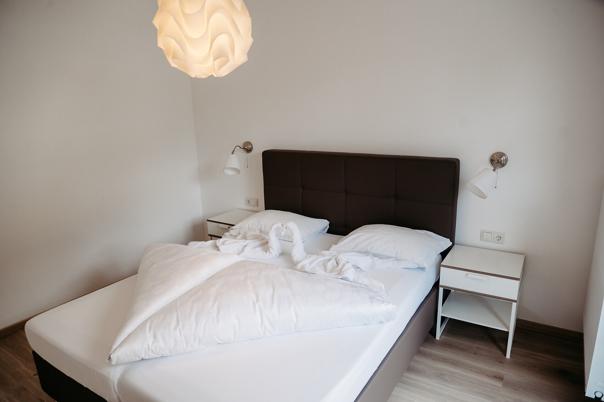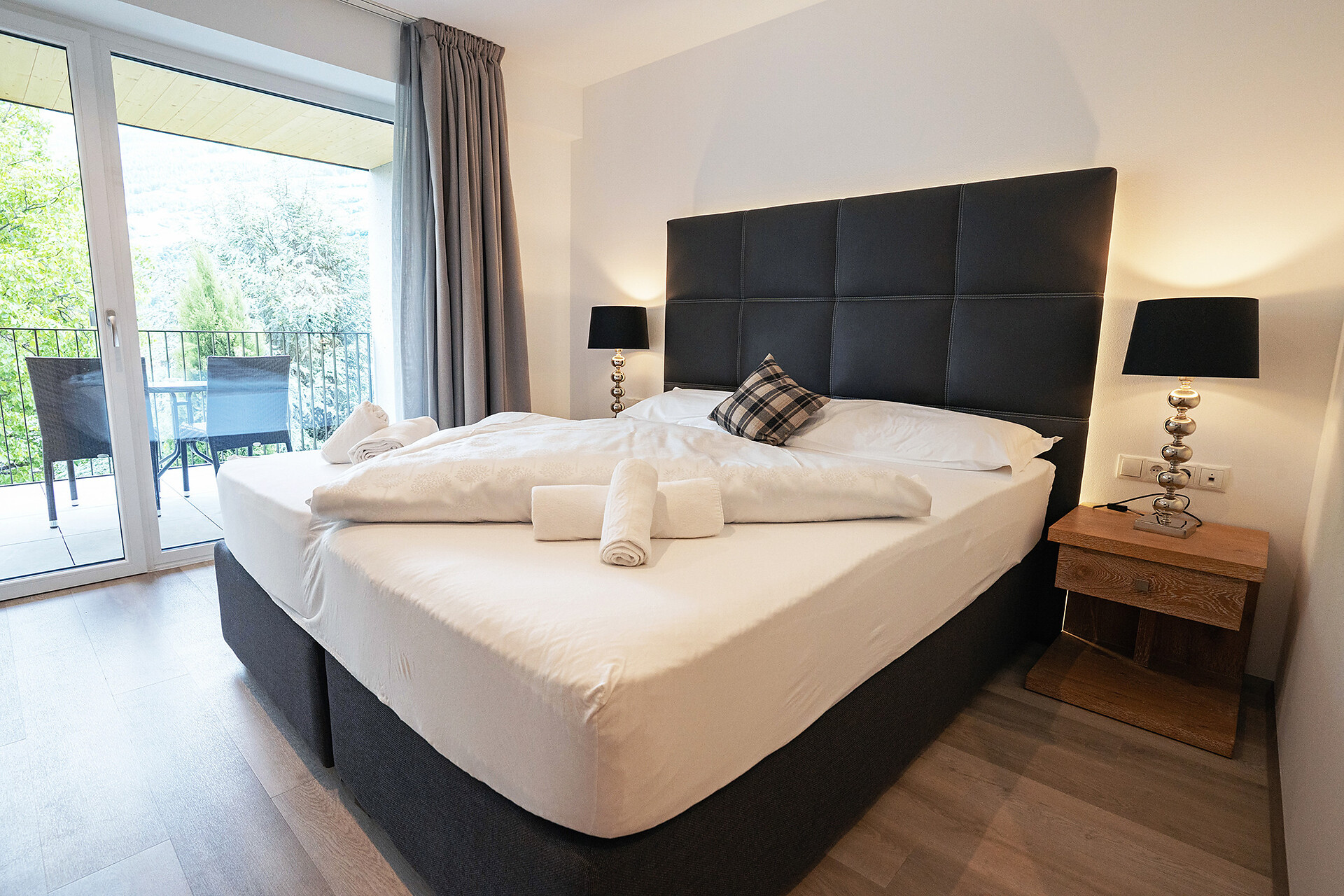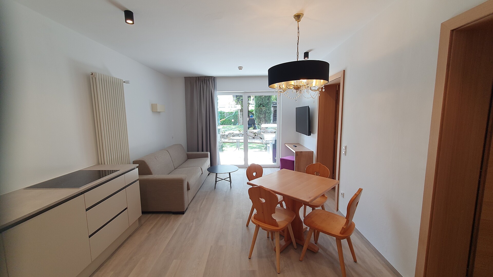 Unsere stilvolle Juniorsuite bietet auf ca. 40 m² alles, was Sie für einen erholsamen Aufenthalt benötigen. Die Suite verfügt über einen Wohnbereich mit moderner Küchenzeile, einen separaten Schlafbereich für Kinder und ein gemütliches Elternschlafzimmer. Das großzügige Badezimmer ist mit einer begehbaren Dusche und einem Bidet ausgestattet. Die Einrichtung besticht durch ihren modernen Stil, der helle Parkettboden verleiht der Suite ein warmes und einladendes Ambiente. Selbstverständlich stehen Ihnen kostenfreies WLAN und Satelliten-TV zur Verfügung. Genießen Sie die Sonne auf der über 10 m² großen Terrassen mit Blick auf den Sonnenberg – der perfekte Ort zum Entspannen und Abschalten.
