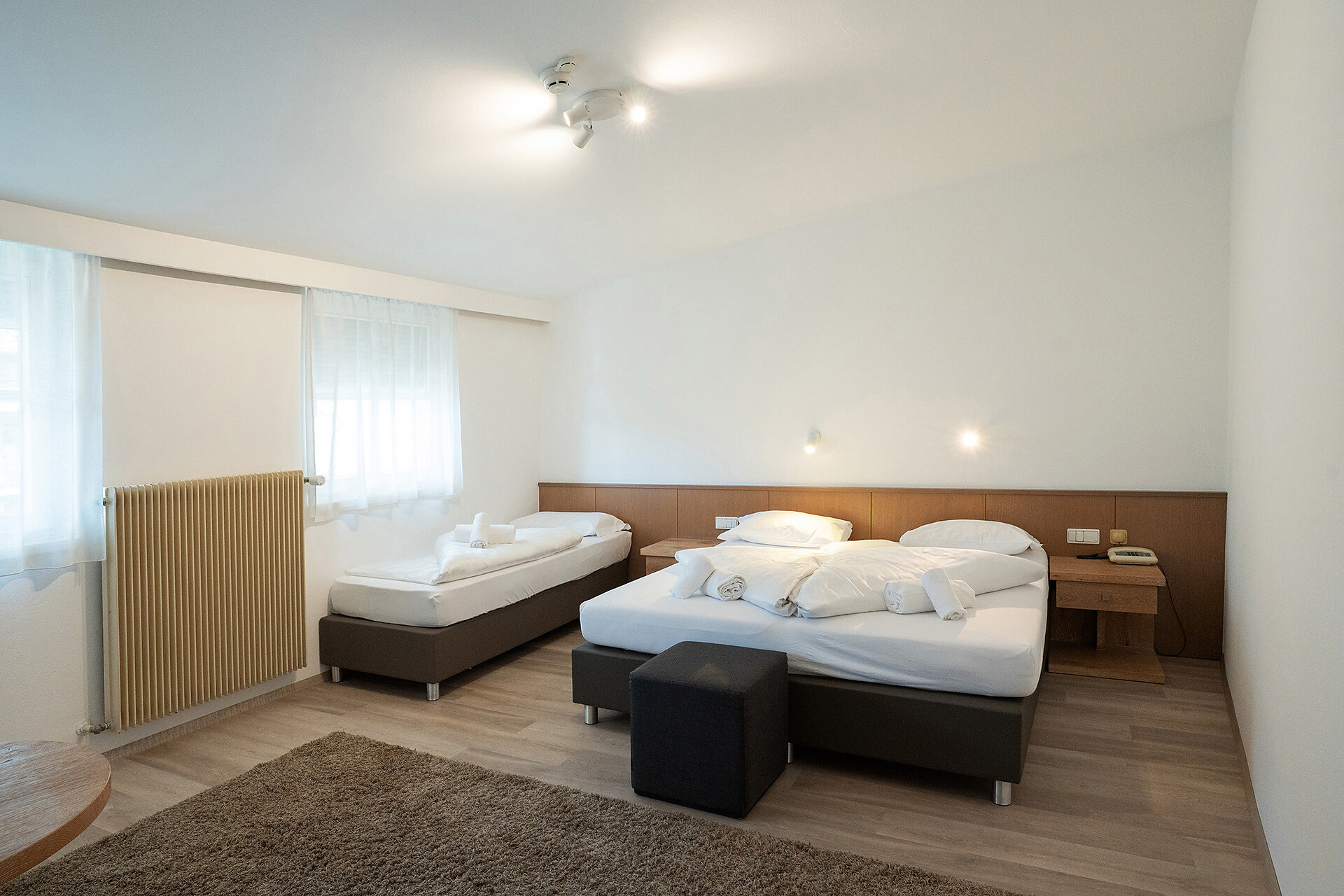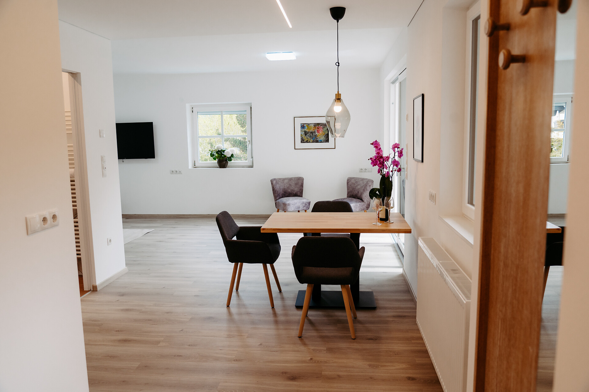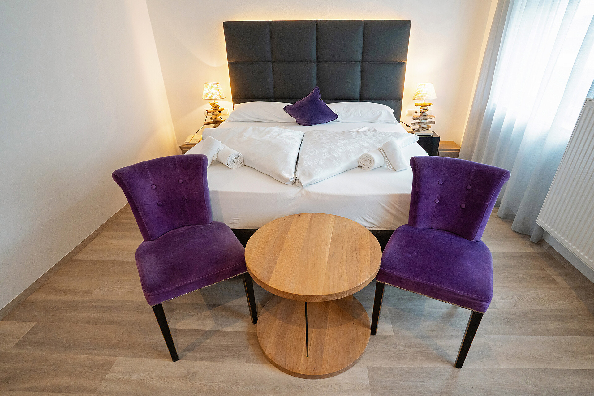Unsere stilvolle Juniorsuite bietet auf ca. 40 m² alles, was Sie für einen erholsamen Aufenthalt benötigen. Die Suite verfügt über einen Wohnbereich mit moderner Küchenzeile, einen separaten Schlafbereich für Kinder und ein gemütliches Elternschlafzimmer. Das großzügige Badezimmer ist mit einer begehbaren Dusche und einem Bidet ausgestattet. Die Einrichtung besticht durch ihren modernen Stil, der helle Parkettboden verleiht der Suite ein warmes und einladendes Ambiente. Selbstverständlich stehen Ihnen kostenfreies WLAN und Satelliten-TV zur Verfügung. Genießen Sie die Sonne auf der über 10 m² großen Terrassen mit Blick auf den Sonnenberg – der perfekte Ort zum Entspannen und Abschalten.