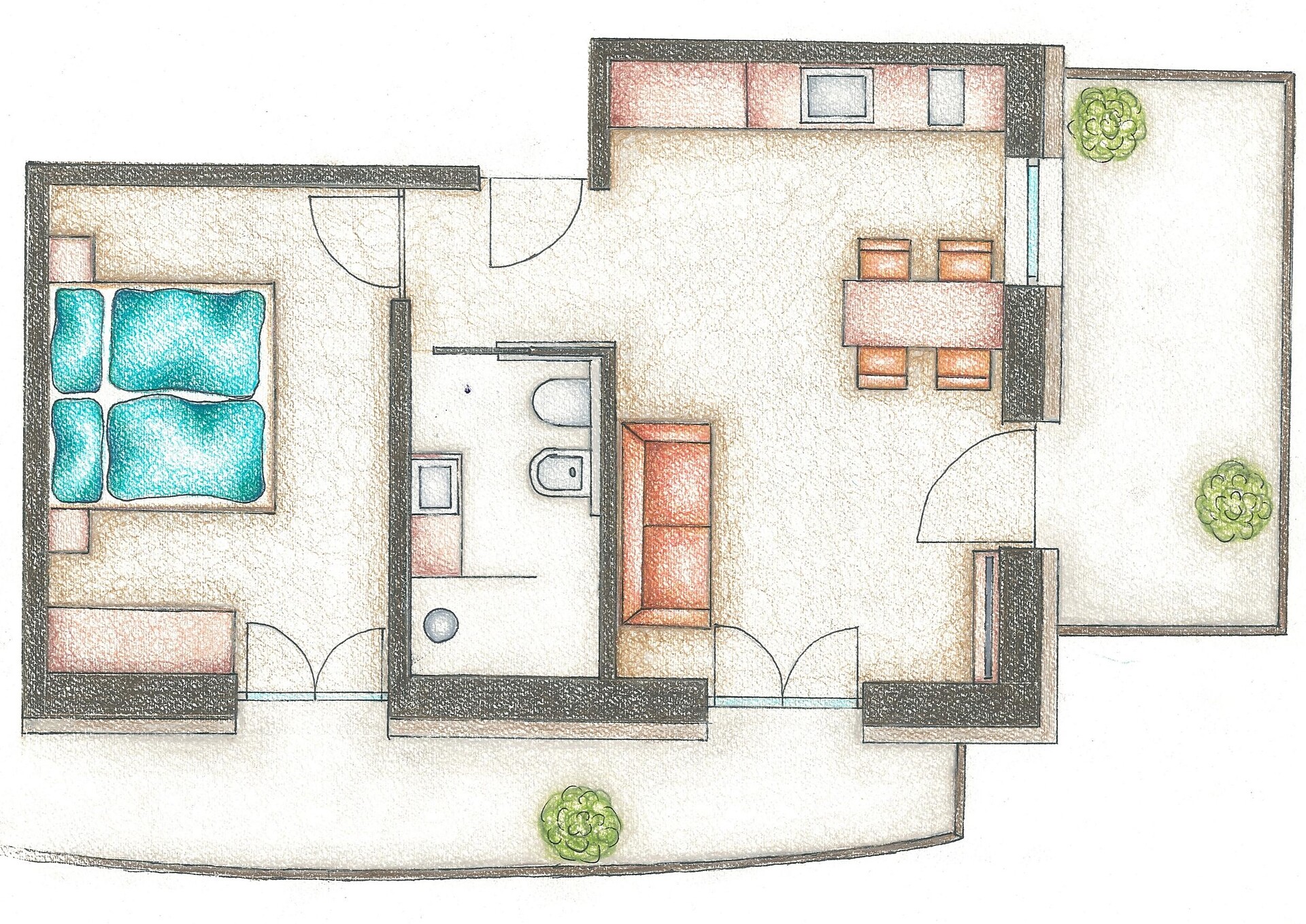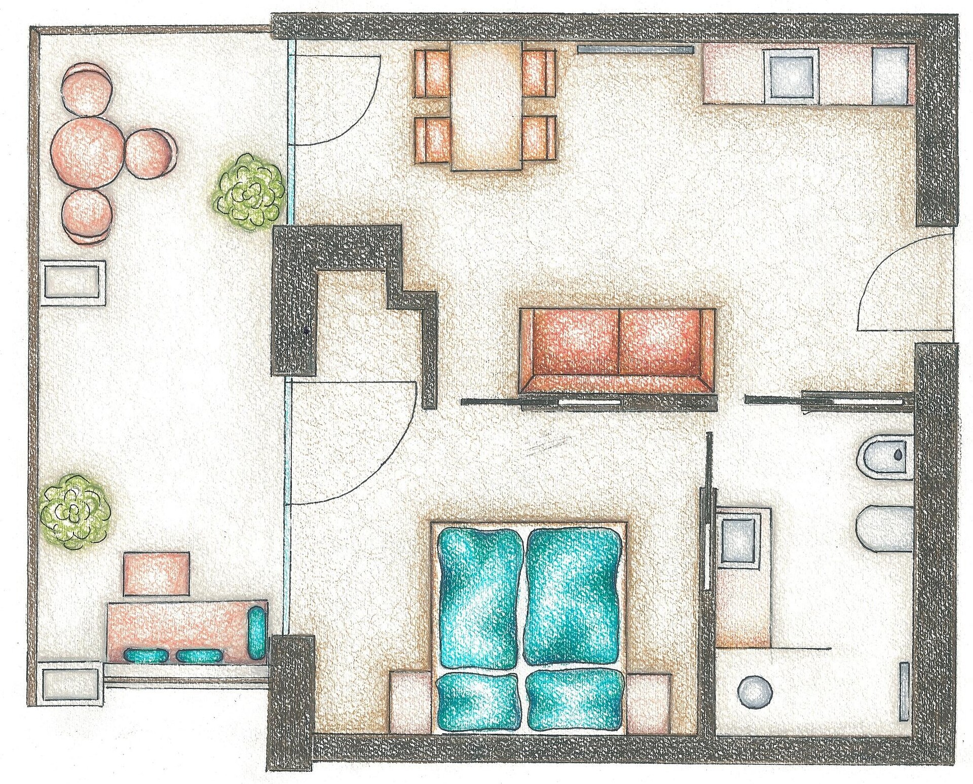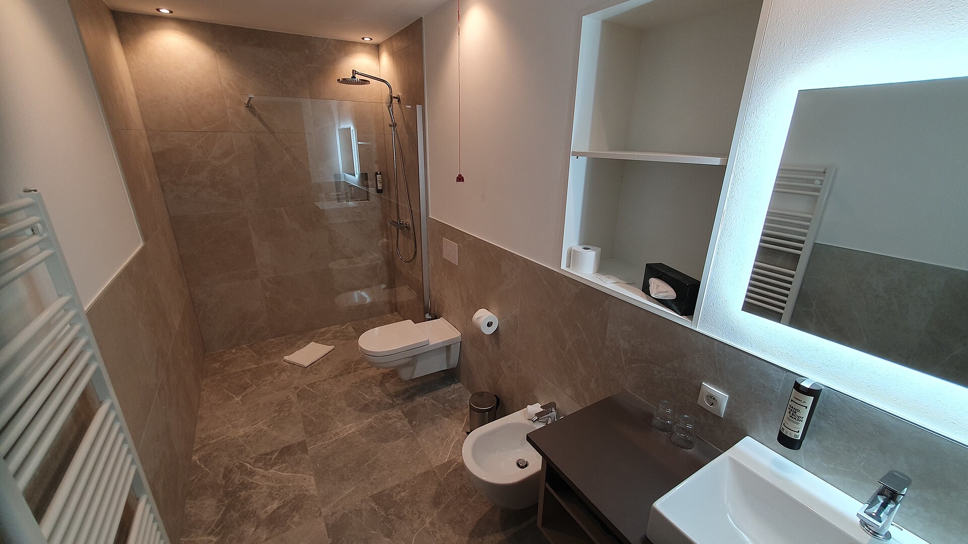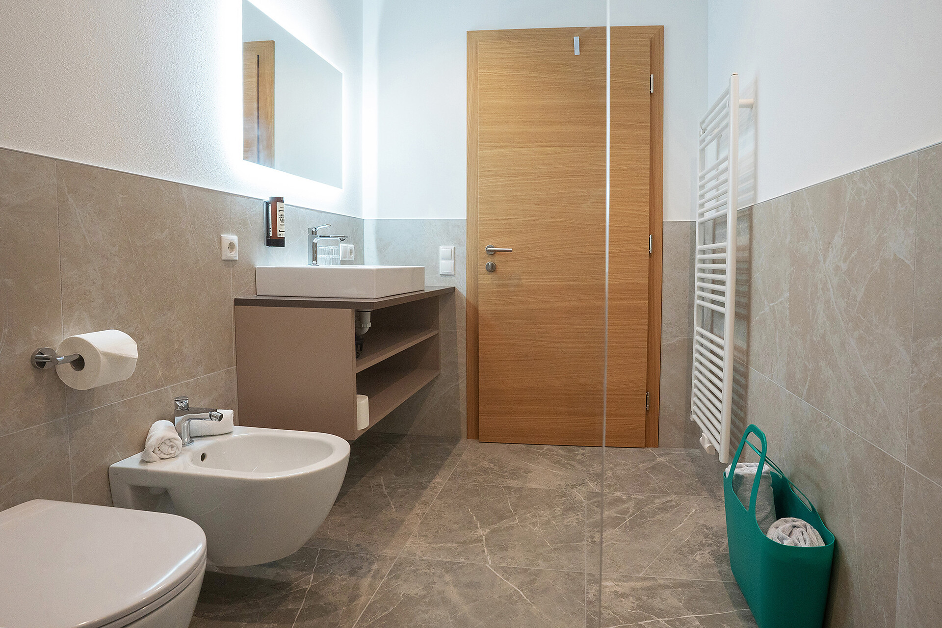 Unsere stilvolle Juniorsuite bietet auf ca. 40 m² alles, was Sie für einen erholsamen Aufenthalt benötigen. Die Suite verfügt über einen Wohnbereich mit moderner Küchenzeile, einen separaten Schlafbereich für Kinder und ein gemütliches Elternschlafzimmer. Das großzügige Badezimmer ist mit einer begehbaren Dusche und einem Bidet ausgestattet. Die Einrichtung besticht durch ihren modernen Stil, der helle Parkettboden verleiht der Suite ein warmes und einladendes Ambiente. Selbstverständlich stehen Ihnen kostenfreies WLAN und Satelliten-TV zur Verfügung. Genießen Sie die Sonne auf der über 10 m² großen Terrassen mit Blick auf den Sonnenberg – der perfekte Ort zum Entspannen und Abschalten.