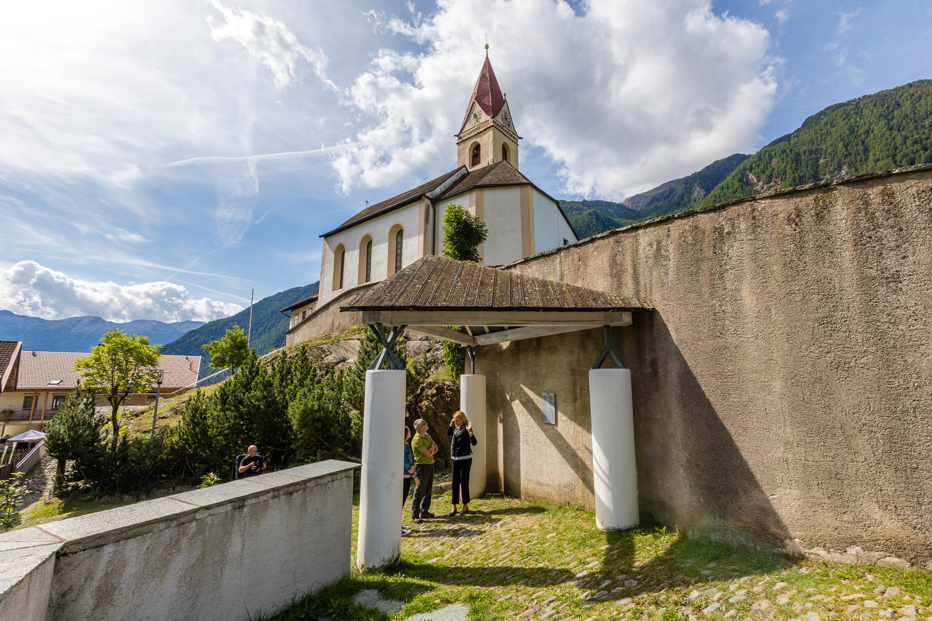 Einen schöneren Platz für eine Kirche gibt es wohl selten: Hoch oben über dem Tal thront die Pfarrkirche von Katharinaberg. Auf der Fahrt Tal einwärts sticht der hochaufragende Kirchturm auf einem Hochplateau mit Felsvorsprung ins Auge. Die Pfarrkirche steht auf den Trümmern der 1350 zerstörten Schnalsburg – die Burg, die dem Tal den Namen gab. Der heutige Bau stammt aus dem Jahr 1499.