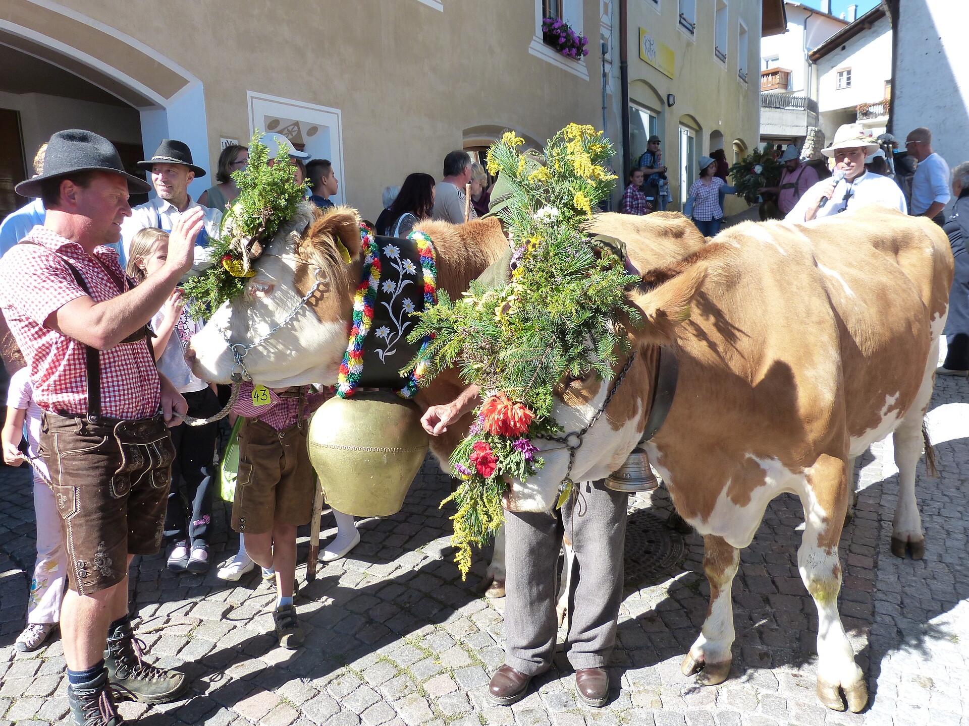 Im Zeitraum von Anfang September bis Ende September, bevor es in den Höhenlagen kälter wird, finden in Südtirol die Almabtriebe statt. Die besten Milchkühe werden als Anerkennung ihrer Leistung üppig und schön mit Blumen geschmückt. Im Tal wird das Ankommen von Vieh und Almpersonal von der Dorfgemeinschaft bei einem kleinen Fest gebührend gefeiert.