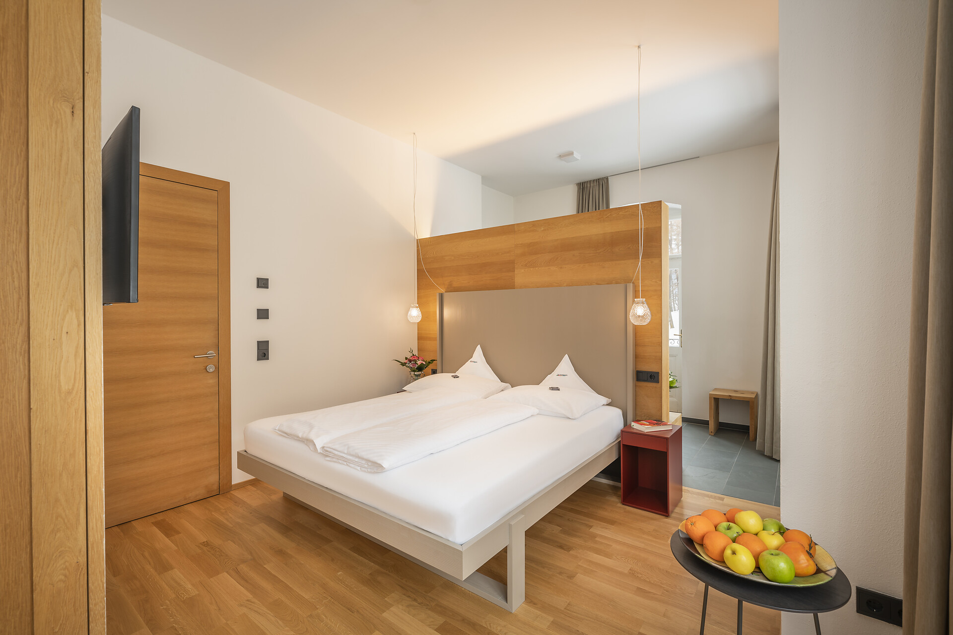 Das Doppelzimmer 34m² befindet sich im modernen Zubau, ist aus naturbelassener Zirbe gefertigt und mit Dusche, WC, Telefon, Sat-TV, Safe, Minibar und Internetanschluss ausgestattet. Außerdem gibt es einen Balkon zur Seeseite, von dem Sie einen wunderbaren Blick über den Ortler genießen.
