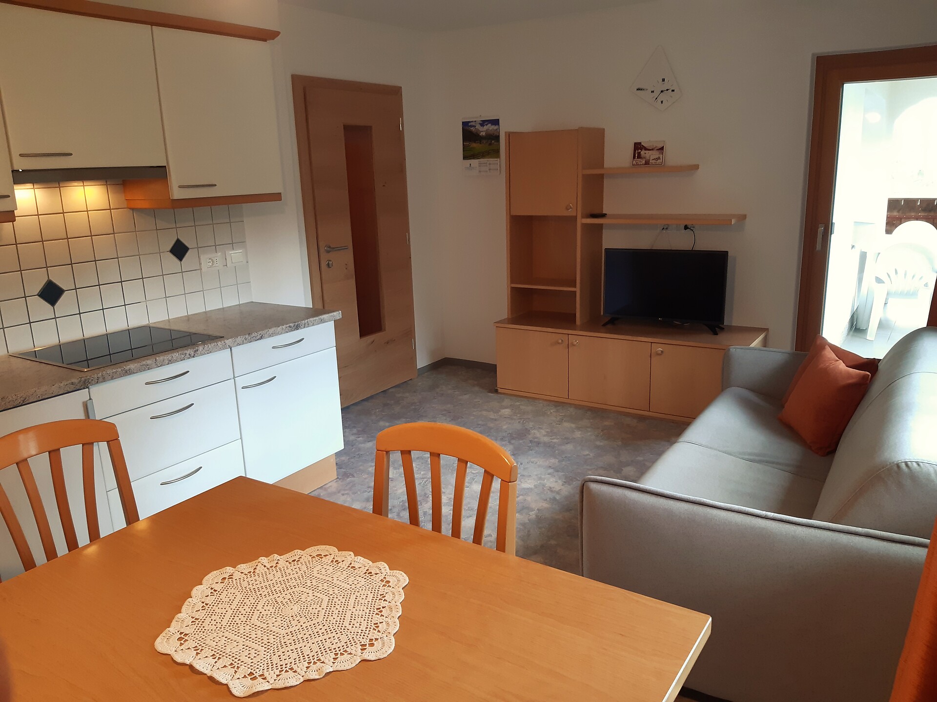 Wohnküche mit Geschirrspülmaschine, Couch und SAT-TV.