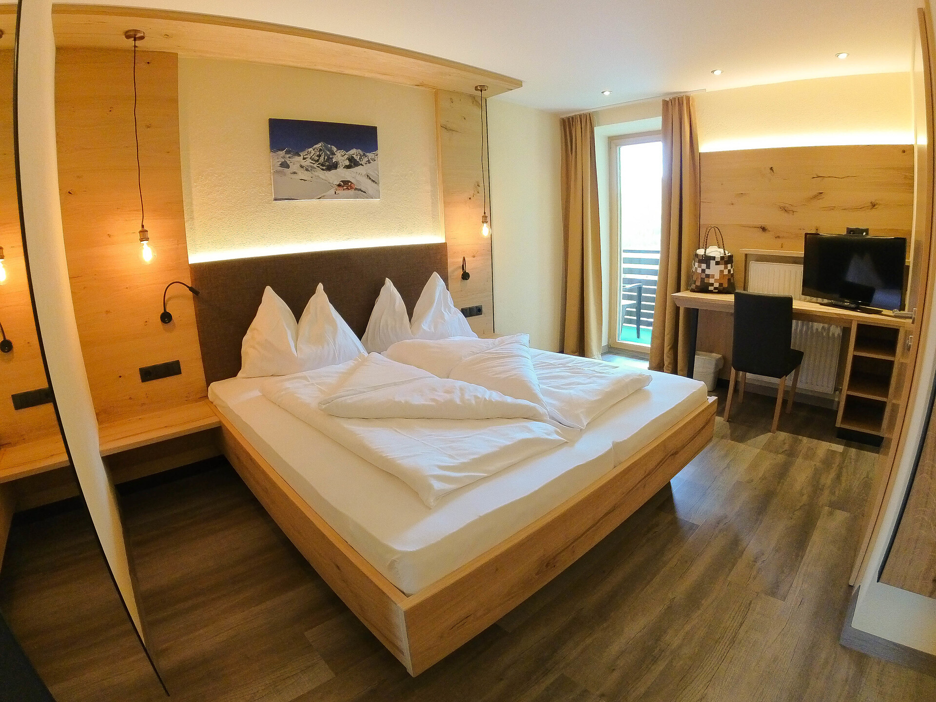 Gemütlich ausgestattetes DoppelzimmerNord oder Ostseite mit Balkon, Sitzgelegenheit und Schreibtisch,Badezimmer mit Dusche, WC, Sat-TV,Wlan, Fön, und Bademantel.