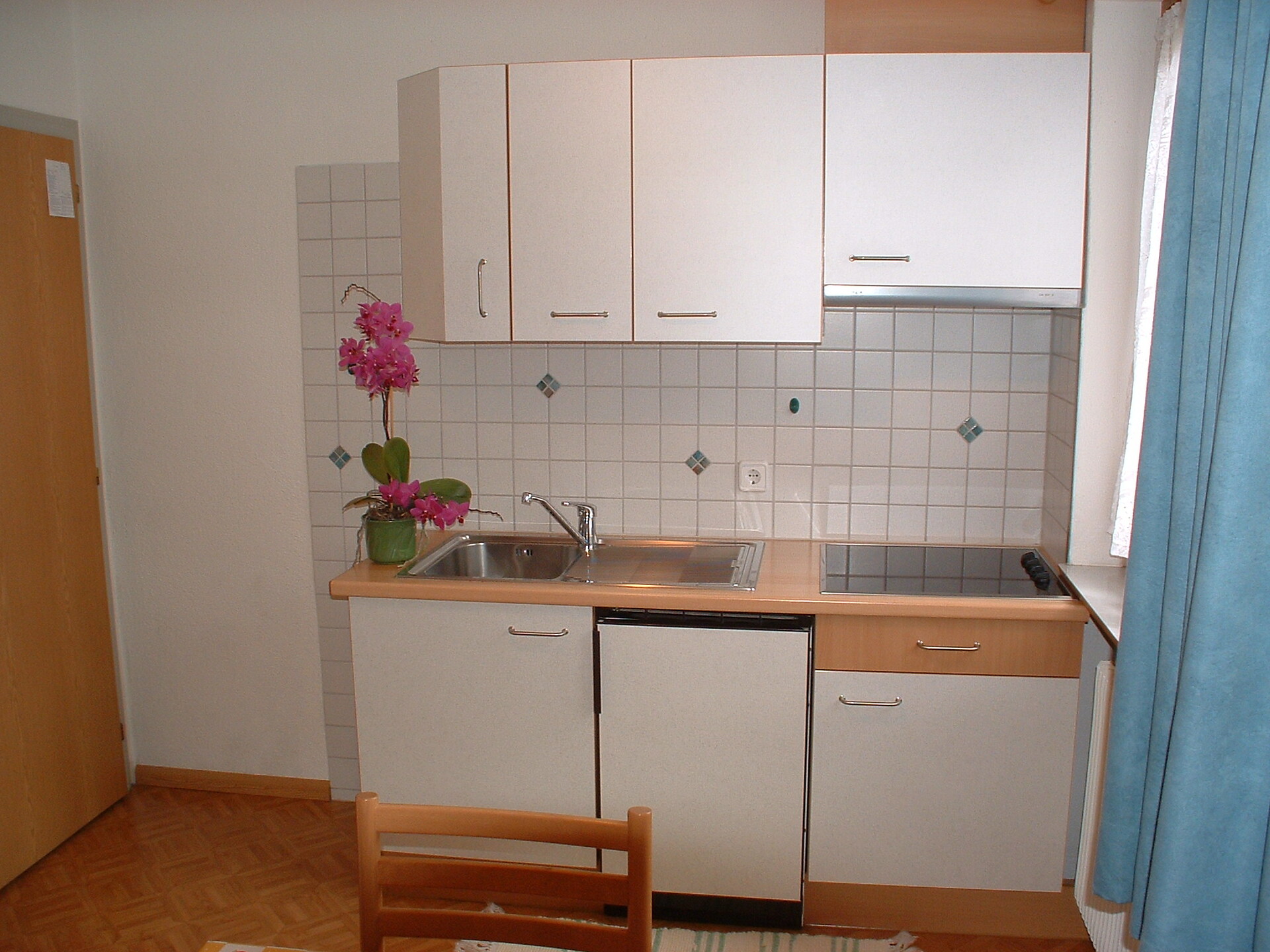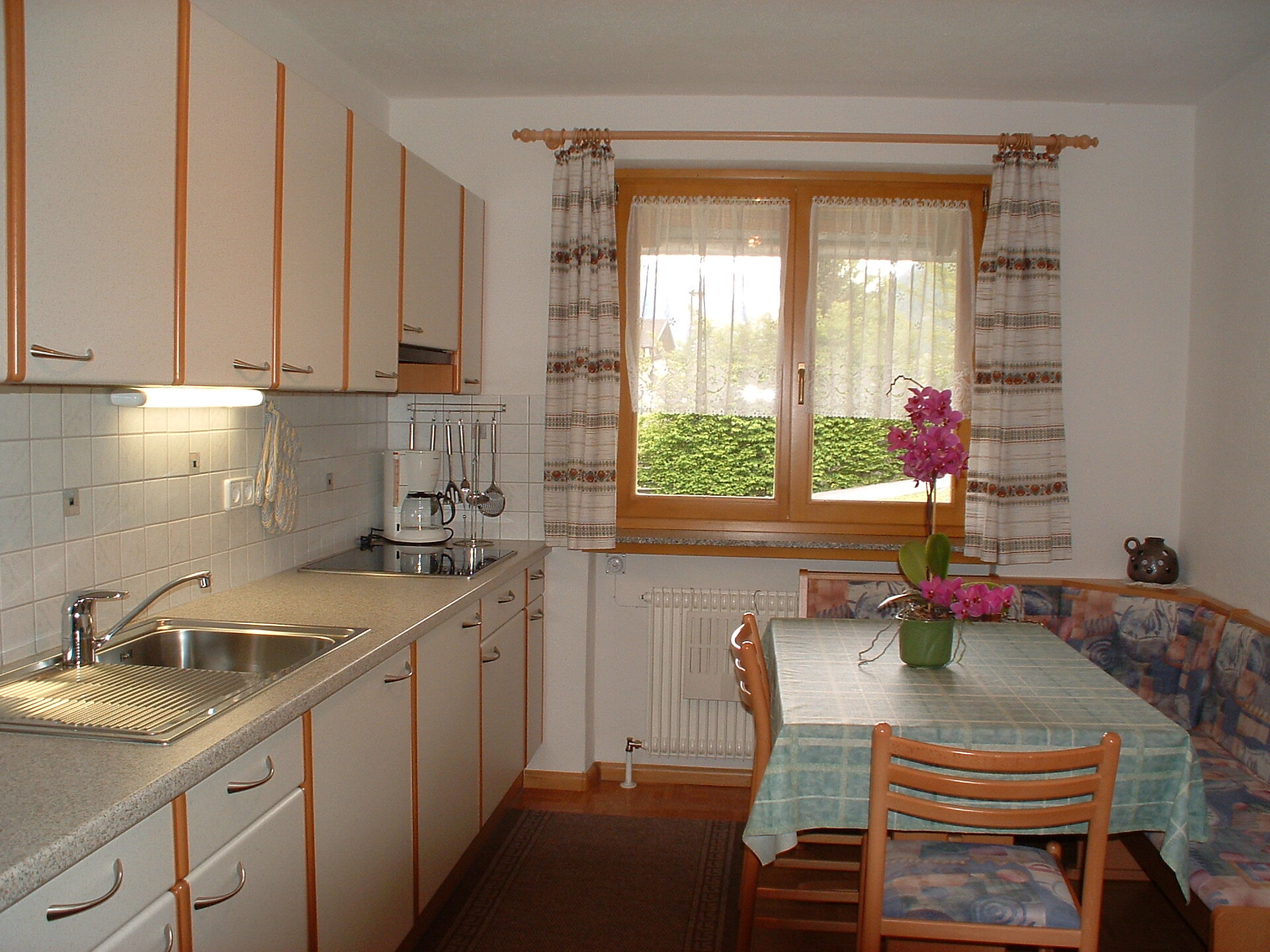 Die geräumige Wohnküche ist ausgestattet mit Eckbank, Couch, SAT-TV mit RAI Programmen, Kühlschrank, E-Herd (Ceran), Wasserkocher, Kaffeemaschine, Toaster, genügend Geschirr und Töpfe.