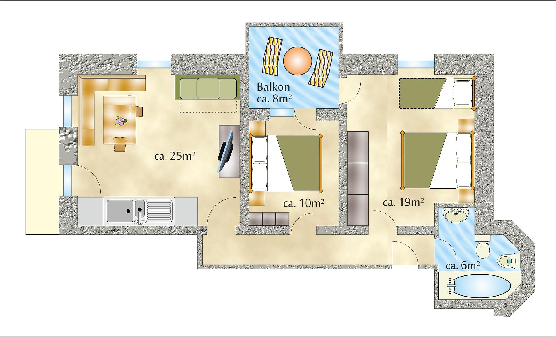 Doppelbett, Doppelschlafcouch, Balkon, Bettwäsche vorhanden, Wohnküche, Kaffeemaschine, Geschirrspülmaschine, Elektroherd, Geschirrausstattung, Dusche/Bad, Bidet, Badetücher, TV, Seeblick, Südseite
