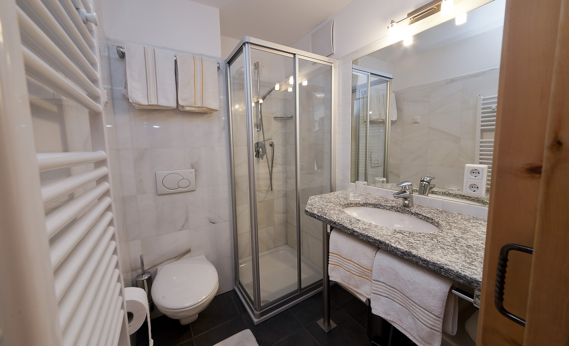 Das, nach leichtem Harz duftenden Schlafzimmer, in Zirbenholz (Bergkiefer) gehalten, lässt die frische, geballte Kraft und zugleich atemberaubende Ruhe der Bergwelt erahnen, es lädt ein zum Träumen, zum Ausruhen, zum Wohlfühlen.