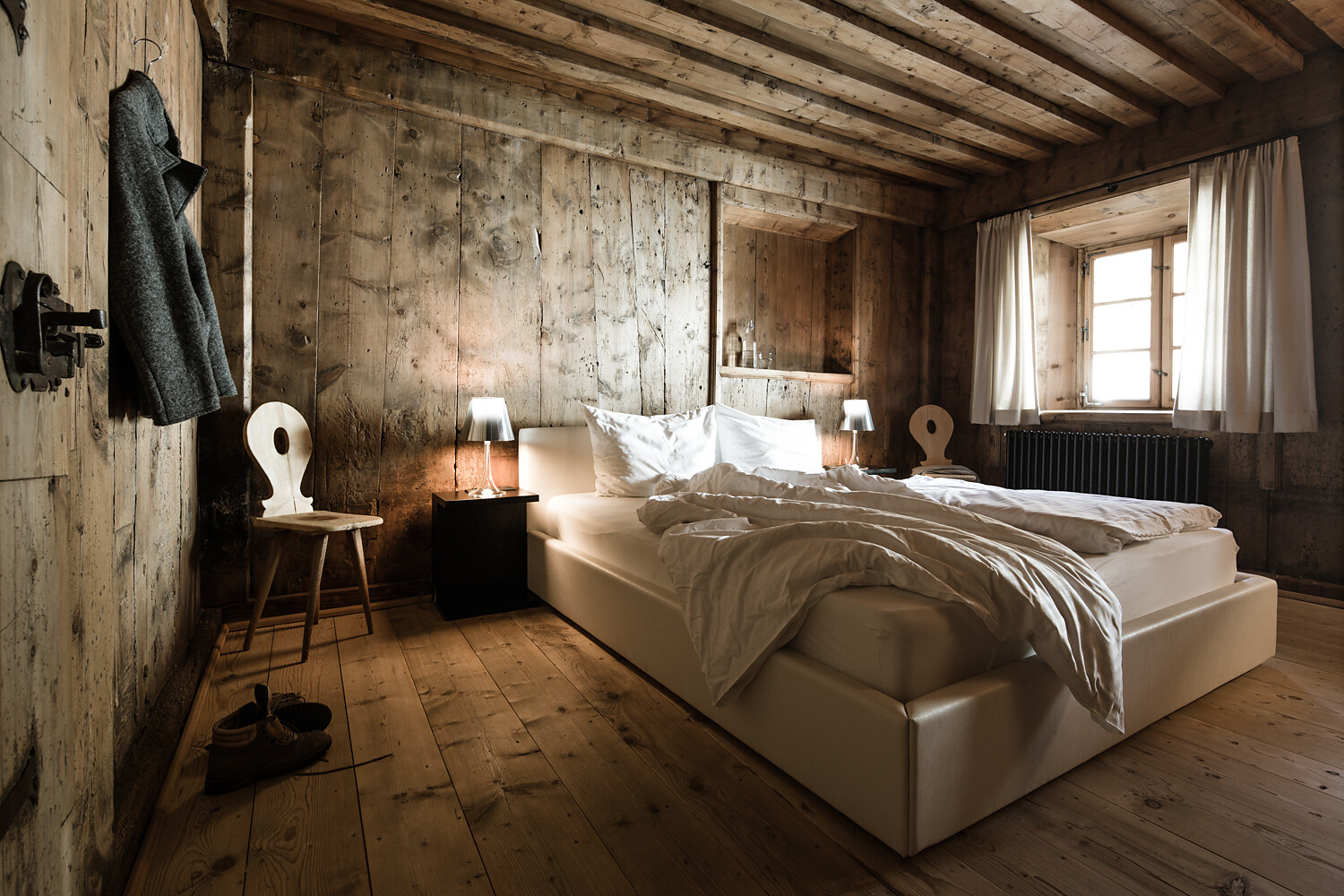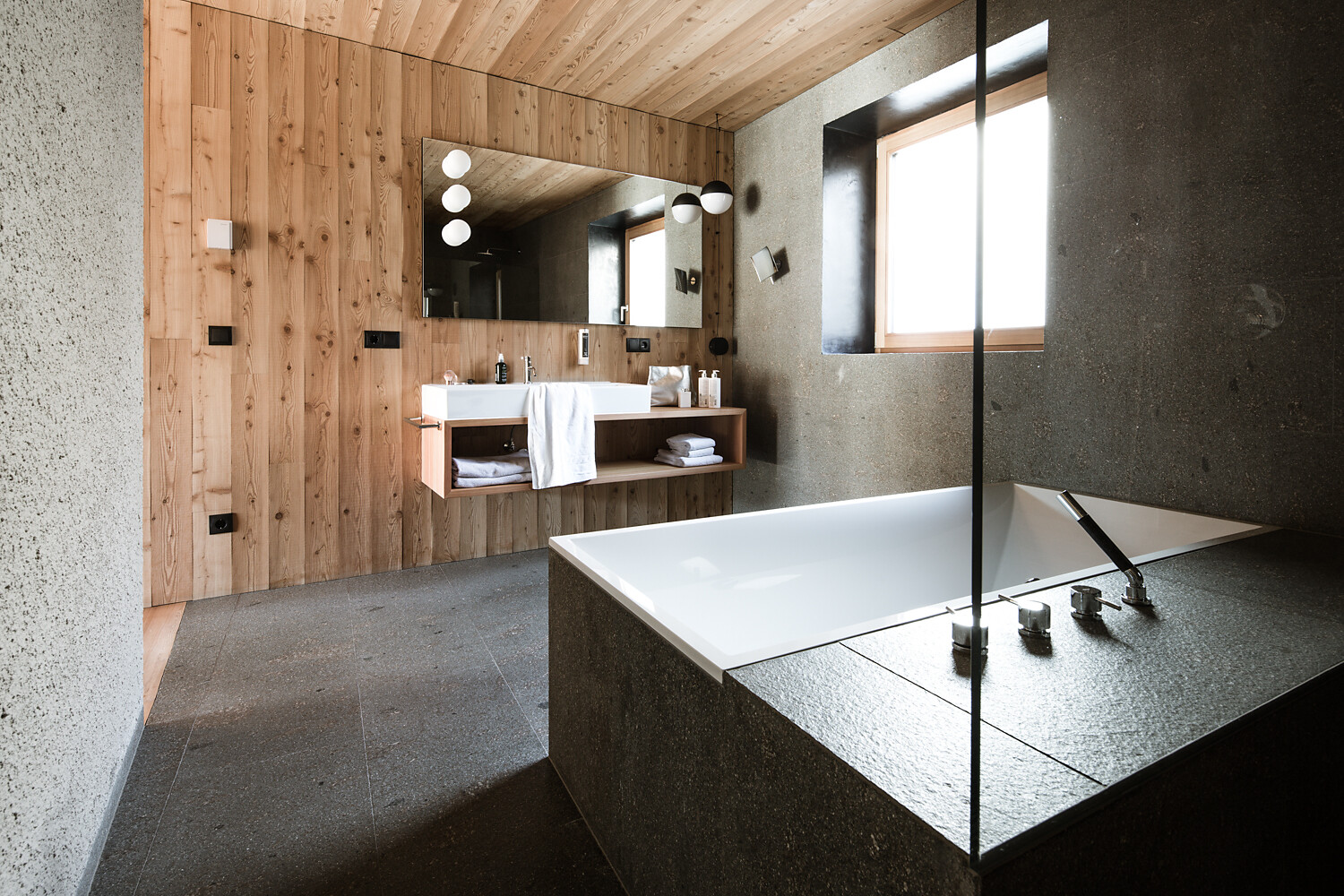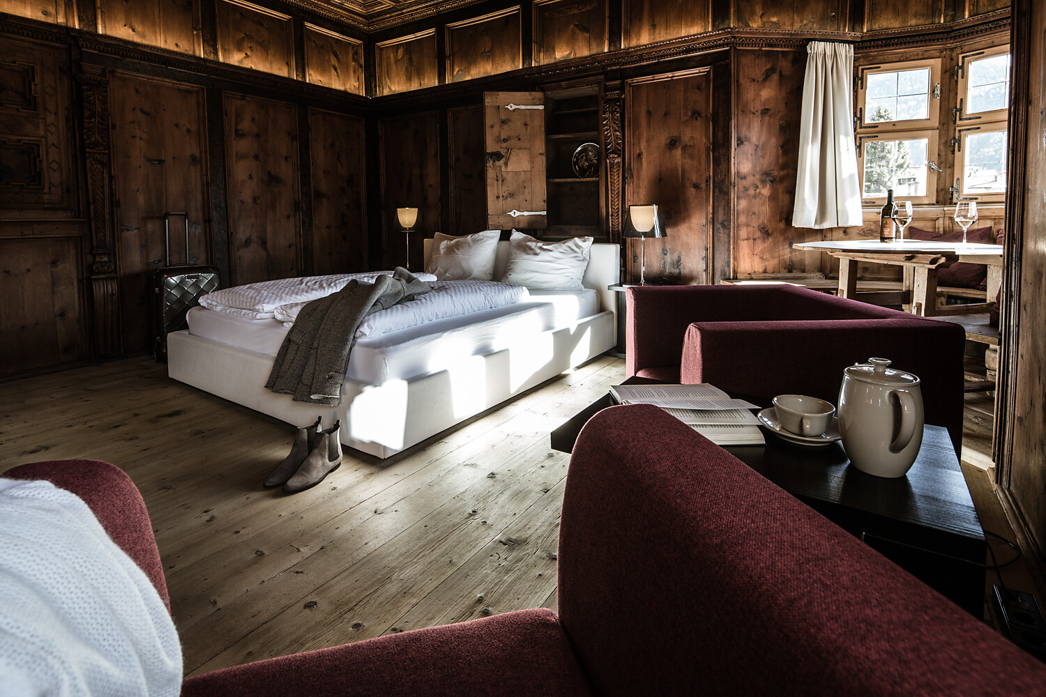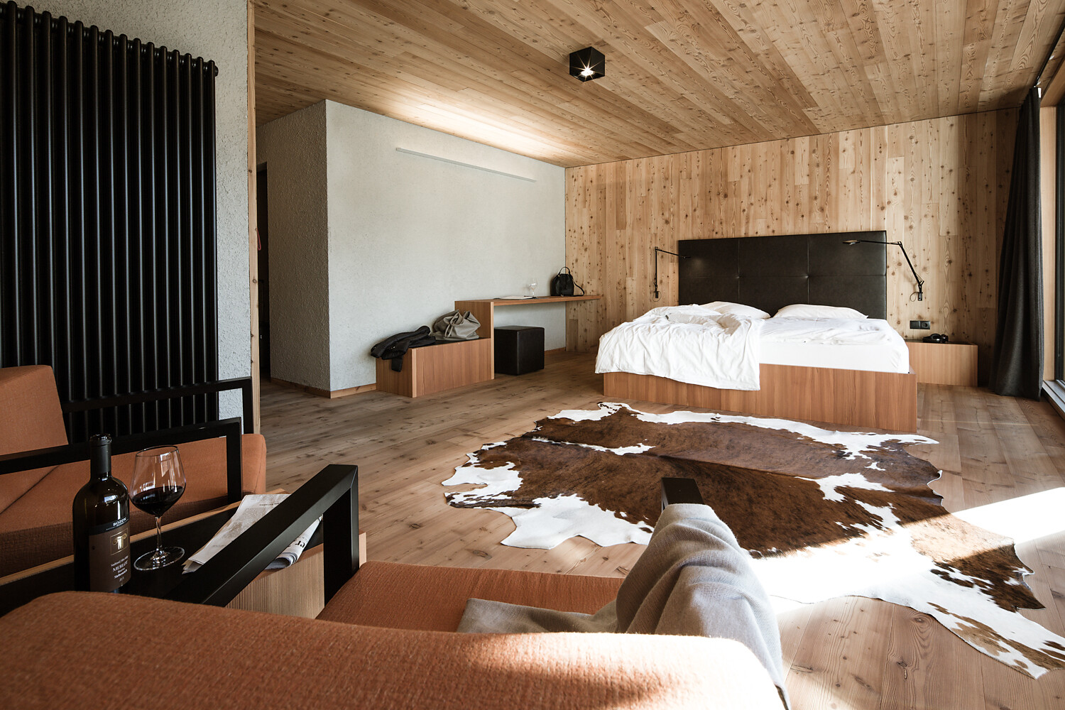 Wohlfühl-Suite für 2 Personen im edlen „alpine Style“, mit Süd-Loggia und Blick zum idyllischen Dorfplatz. Ausgestattet mit natürlichem Holzdielenboden, luxuriösem Bad in Sarner Porphyr mit Dusche und/oder Badewanne, Föhn, Bidet und getrenntem WC, Sat-TV, Telefon, Safe, Minibar, Bademantel, Wellnesstasche und Slippers. Größe: ca. 48 m²