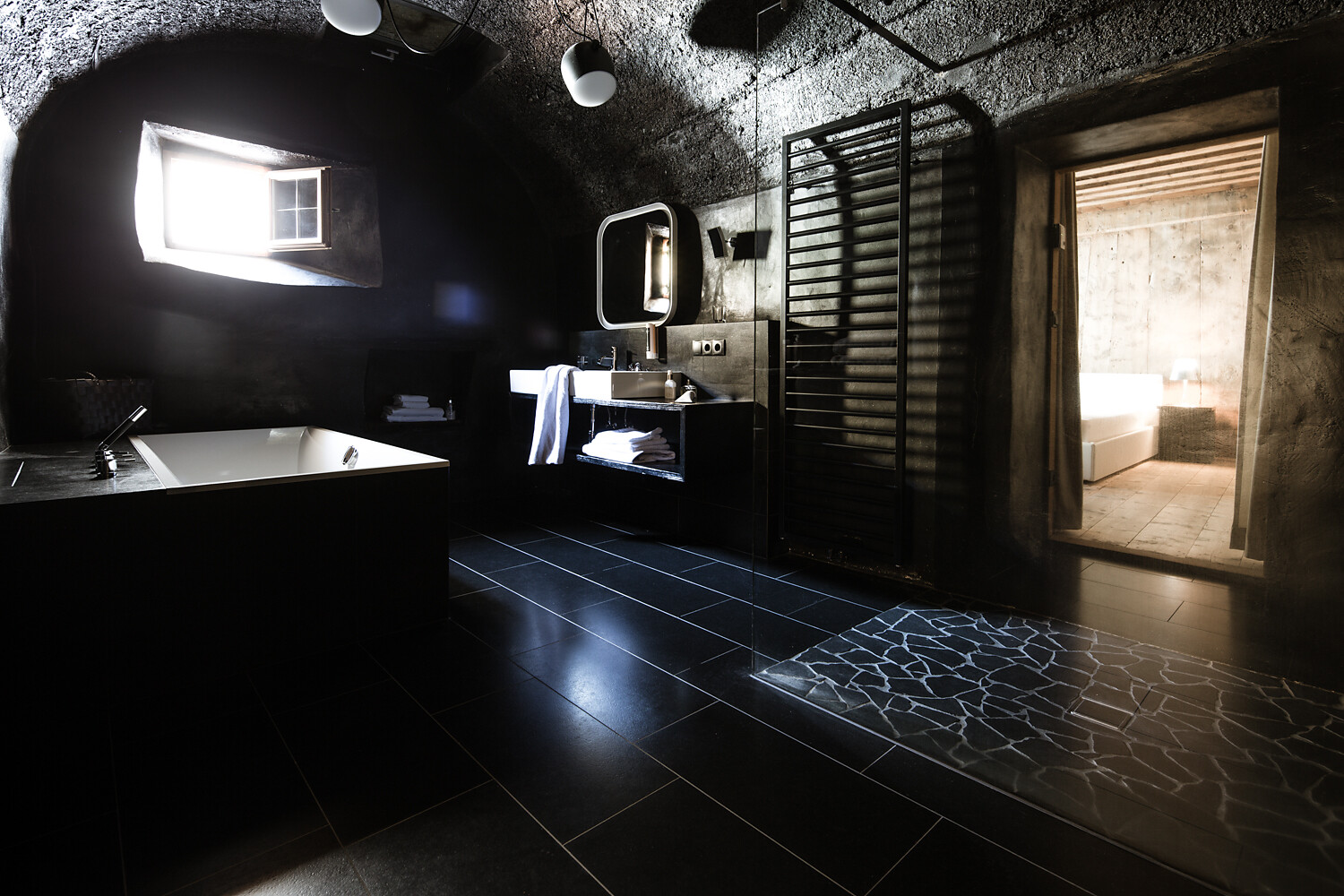 Historische Suite mit gotischem Schlafzimmer aus dem 13. Jhd., großzügiges, luxuriöses Bad mit freistehender Badewanne und Dusche, separates WC, SAT-TV, Telefon, Safe, Minibar, Bademantel, Wellnesstasche und Slippers. Größe 50m²