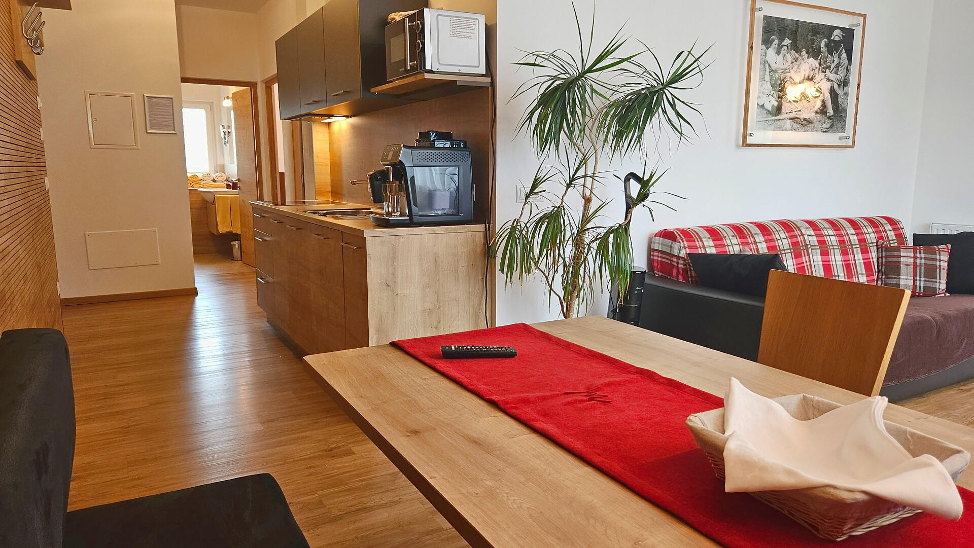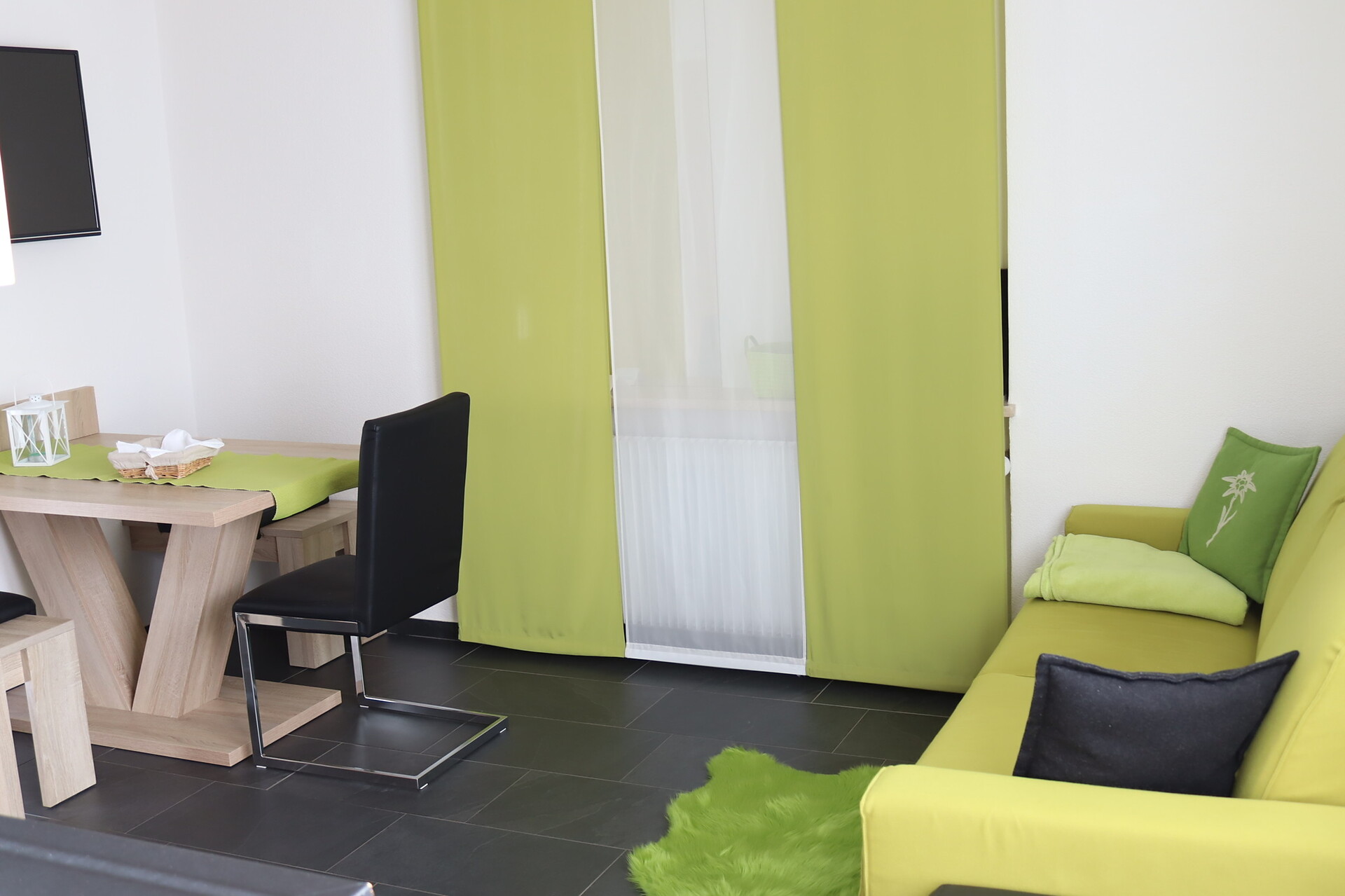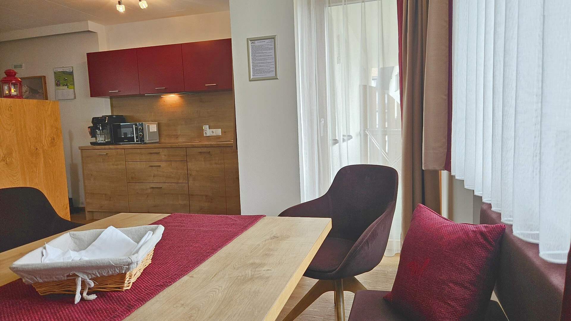 Die Ferienwohnung bietet ein gemütliches Ambiente für entspannte Tage und erinnert an das einzigartige Bergerlebnis "dinner on top" auf der Seebodenspitze.