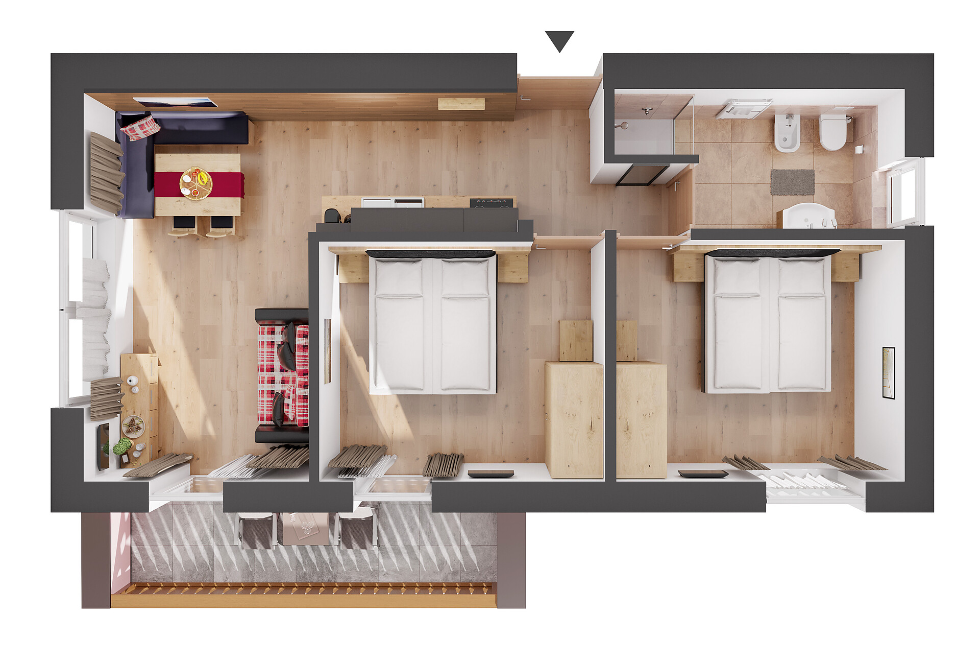 Die Wohnung Waldfest ist eine Wohnung mit großer Wohnküche mit Sofa, 2 Schafzimmer, einer Dusche mit WC und Balkon in Richtung Süd-Osten.