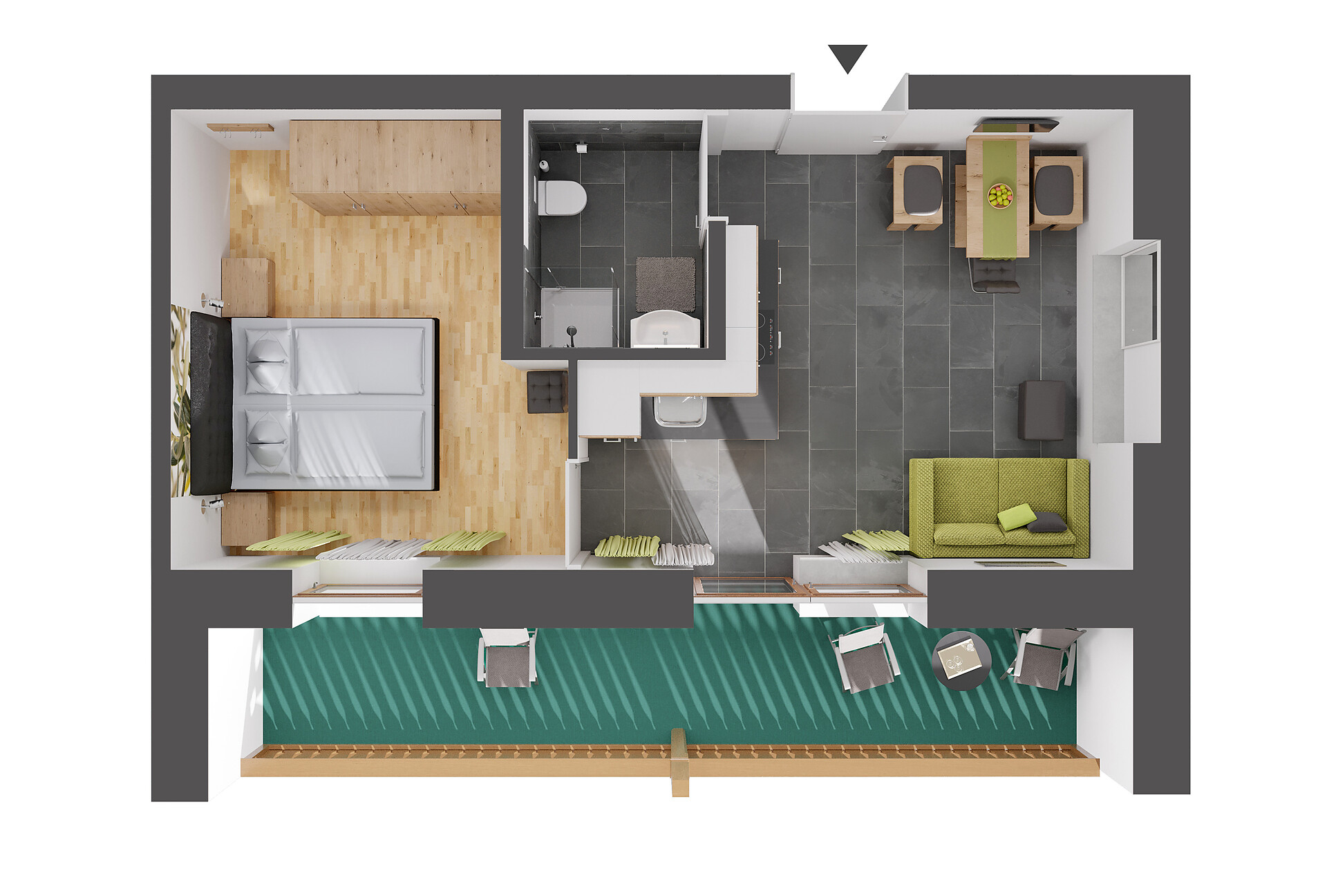 Dinner on top ist eine Ferienwohnung mit Schlafzimmer, Dusche/WC und Wohnküche mit Schlafcouch. Der große Balkon der Wohnung ist nach Süden ausgerichtet.