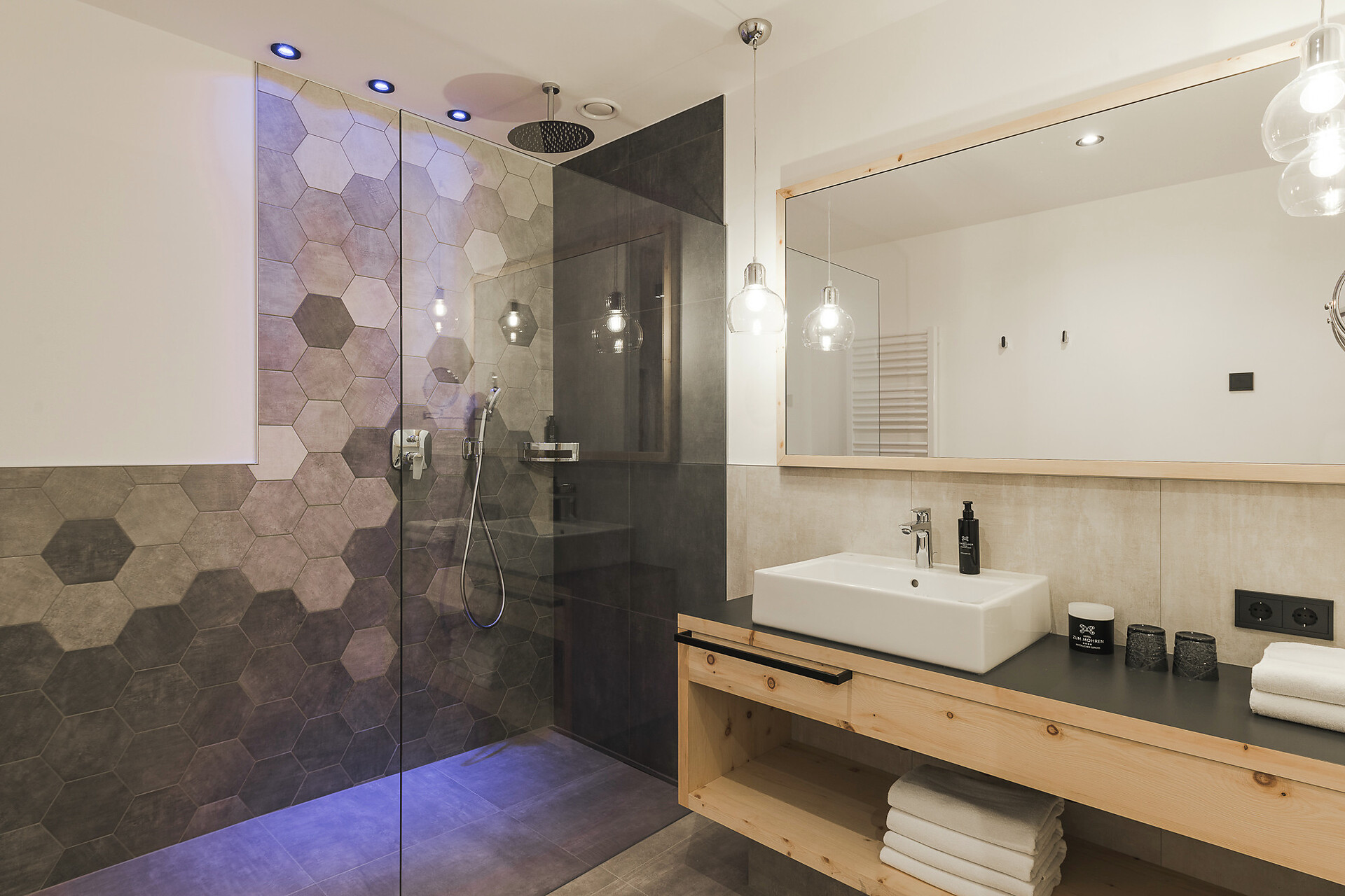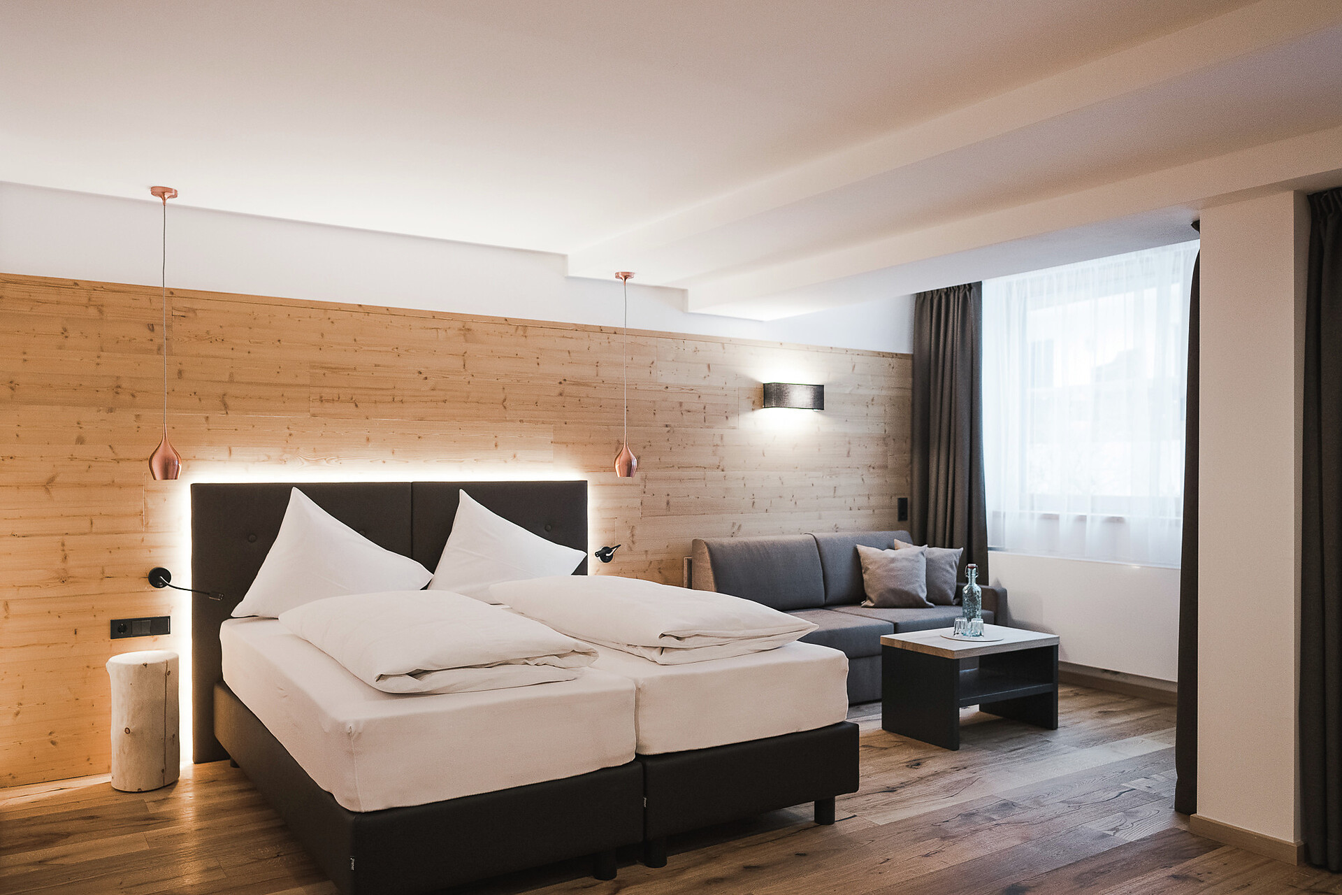 36m² Raum für Erholung mit Boxspringbett für mehr Schlafkomfort, eingerichtet mit hochwertigem Fichtenholz oder Zirbelkiefer aus der Region und Eichenholzboden. Der Relaxbereich mit Kuschelecke, Couch und Sat-TV, sowie der Balkon Richtung Norden laden zum Verweilen ein. Badezimmer mit Dusche, WC, Bidet, Föhn & Kosmetikspiegel
