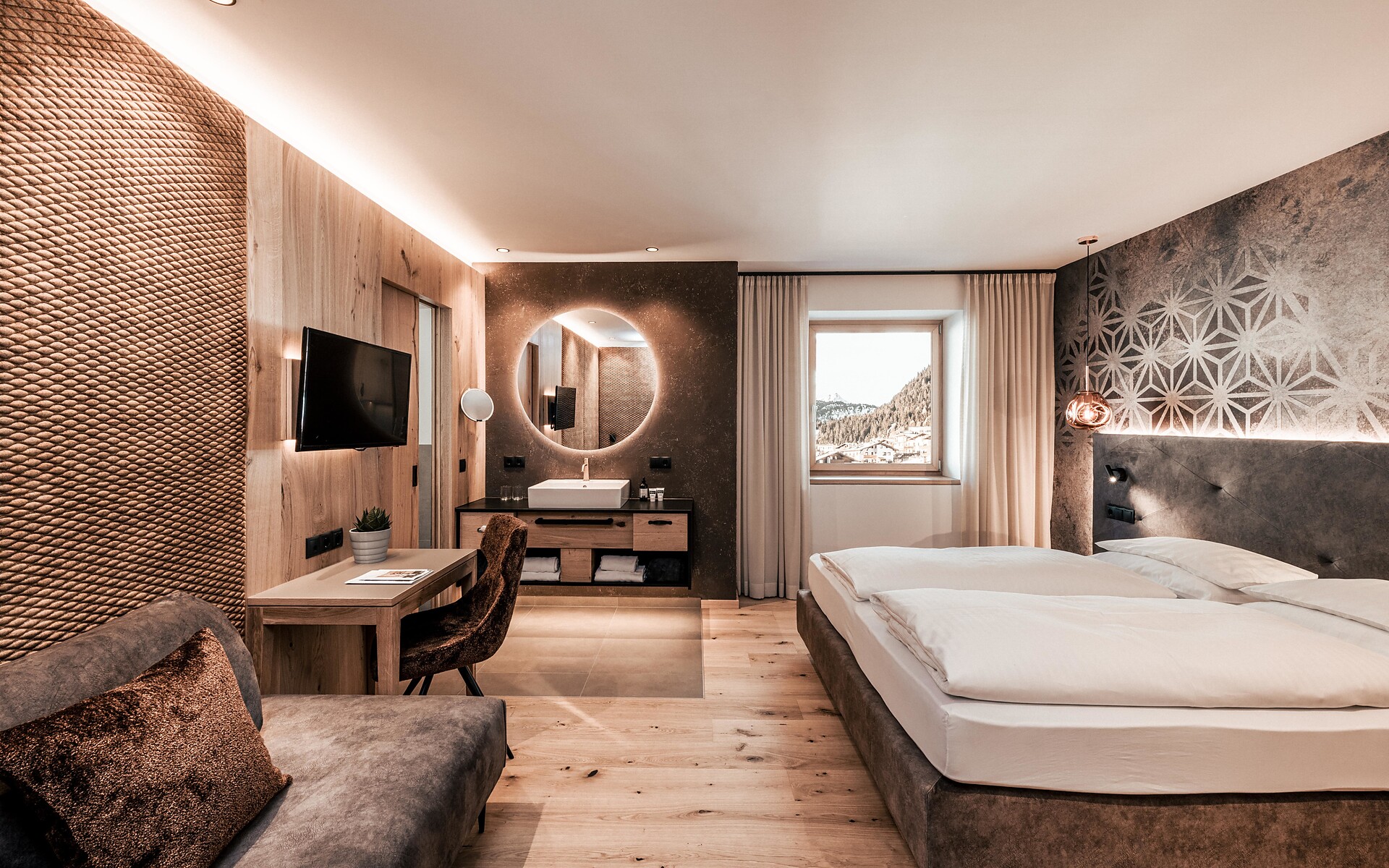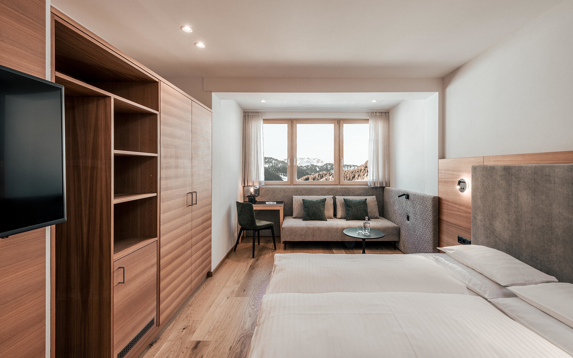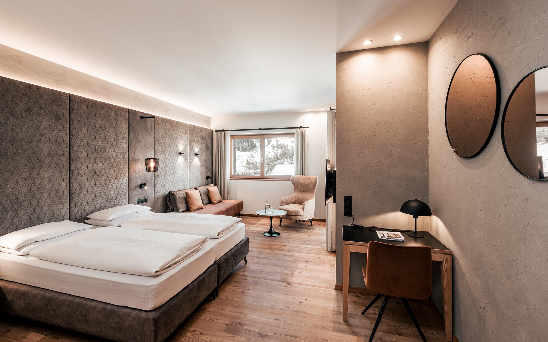 Dieses geräumige, doppelstöckige Familienzimmer besteht aus einem Doppelbett sowie aus einem gemütlichen Wohnbereich mit Sitzecke, Sat-TV, Radio, Telefon, Safe und Minibar. Das Schlafzimmer mit einem zweiten Doppelbett liegt eine Etage höher und ist über eine zimmerinterne Treppe zu erreichen. Das Badezimmer ist voll ausgestattet mit Doppelwaschbecken, Badewanne, Dusche, WC, Bidet, Haartrockner und Kosmetikspiegel.