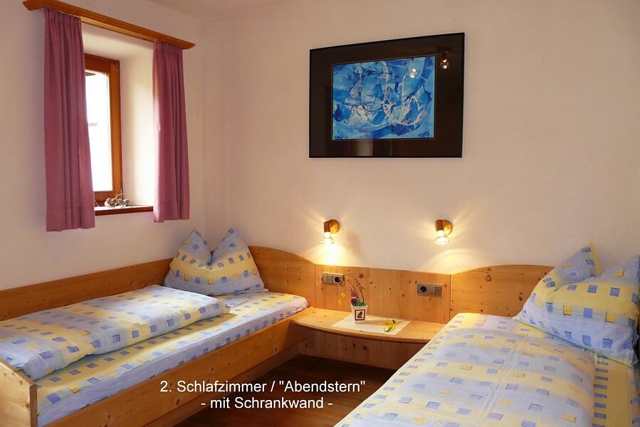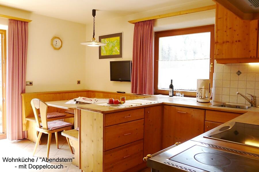 Die Ferienwohnung „Abendstern“ ist mit ihren 2 Schlafzimmern auf 4 Personen zugeschnitten. Eine Doppelcouch in der Wohnstube macht aber auch die Unterbringung bis zu 5 Personen möglich. – Eine Besonderheit dieser Ferienwohnung: ein Herd wie zu Omas Zeiten, der urige Gemütlichkeit vermittelt.