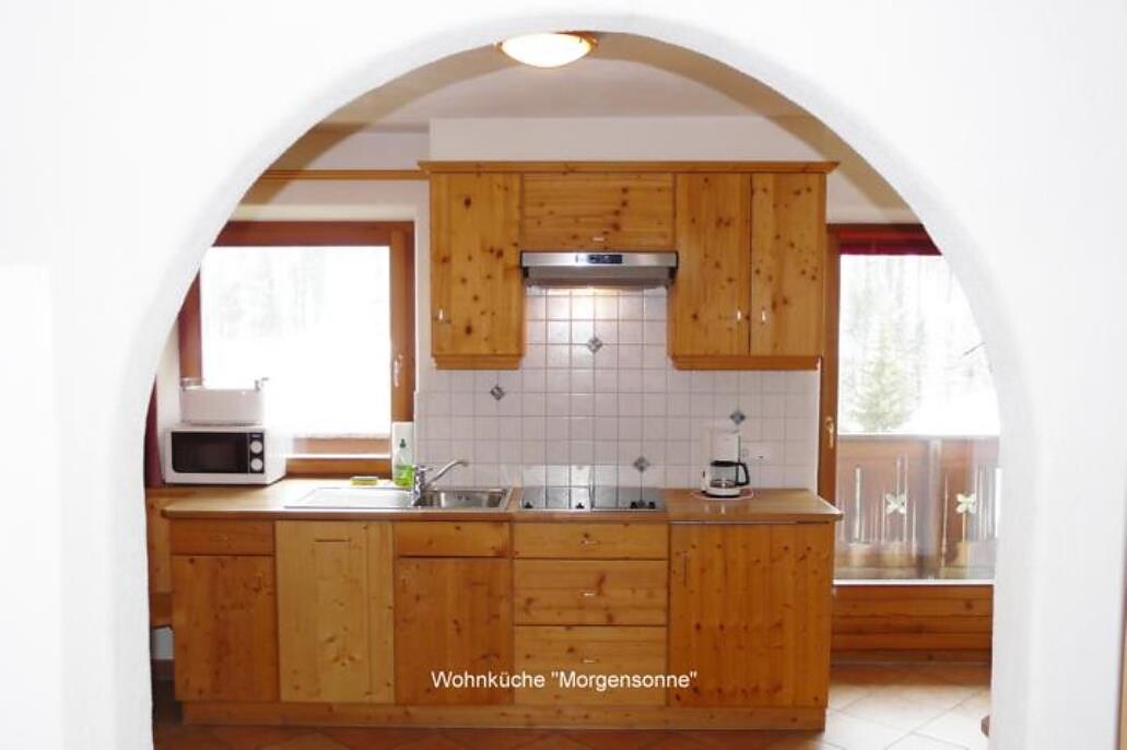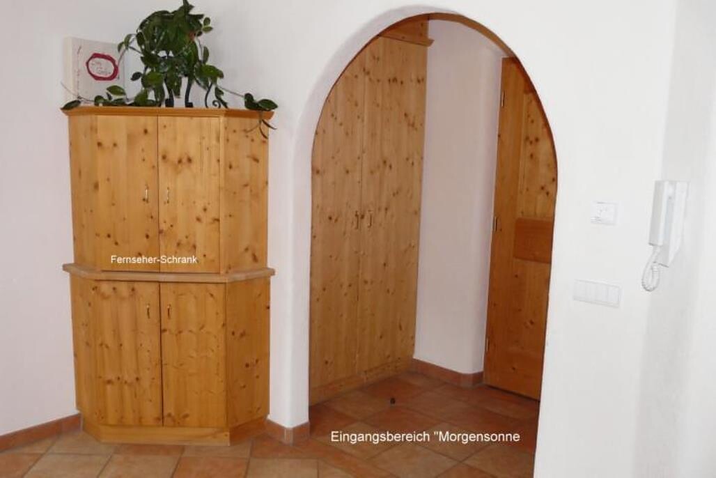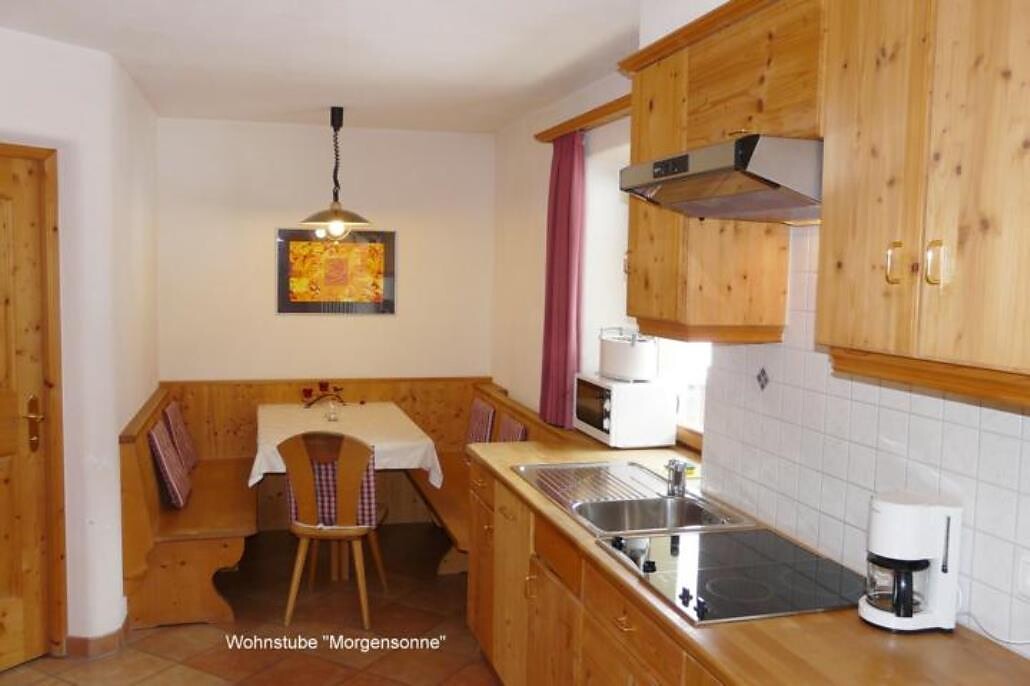 Wenn Sie in dieser Ferienwohnung nach erholsamem Schlaf aus den Augen blinzeln, strahlt die Morgensonne Sie schon an. Bereits die ersten Sonnenstrahlen erfassen den langen Süd-Balkon vor der Wohnküche und dem Schlafzimmer – geradezu eine Einladung zu einem Frühstück dort in Bergluft, mit Panoramablick und dem Flair von Urlaub auf dem Bauernhof.
