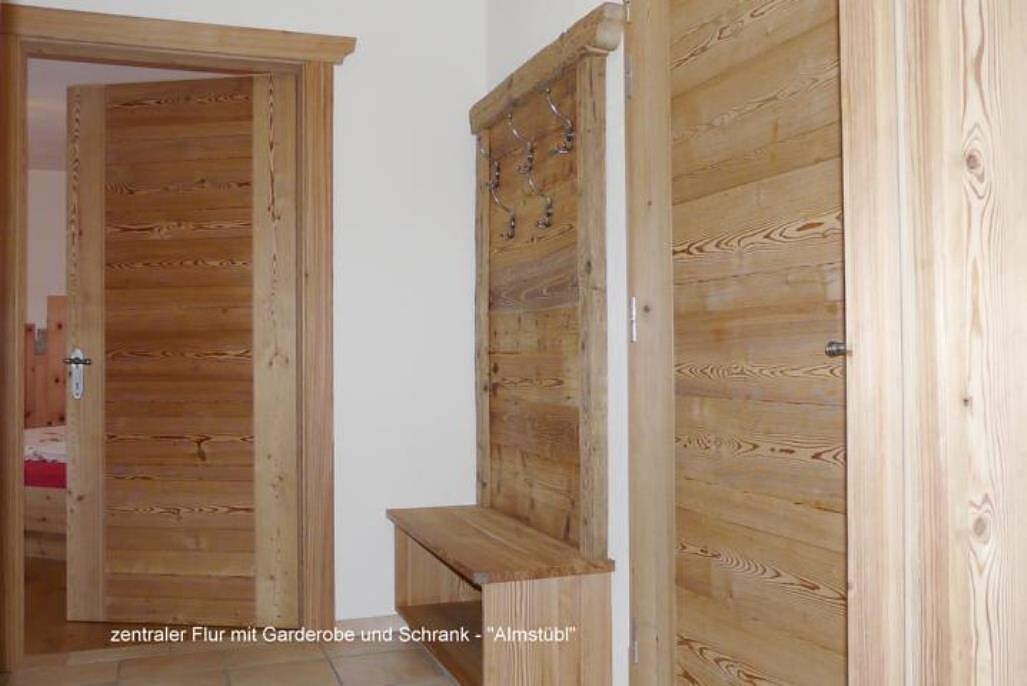 Die Ferienwohnung „Almstübl“ bietet einer Familie mit Kindern viel Platz. Die Wohnstube hat eine Größenordnung, dass auch noch eine Spielecke eingerichtet werden kann, und selbst bei ausgezogener Doppelcouch wird es noch nicht eng. Alternativ findet eine vierköpfige Familie aber auch im Schlafzimmer (mit Zustellbett) Platz, wenn die Wohnstube als solche unangetastet bleiben soll. Das Schlafzimmer hat sonst mit einer Liege (90 x 200 cm) drei feste Schlafplätze. – Platz ist auch im Bad; bei Doppelwaschbecken und Dusche muss eigentlich keiner Schlange stehen. Die Ferienwohnung liegt im Erdgeschoss und hat einen separaten, ebenerdigen Eingang. Die Spielwiese mit Rutschbahn, Klettergeräten und Trampolin liegt gleich um die Ecke.