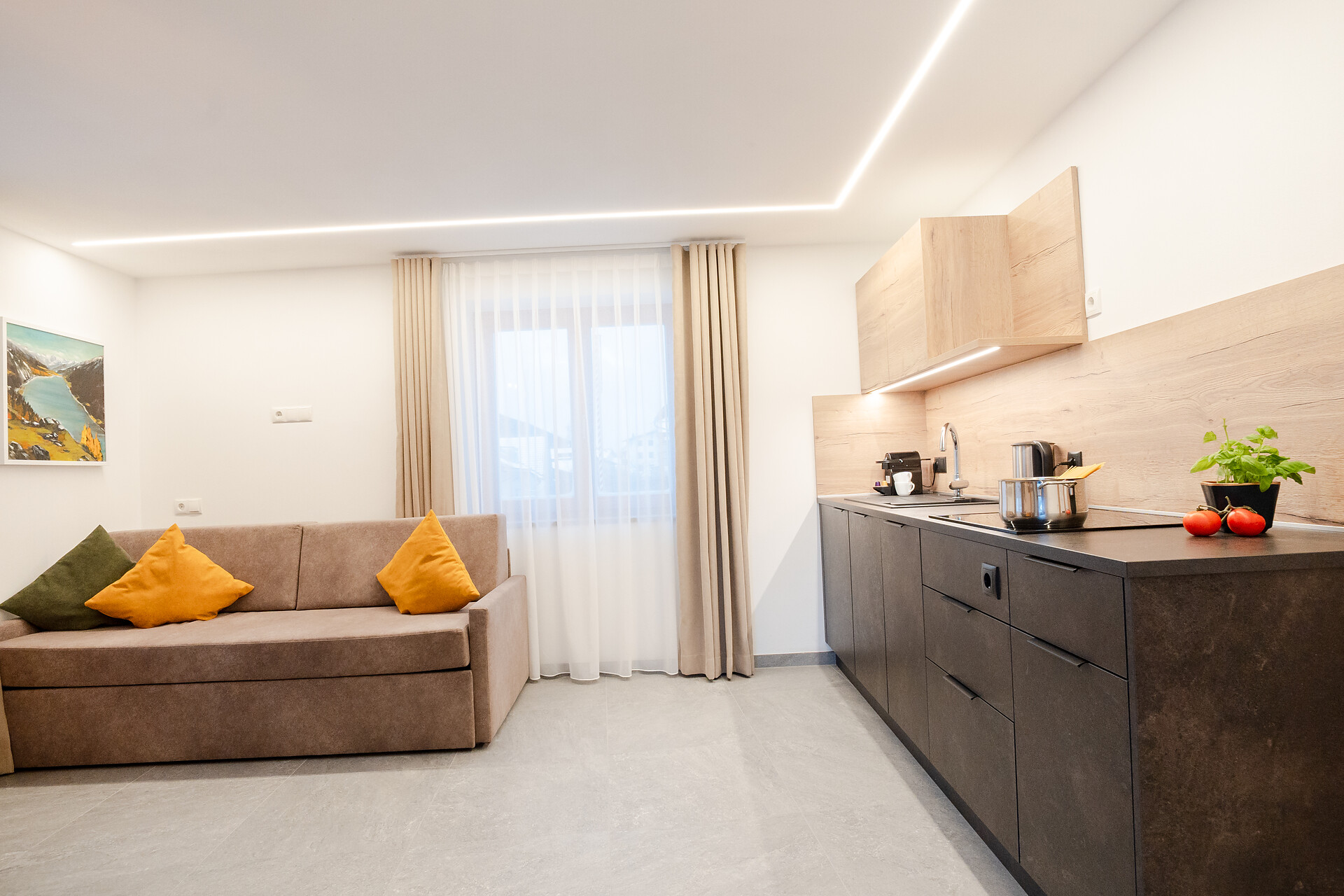 Neues, ebenerdiges Apartment mit einem Doppelzimmer mit komfortablen Boxspringbetten und SAT-TV. Der helle Wohnraum verfügt über eine gemütliche Doppelbettcouch, ebenfalls mit SAT-TV, sowie eine voll ausgestattete Kochnische.