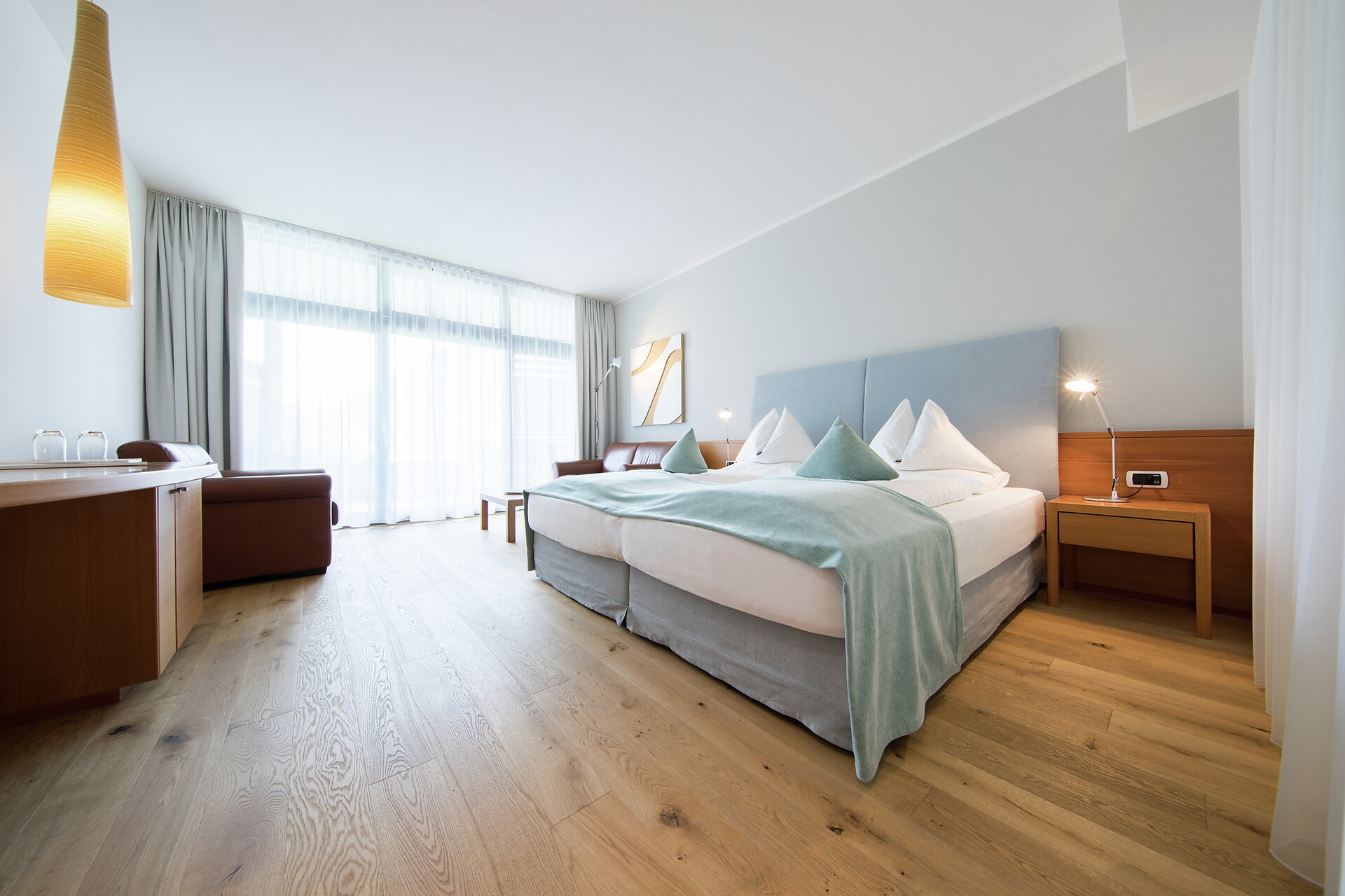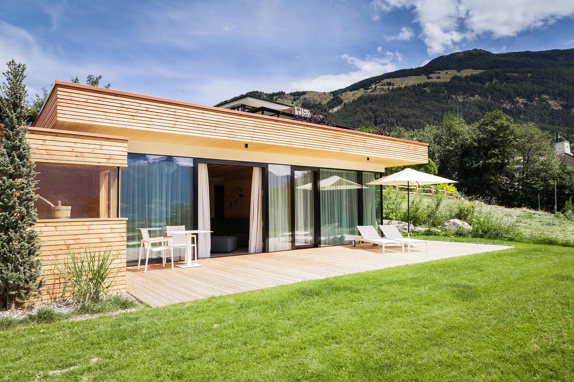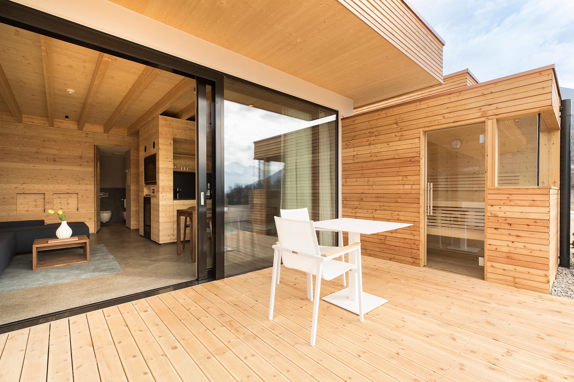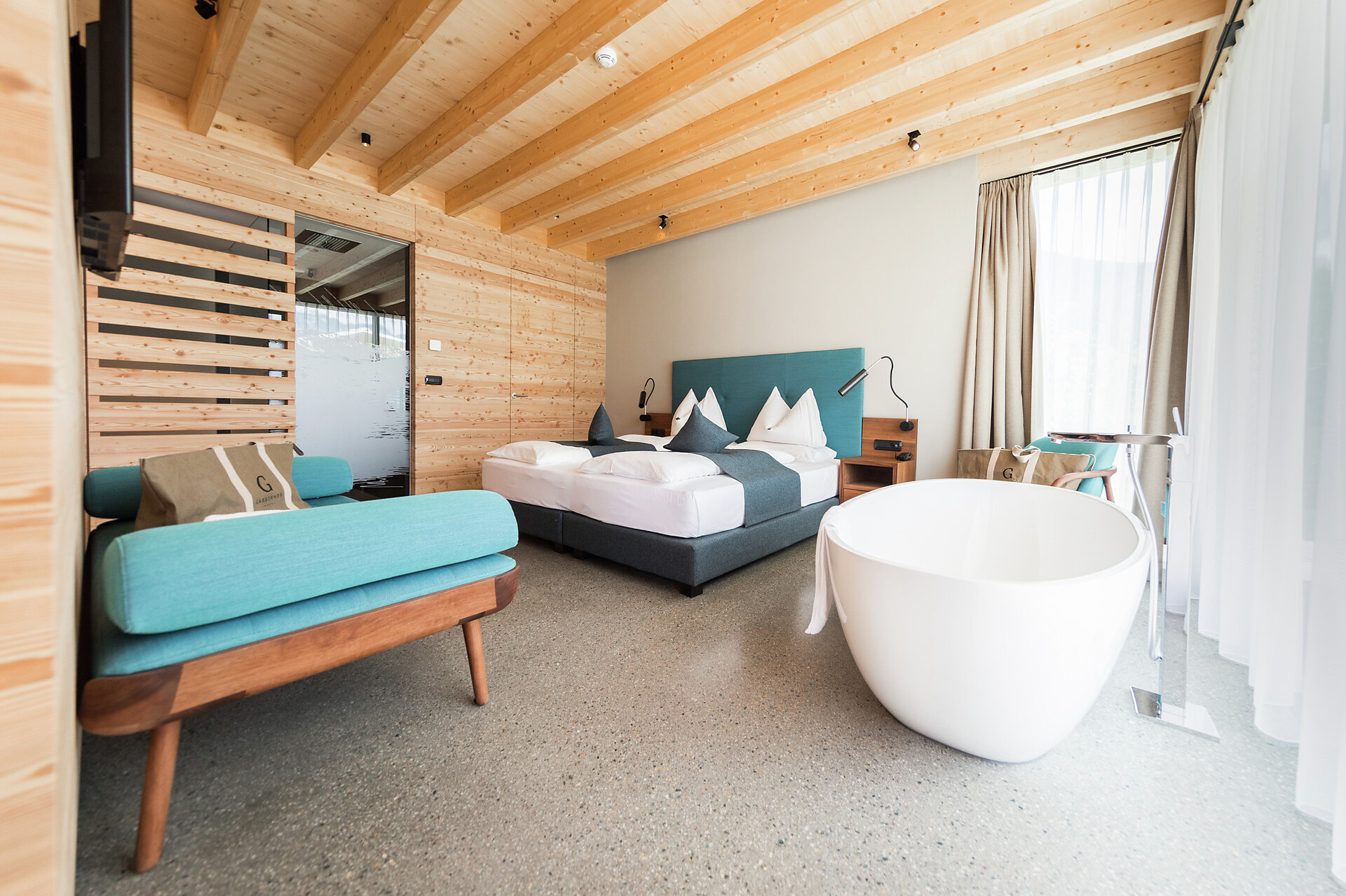 Ein besonderer Ort für besondere Urlaubsmomente – das ist die Lagunasuite. Die nach Südwesten ausgerichtete Suite verfügt über eine private Gartenterrasse und einen eigenen Steg zum Bio-Naturbadeteich im Wellnessgarten. Erfrischen Sie sich morgens bei einem Bad im Teich, staunen Sie mittags über das Lichtspiel, wenn sich die Reflexionen der kleinen Wellen im Zimmer zeigen und genießen Sie die abendlichen Sonnenstrahlen, die sich im Teich spiegeln. Im Inneren der großzügigen Räumlichkeiten erwarten Sie klare Linien und eine klassische Einrichtung, die sich durch eine Mischung aus urbanem und alpinem Stil auszeichnet. Das gut ausgestattete Bad mit Wanne sorgt für grenzenlose Entspannung. (ca. 60 m² & 30m² Gartenterrasse).