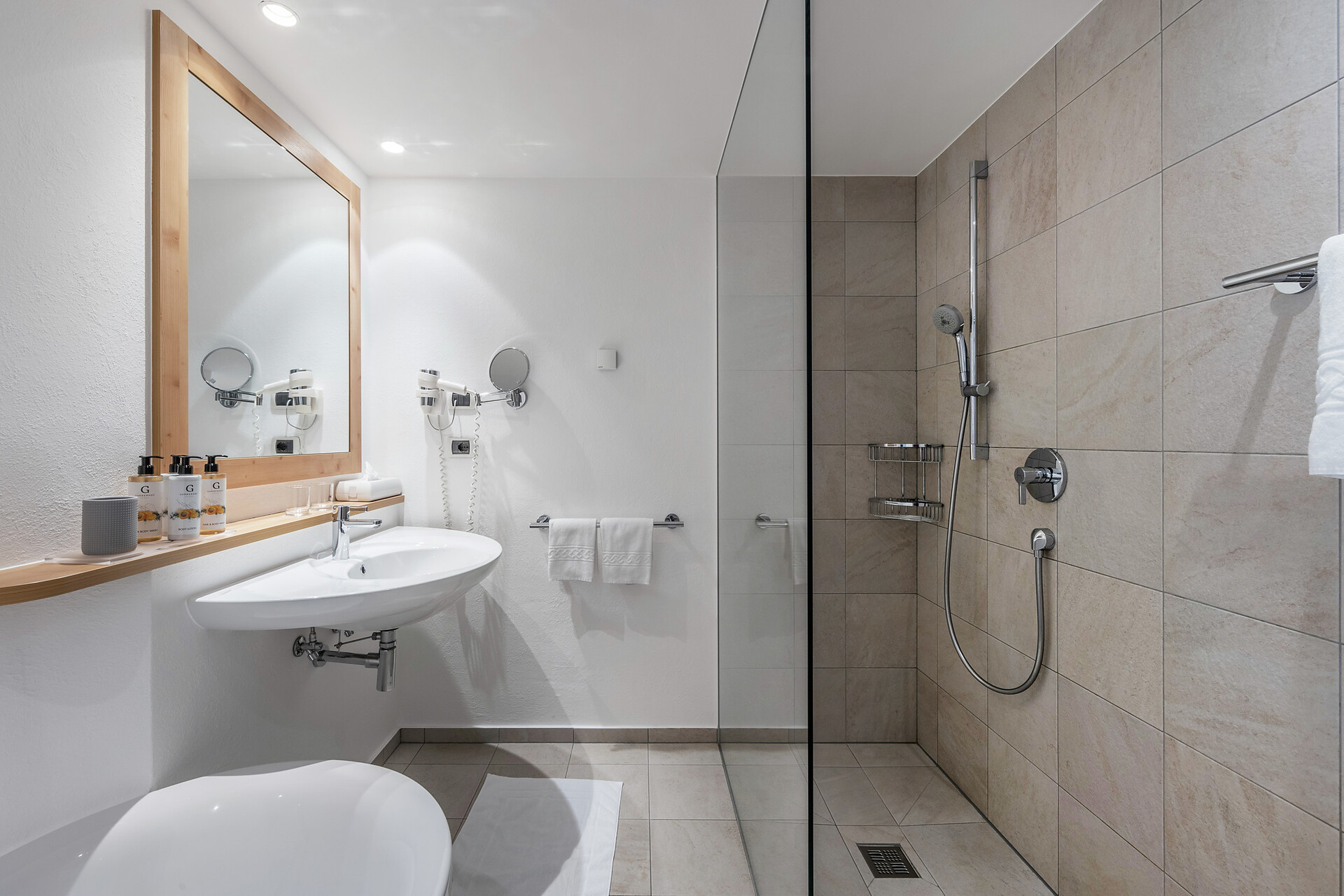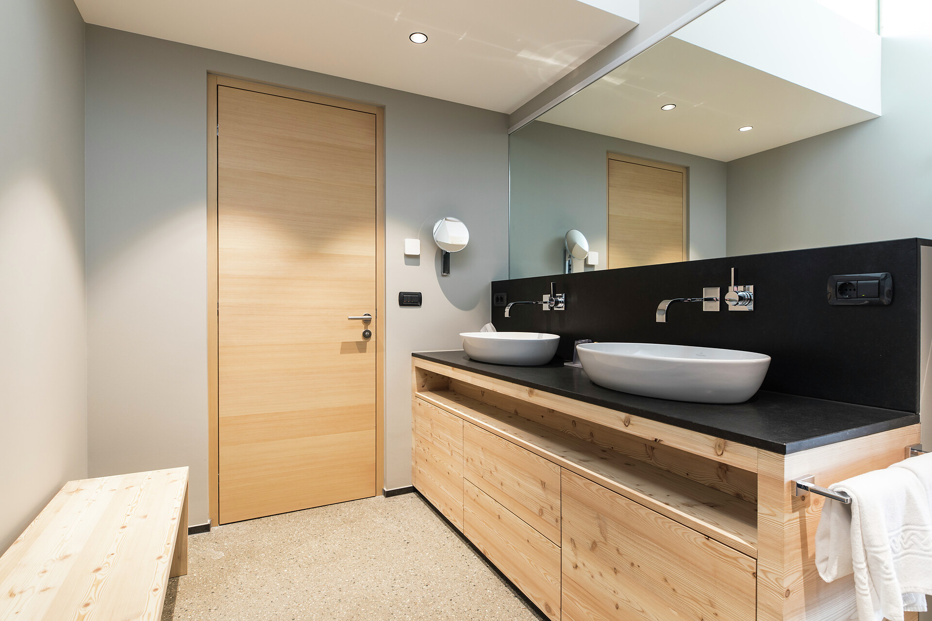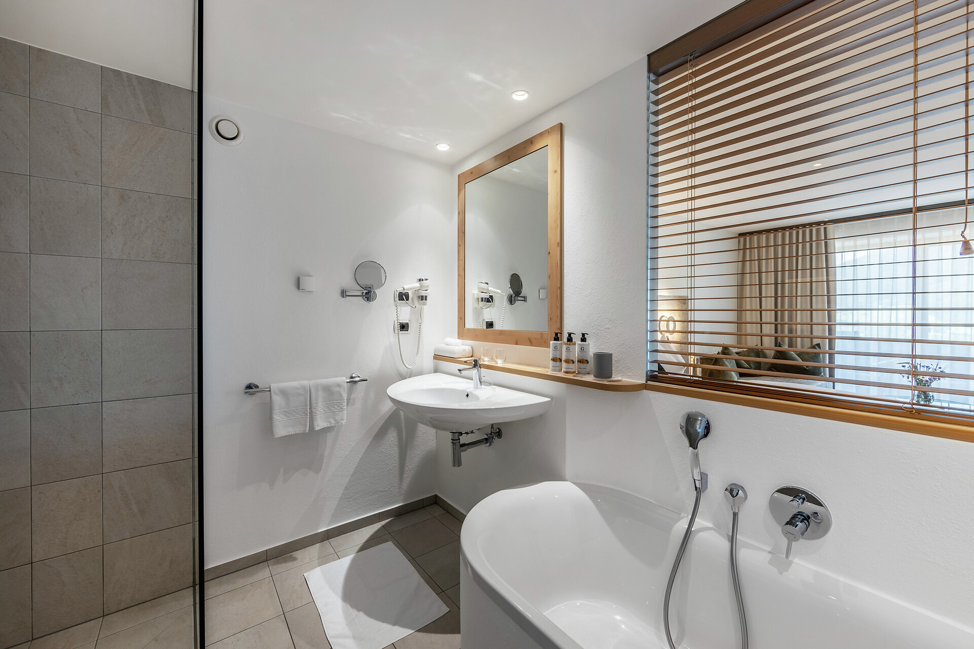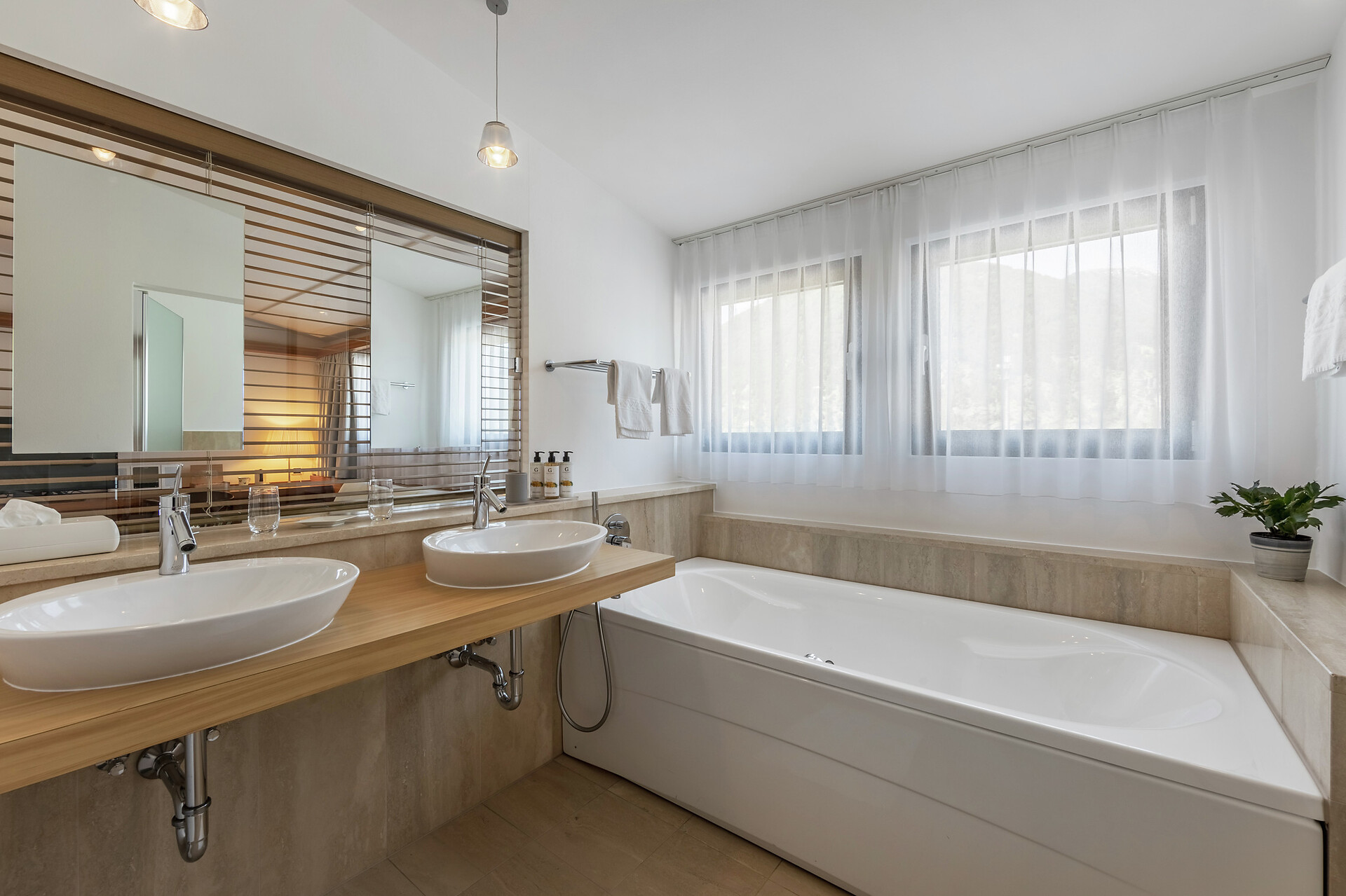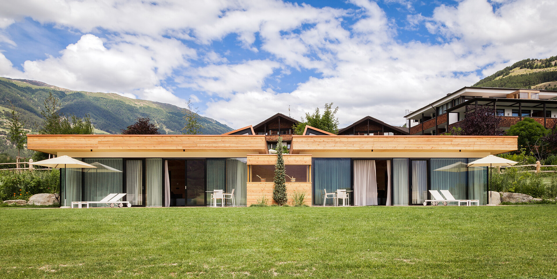Ein besonderer Ort für besondere Urlaubsmomente – das ist die Lagunasuite. Die nach Südwesten ausgerichtete Suite verfügt über eine private Gartenterrasse und einen eigenen Steg zum Bio-Naturbadeteich im Wellnessgarten. Erfrischen Sie sich morgens bei einem Bad im Teich, staunen Sie mittags über das Lichtspiel, wenn sich die Reflexionen der kleinen Wellen im Zimmer zeigen und genießen Sie die abendlichen Sonnenstrahlen, die sich im Teich spiegeln. Im Inneren der großzügigen Räumlichkeiten erwarten Sie klare Linien und eine klassische Einrichtung, die sich durch eine Mischung aus urbanem und alpinem Stil auszeichnet. Das gut ausgestattete Bad mit Wanne sorgt für grenzenlose Entspannung. (ca. 60 m² & 30m² Gartenterrasse).