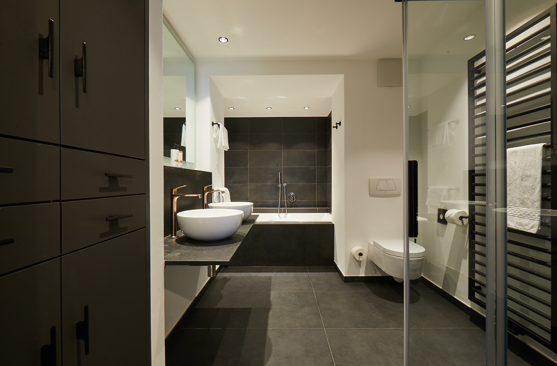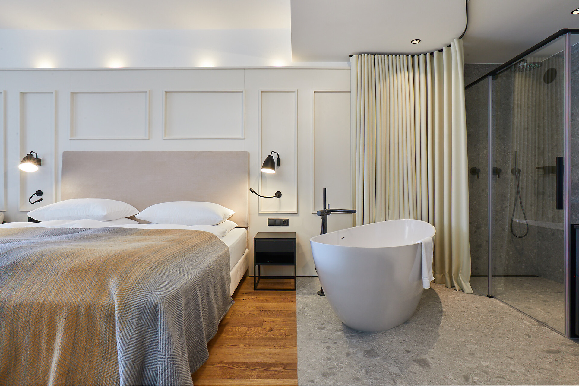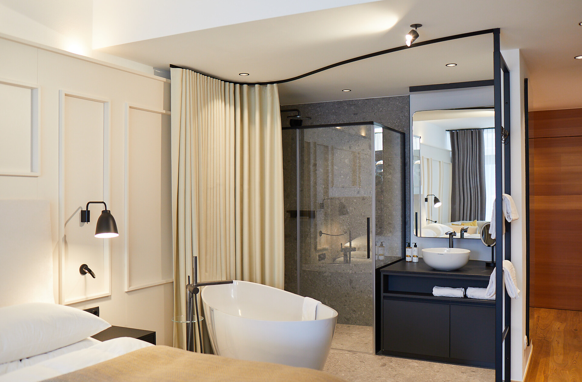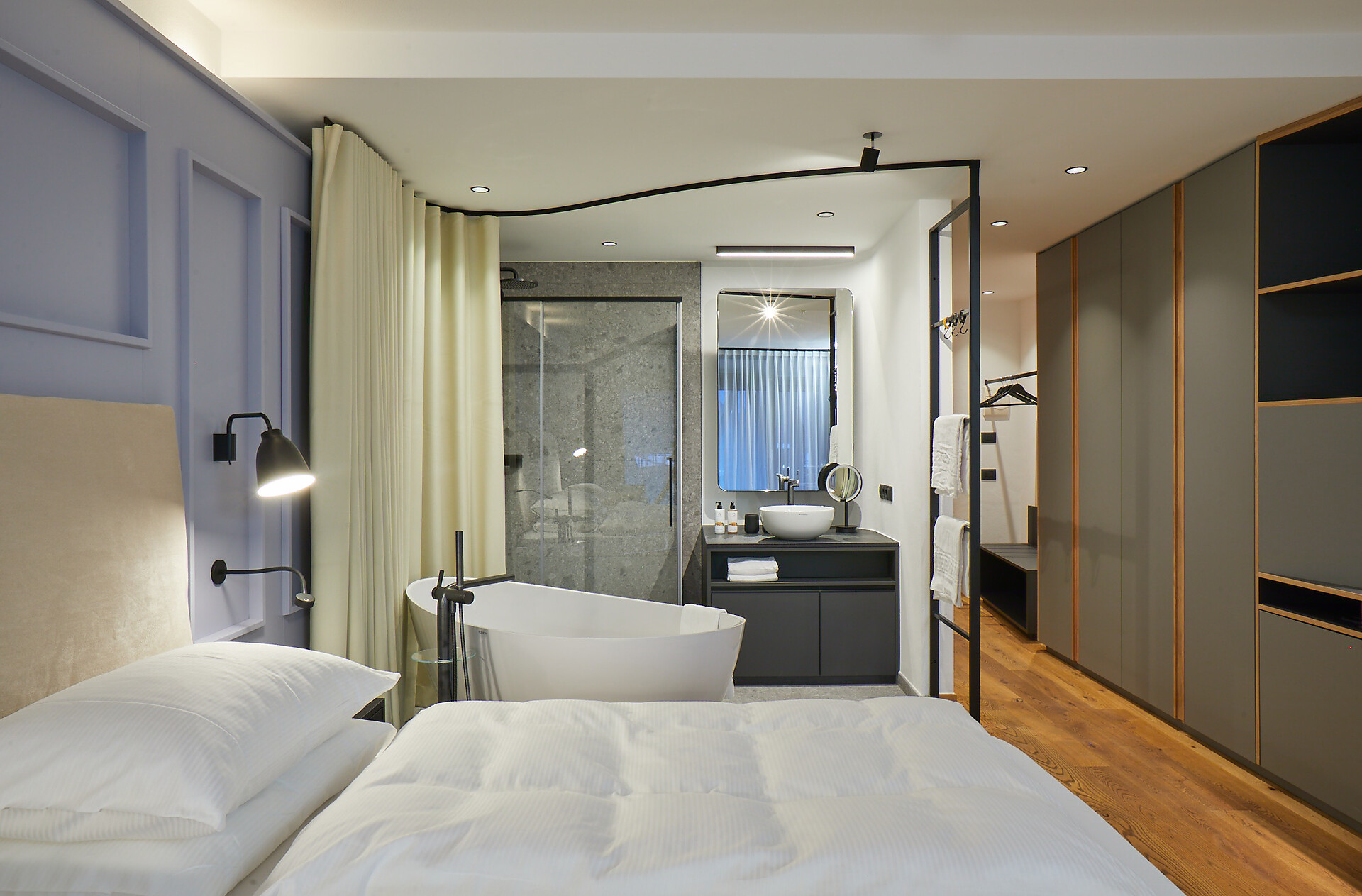 Machen Sie es sich auf dem Balkon gemütlich und genießen Sie den Blick auf den kleinen Weinberg des Garberhof. Hier können Sie aber auch unseren Garten betrachten und bis zum Dörfchen Laatsch und weiter das Münstertal mit den Schweizer Bergen entlangsehen. Die Suite ist nach Südwesten ausgerichtet und überzeugt mit ihrem Milano-Stil: Designermöbel, veredelte Materialien und Annehmlichkeiten mit urbanem Flair. Dunkle, elegante Stahlelemente bilden einen harmonischen Kontrast zu den hellen Stoffen und Eichenholzböden. Ein weiterer Blickfang: die freistehende Badewanne im Schlafbereich und das verglaste Badezimmer. (ca. 40 m² & 10 m² Balkon)