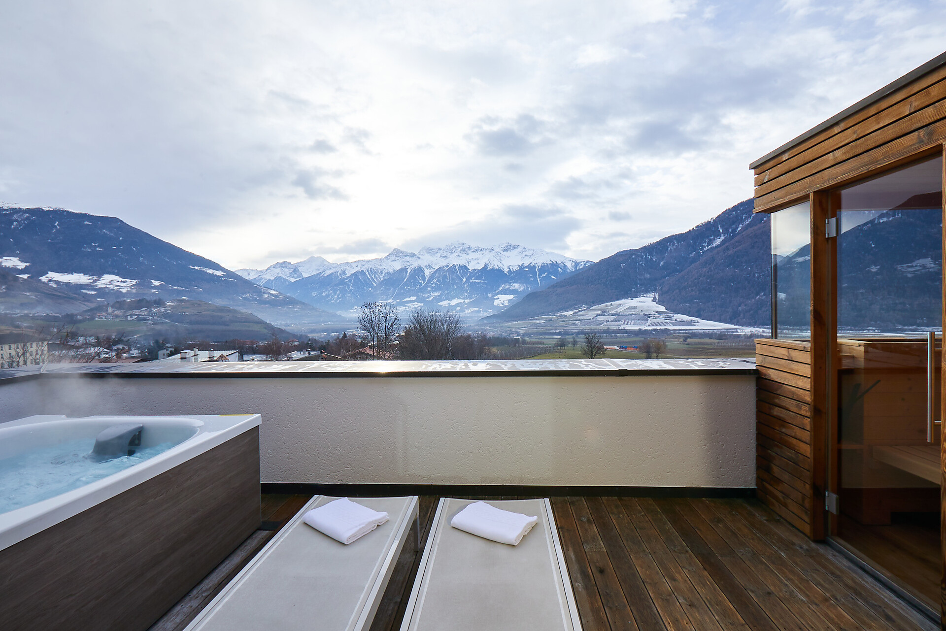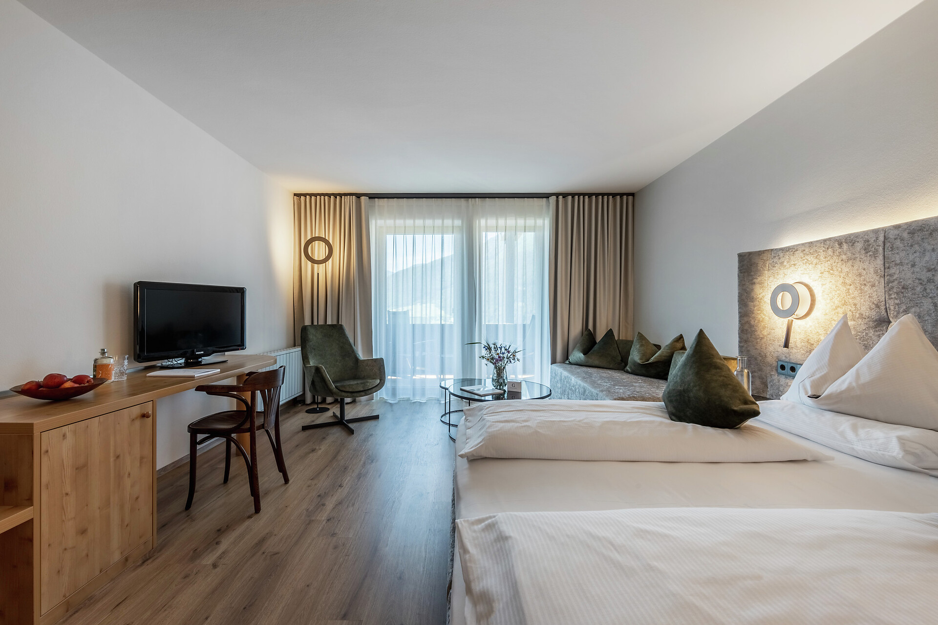 Die helle Venustas Superior Suite mit schlichter Einrichtung überzeugt mit einem Panoramablick auf die Berge, der von Bergabenteuern träumen lässt. Nach aktiven Stunden in der Natur finden Sie in der eleganten Wohnecke im italienischen Design wohlverdiente Erholung. Auch das voll ausgestattete Badezimmer mit Wanne und Dusche lädt zum Entspannen ein, wohingegen ein getrenntes WC mit Bidet für Komfort, Privatsphäre und Wohlfühlcharakter sorgt. Machen Sie es sich auf dem geräumigen Balkon gemütlich und genießen Sie die Abendstunden im schönen Vinschgau. (ca. 40 m² & 10m² Balkon)