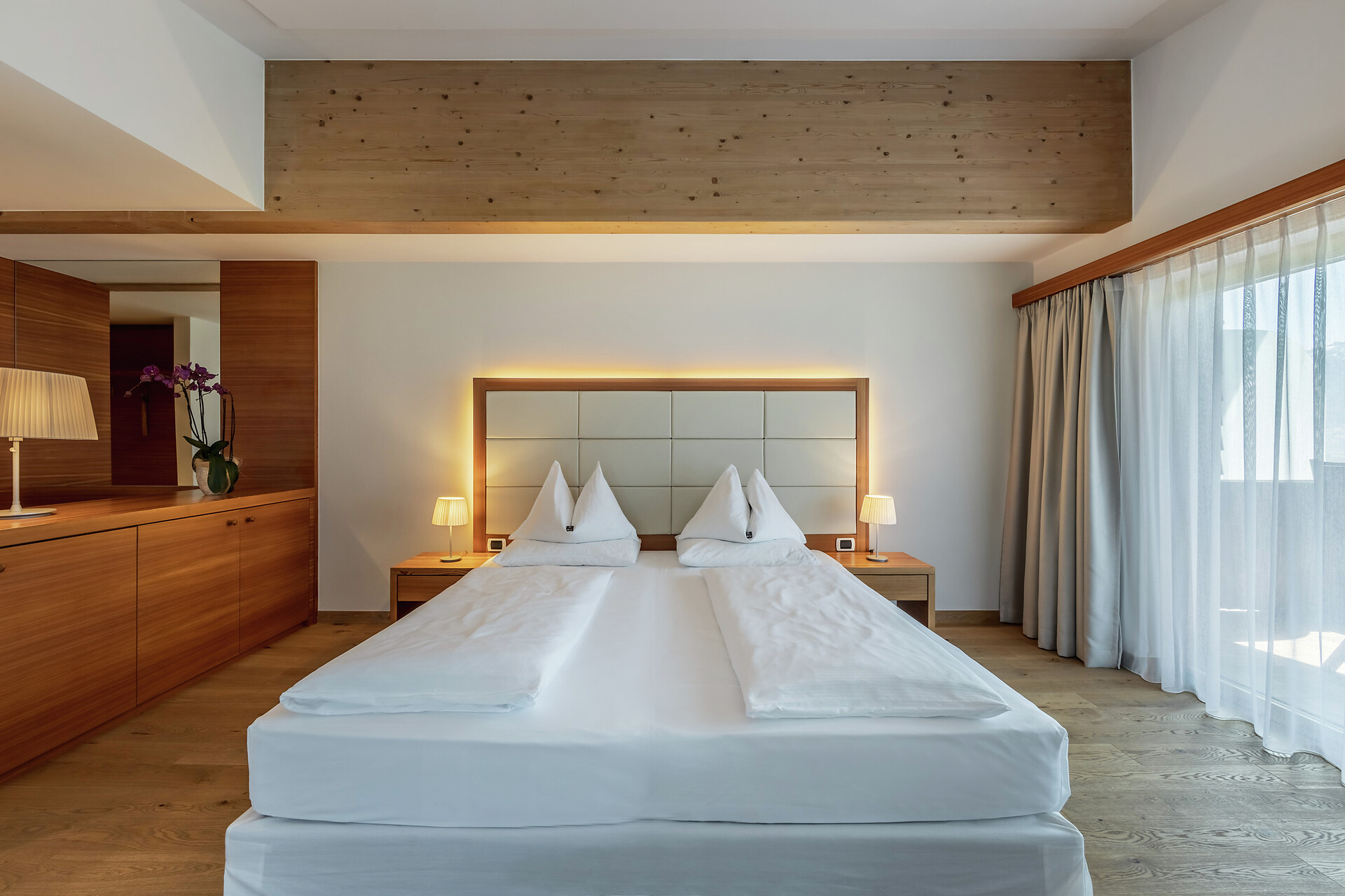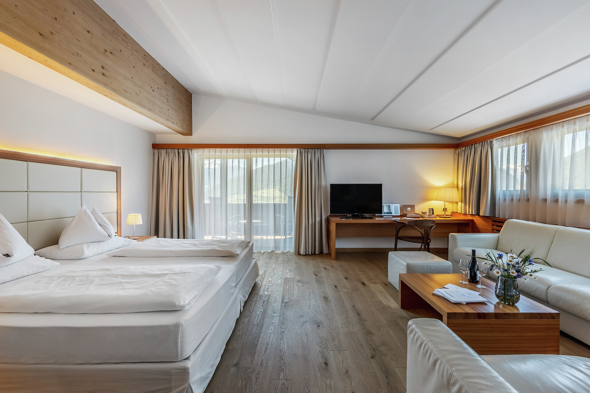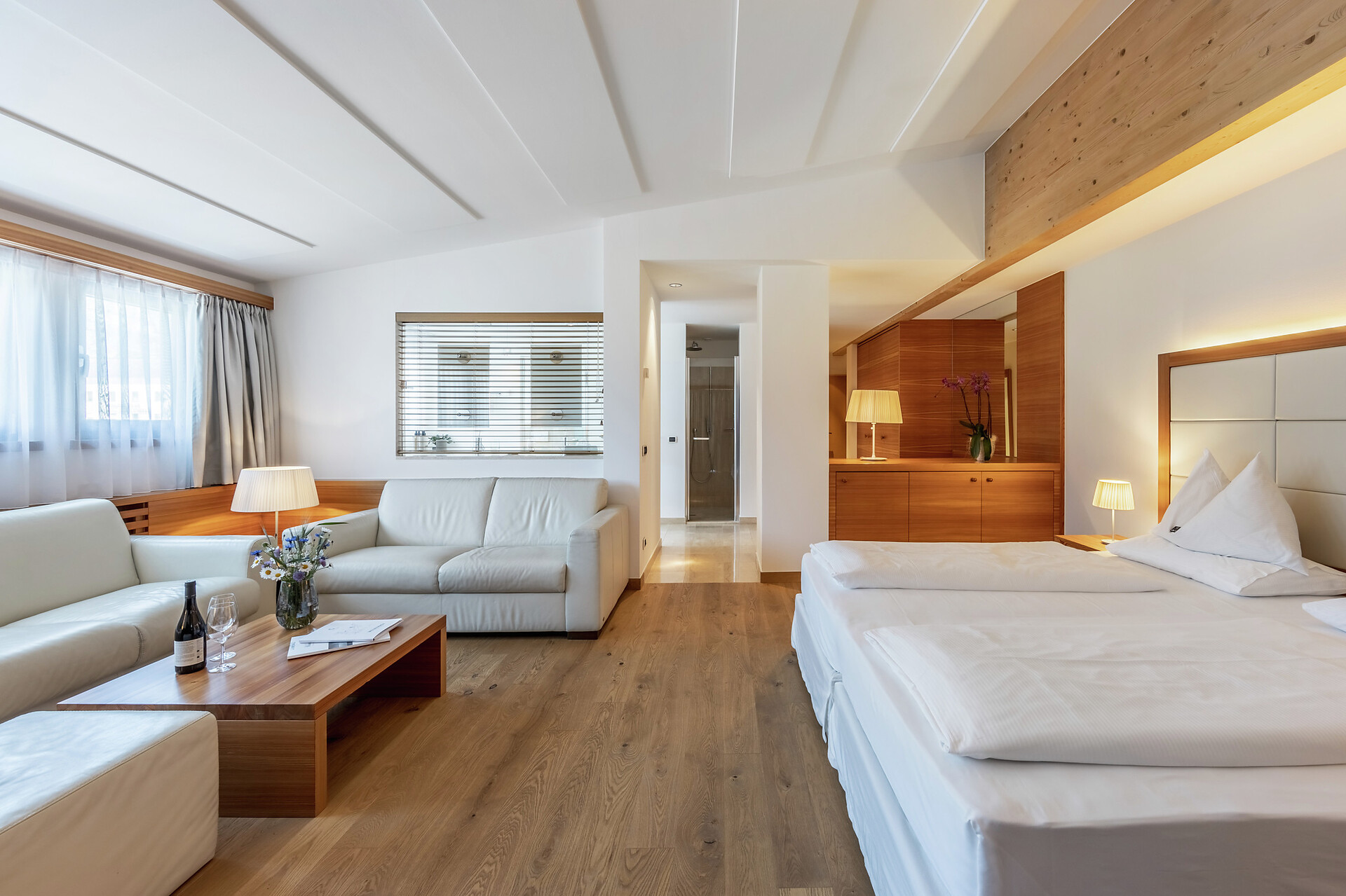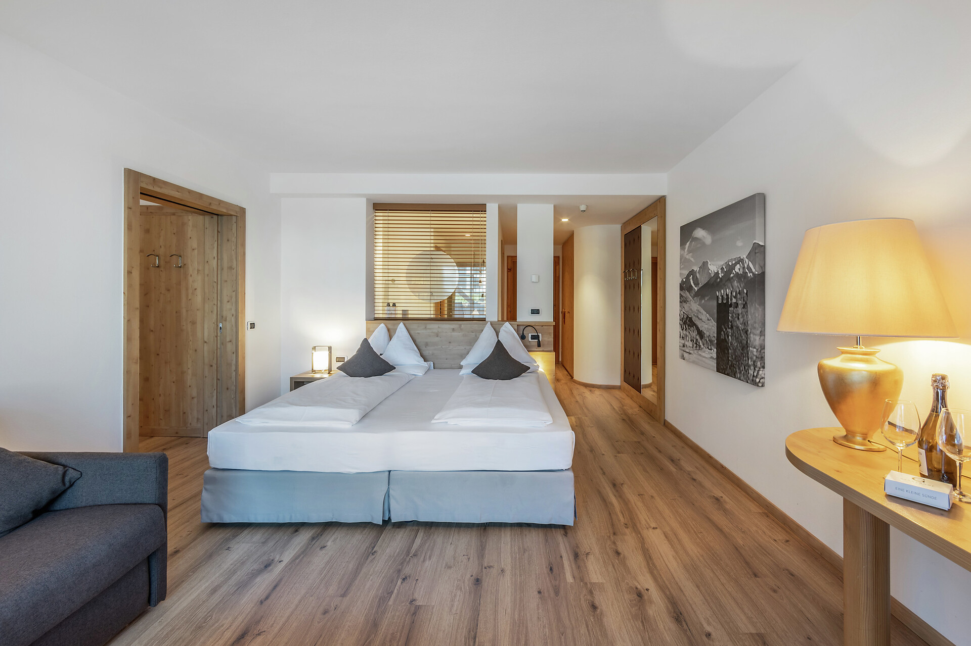Eiche und Nadelholz. Sandfarbene Töne und helles Holz. Zeitlos und lichtdurchflutet. In dieser großzügigen Suite unter dem Dachfirst steht alles im Zeichen des modernen, alpinen Stils. Vom halboffenen Bad mit Annehmlichkeiten aus dem hellen italienischen Marmor Travertino Classico schweift der Blick durch das große Zimmer. An den Wänden bringen die Bilder der Serie „Gräser, Wind und Licht“ das Naturspektakel der Bergwelt ins Innere. Lassen Sie den Tag am Balkon ausklingen und träumen Sie von Ihrem nächsten Abenteuer in der Vinschger Naturlandschaft. (ca. 60 m² & 10m² Balkon)