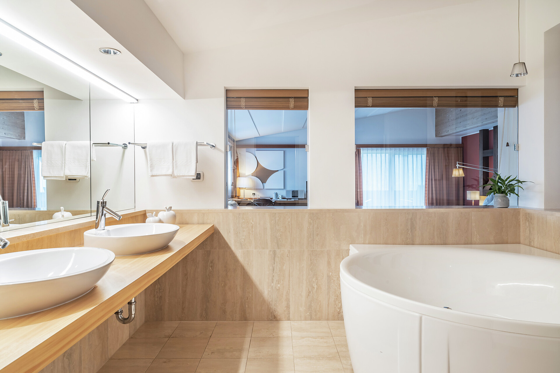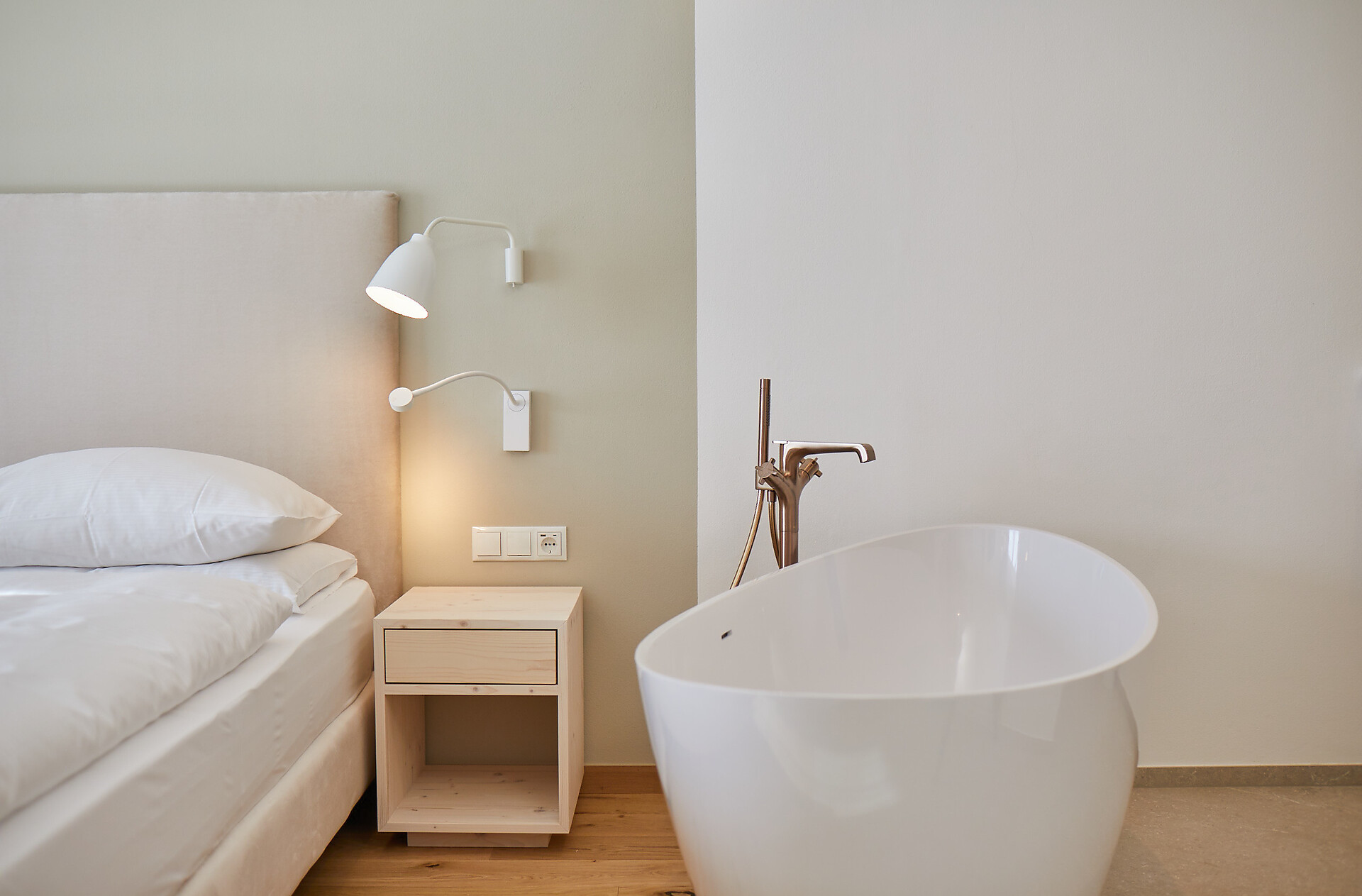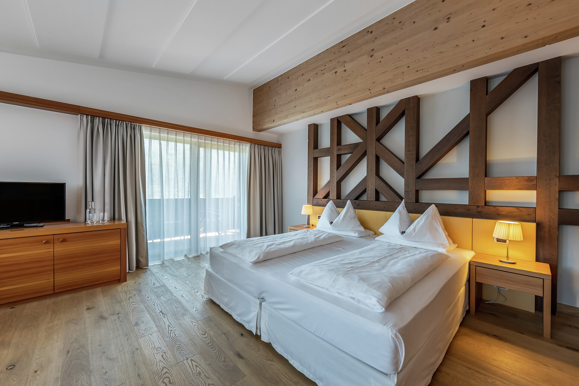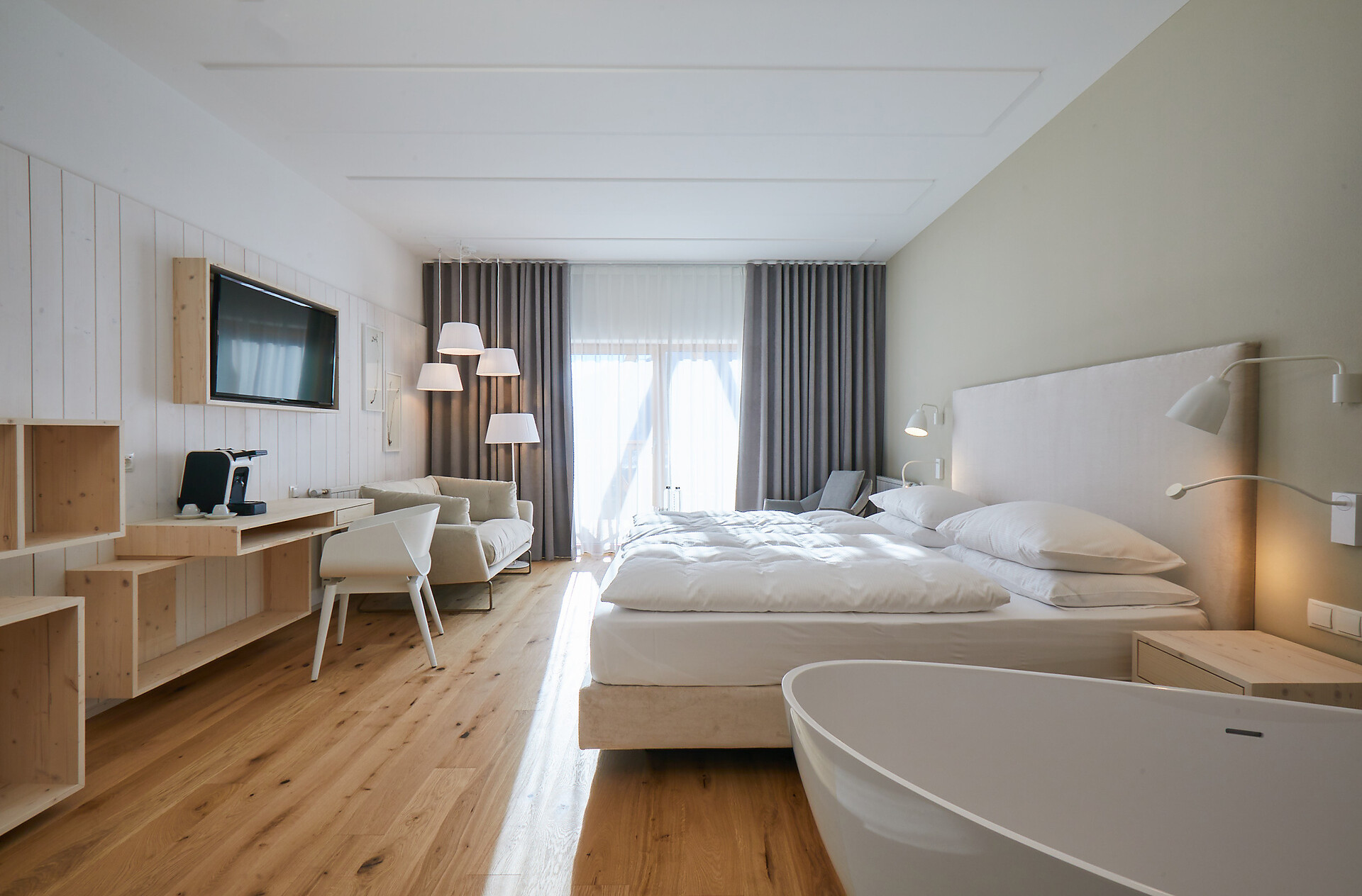 Eiche und Nadelholz. Sandfarbene Töne und helles Holz. Zeitlos und lichtdurchflutet. In dieser großzügigen Suite unter dem Dachfirst steht alles im Zeichen des modernen, alpinen Stils. Vom halboffenen Bad mit Annehmlichkeiten aus dem hellen italienischen Marmor Travertino Classico schweift der Blick durch das große Zimmer. An den Wänden bringen die Bilder der Serie „Gräser, Wind und Licht“ das Naturspektakel der Bergwelt ins Innere. Lassen Sie den Tag am Balkon ausklingen und träumen Sie von Ihrem nächsten Abenteuer in der Vinschger Naturlandschaft. (ca. 60 m² & 10m² Balkon)