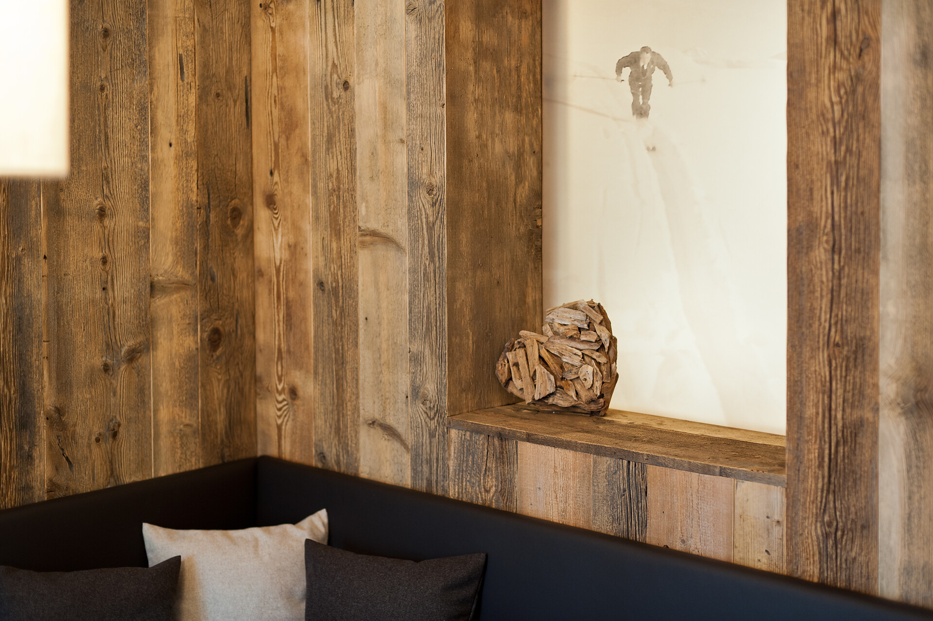Bad mit barrierefreier Dusche, Naturstein-Waschbecken, Bidet, WC und Föhn, Parkettböden, viel Holz, warme Loden- und Leinenstoffe.