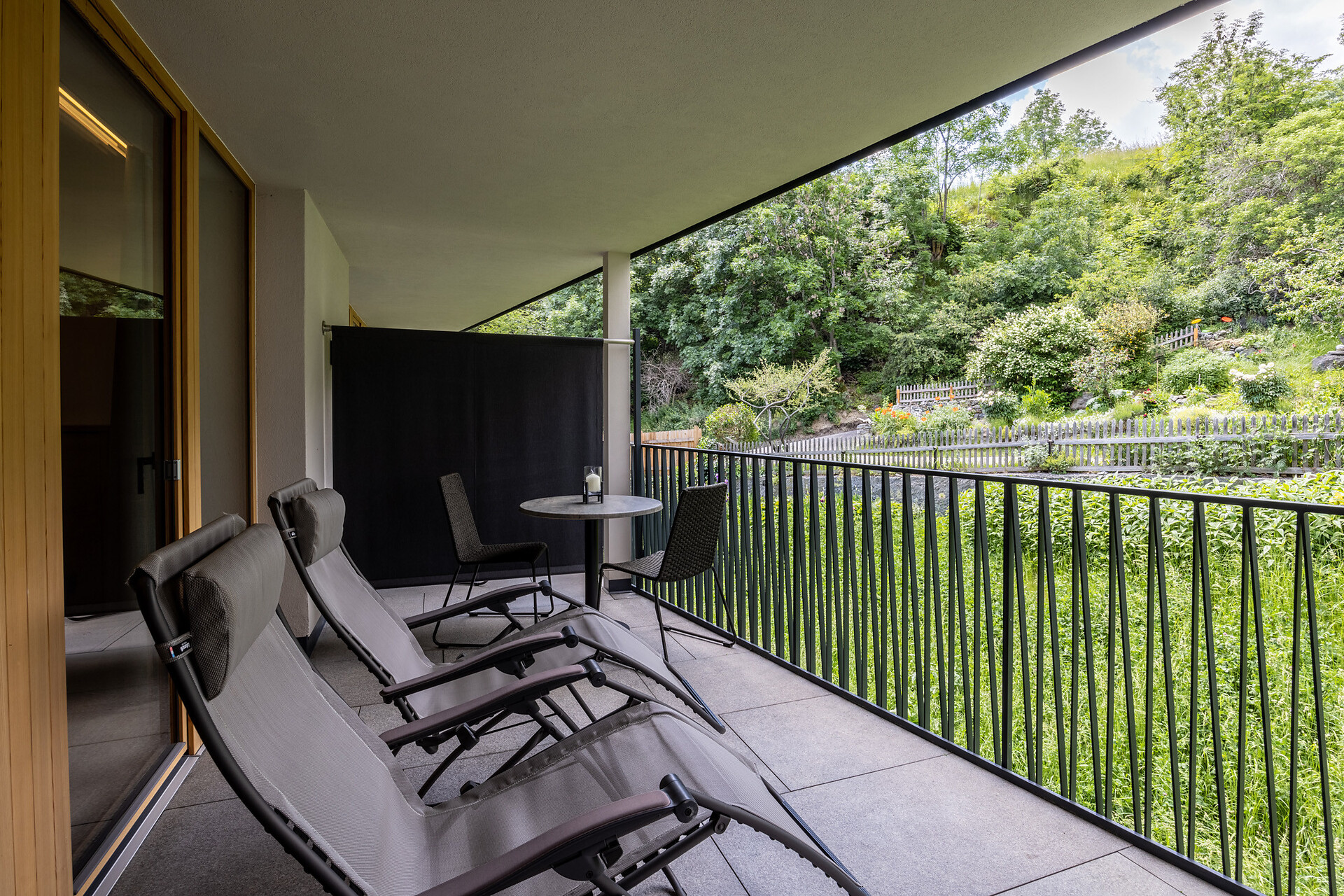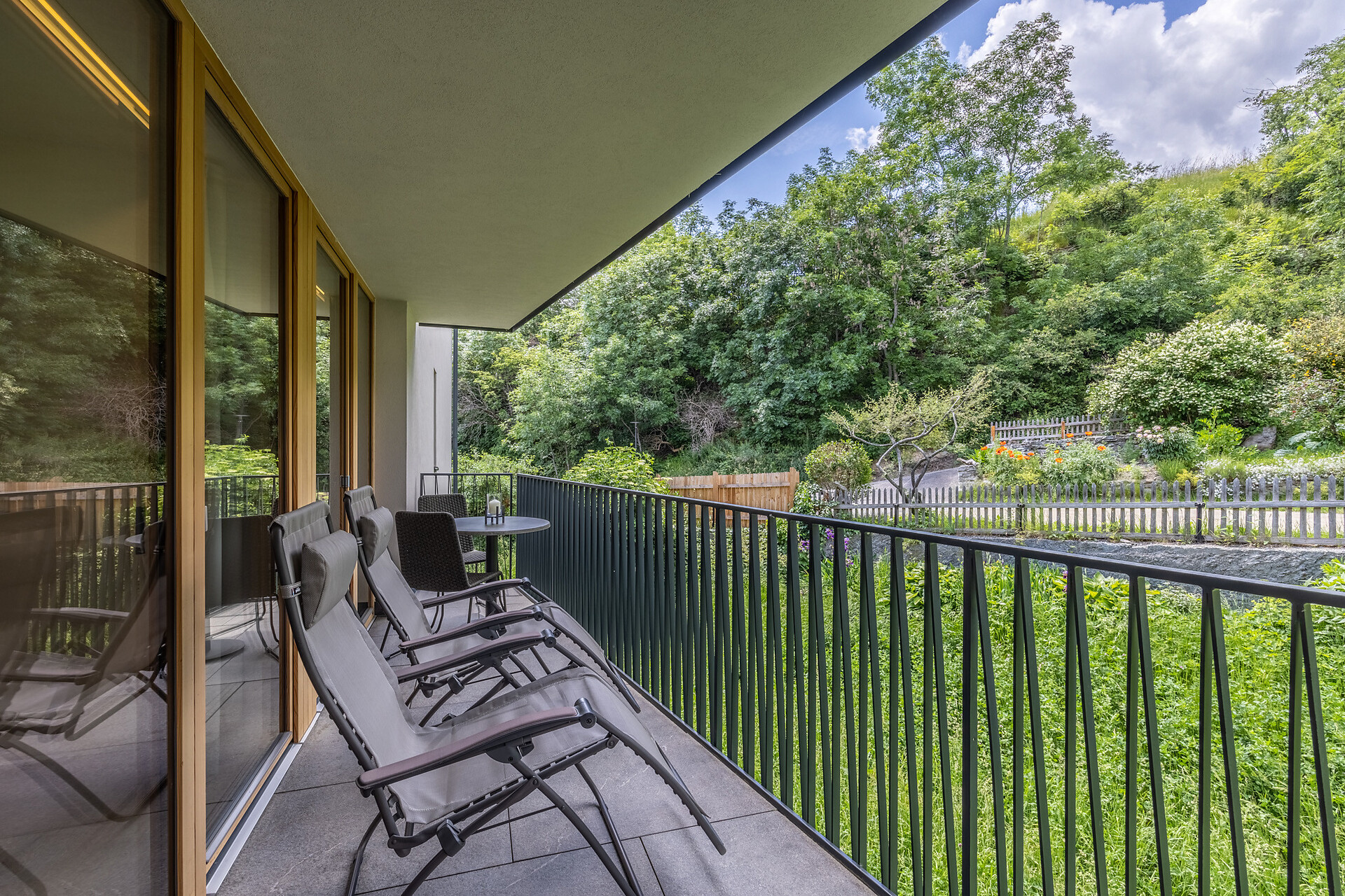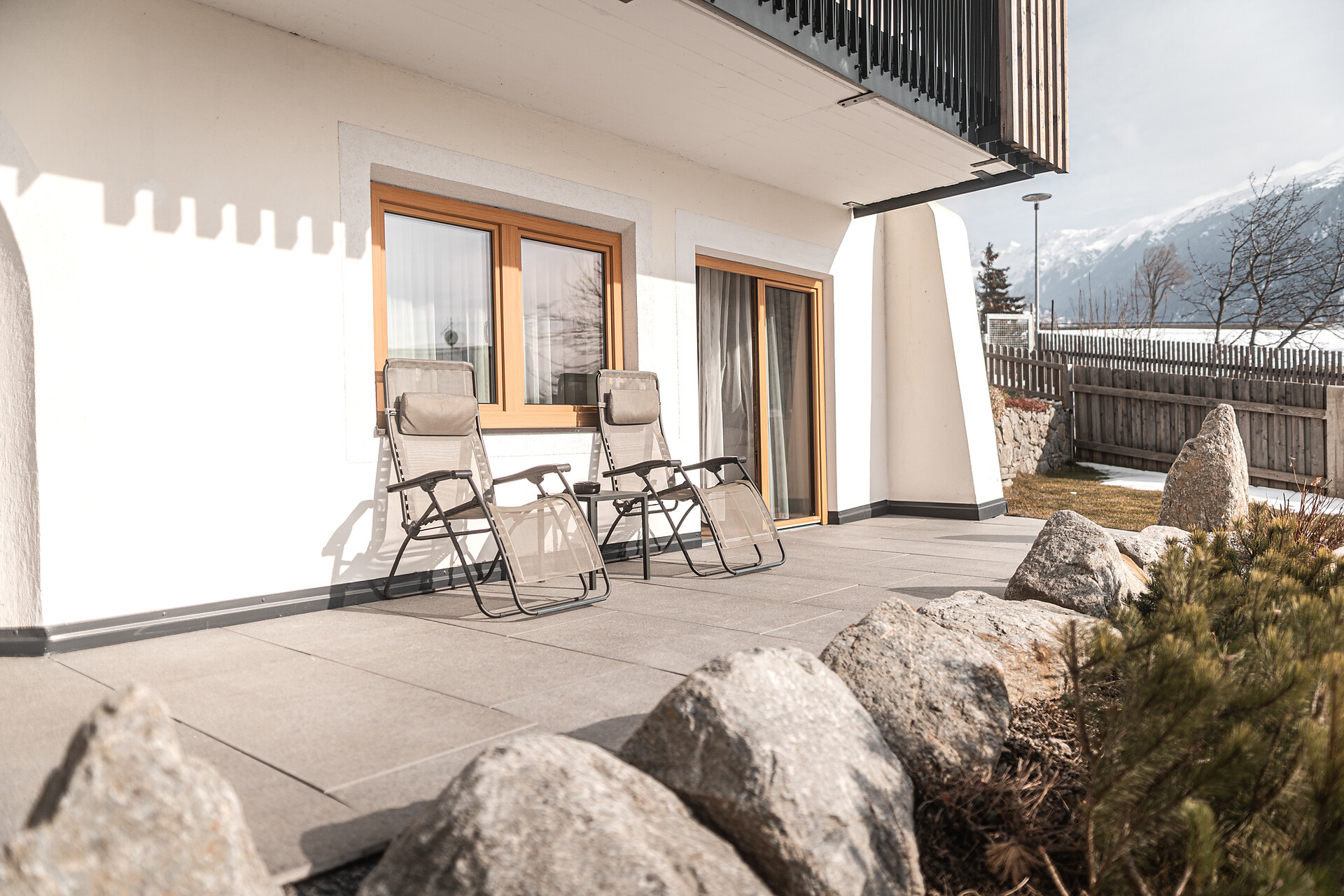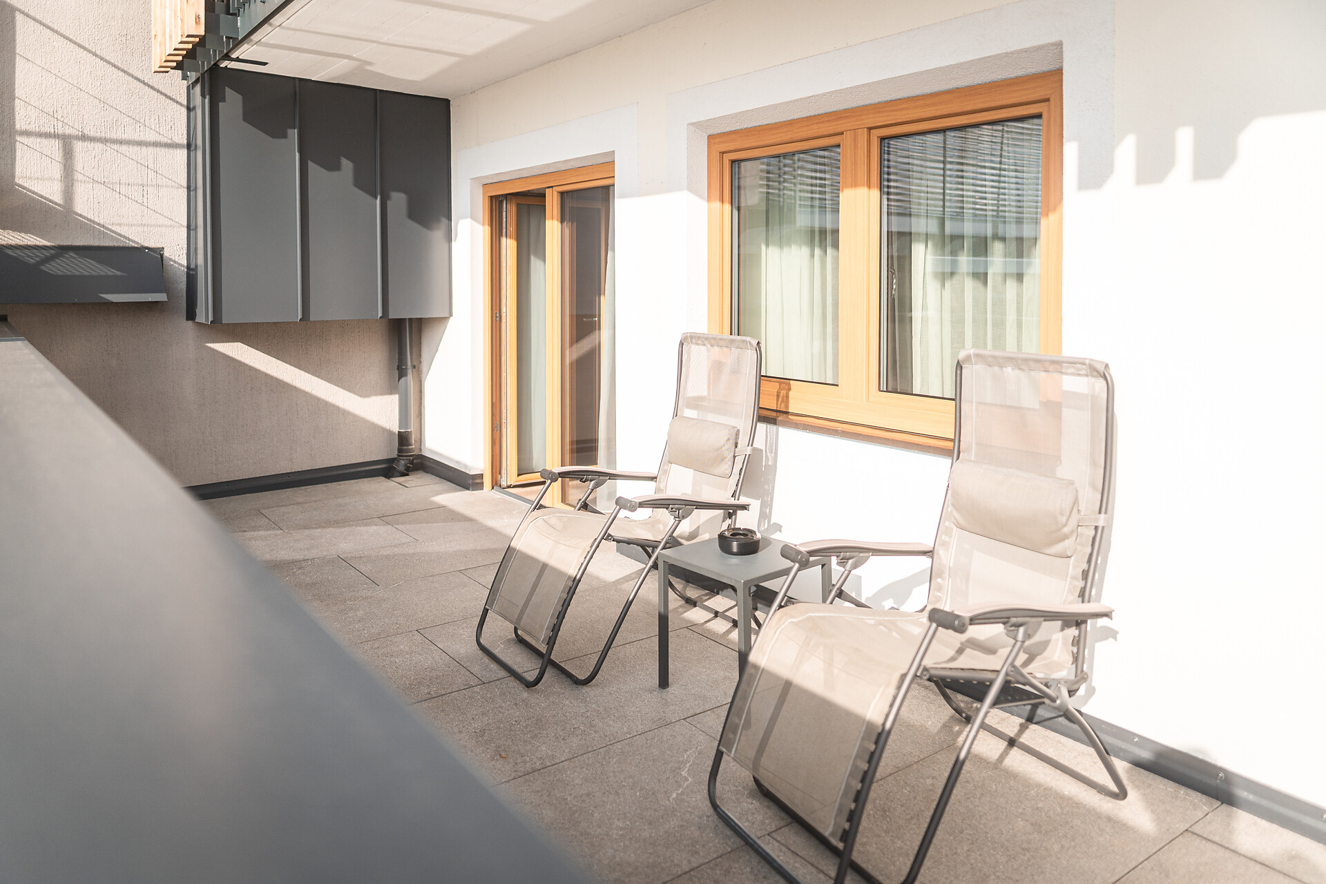 19 m² südseitige Terrasse mit 2 Liegestühlen