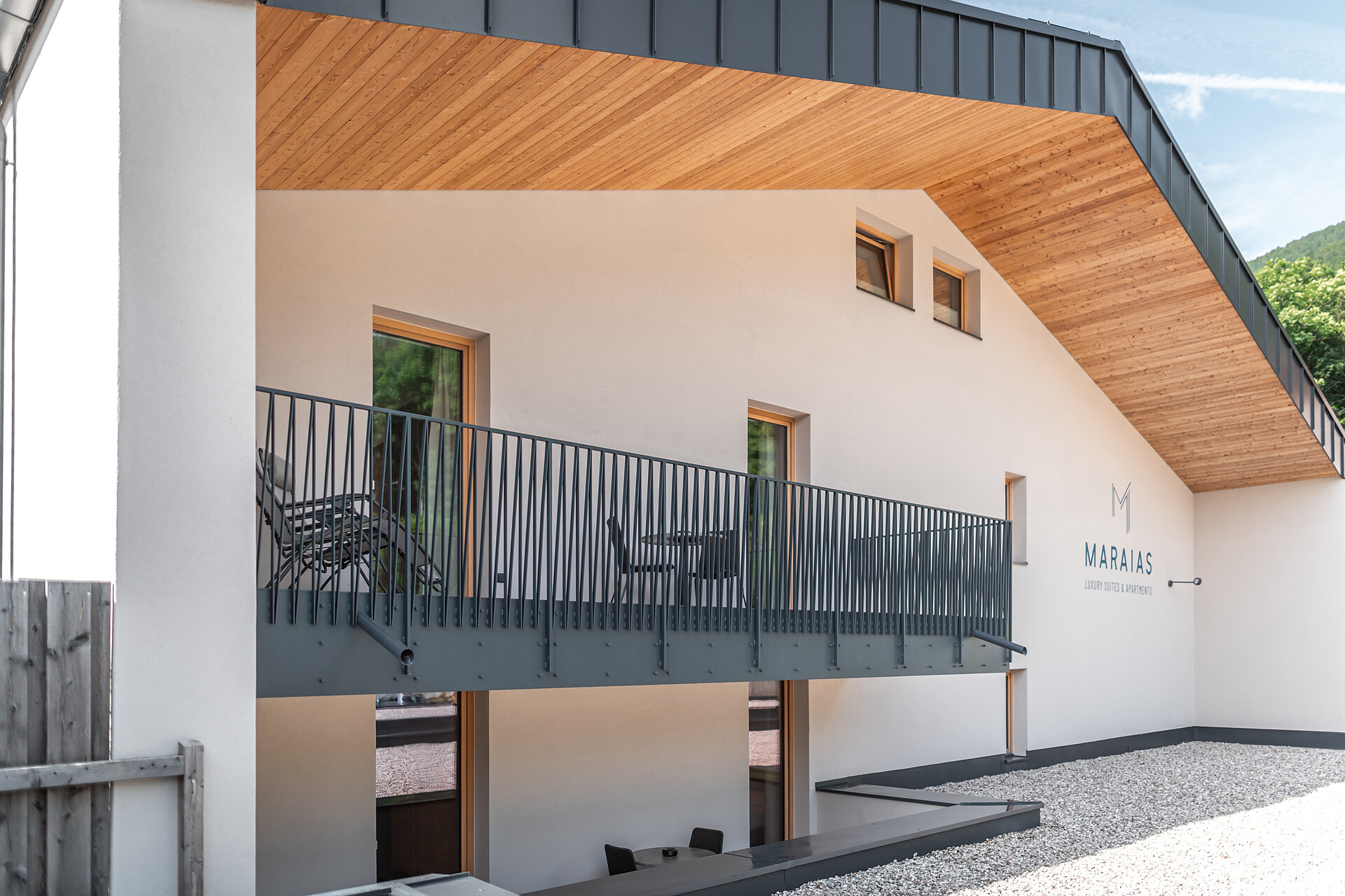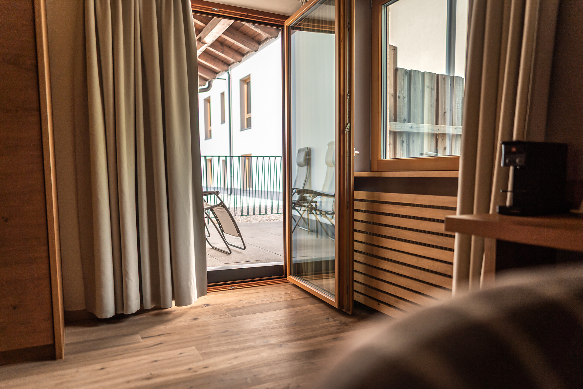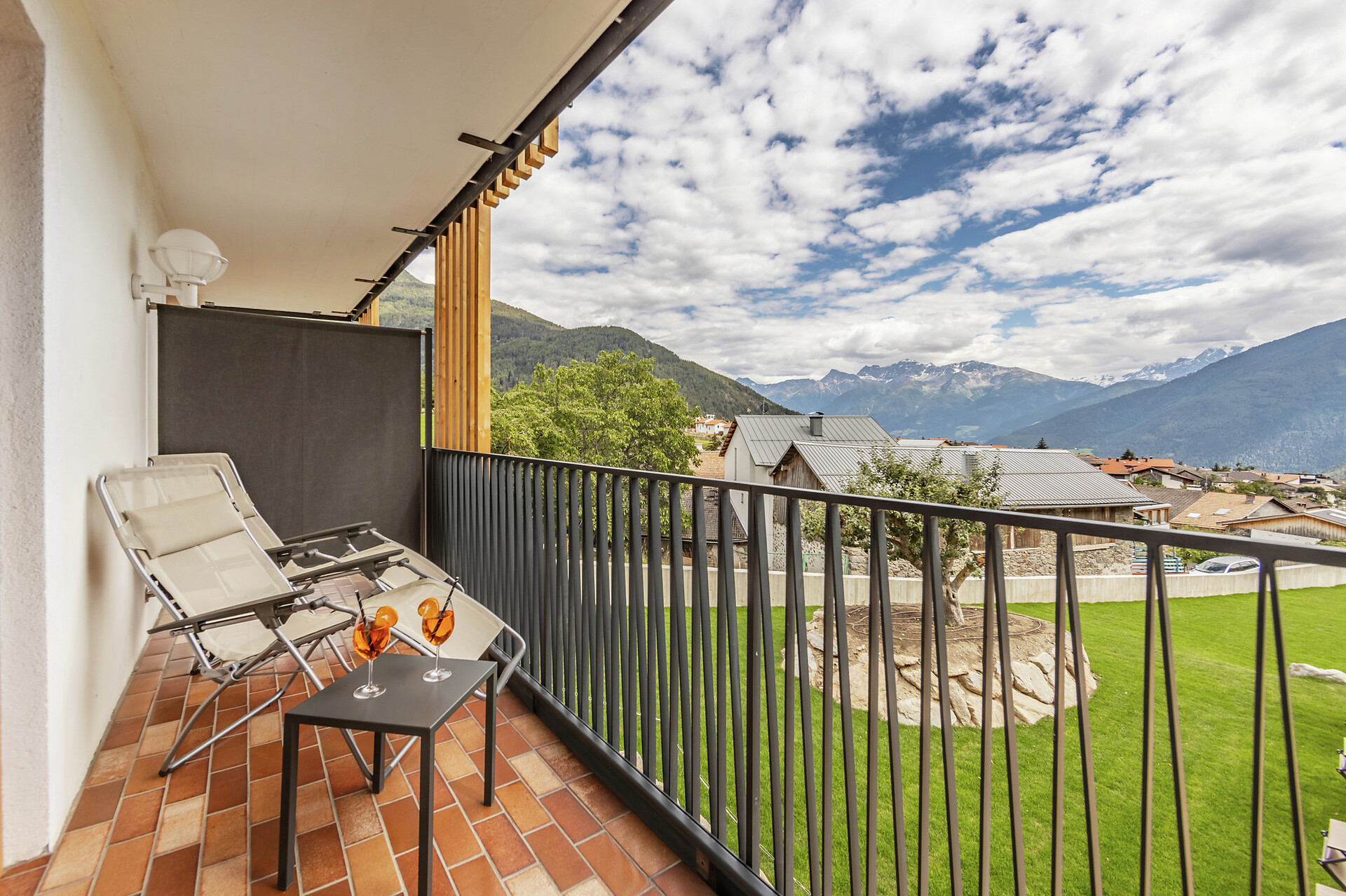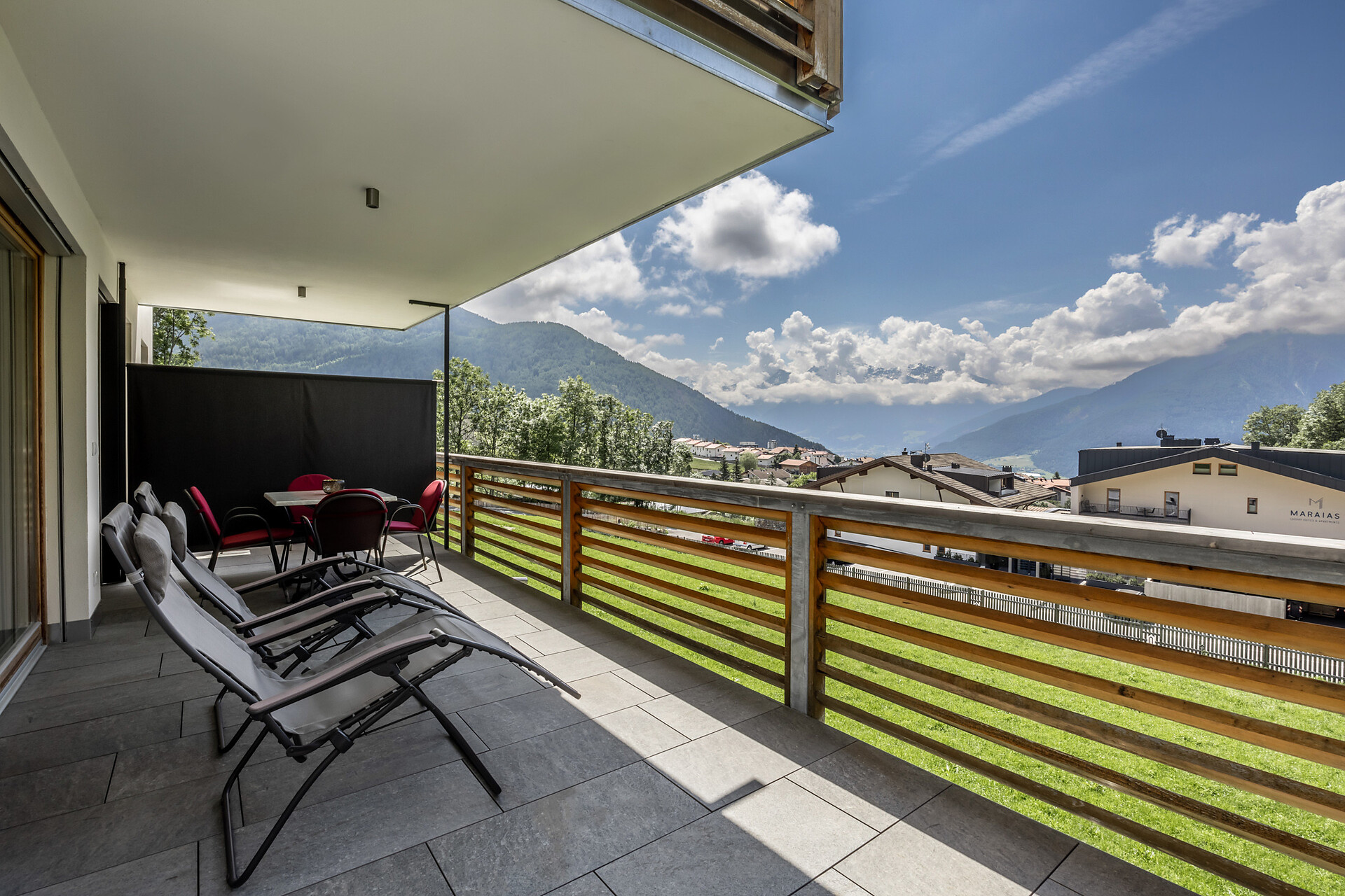 19 m² südseitige Terrasse mit 2 Liegestühlen
