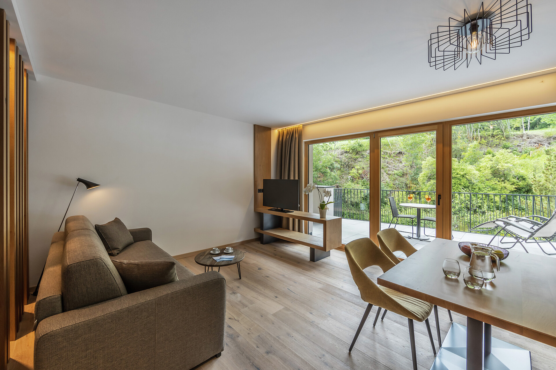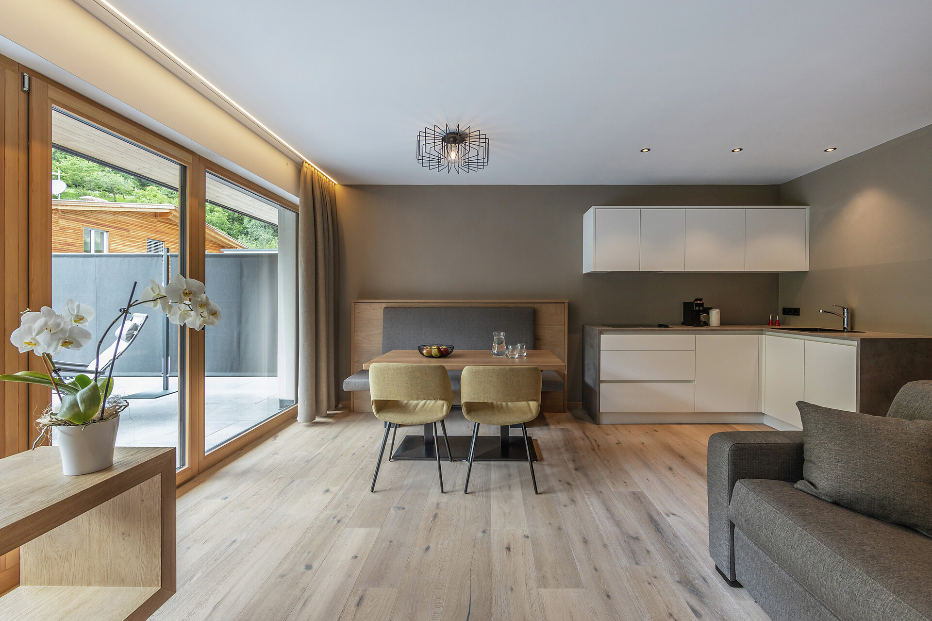 Wohnbereich mit Esstisch, Schlafsofa und großen Fensterflächen