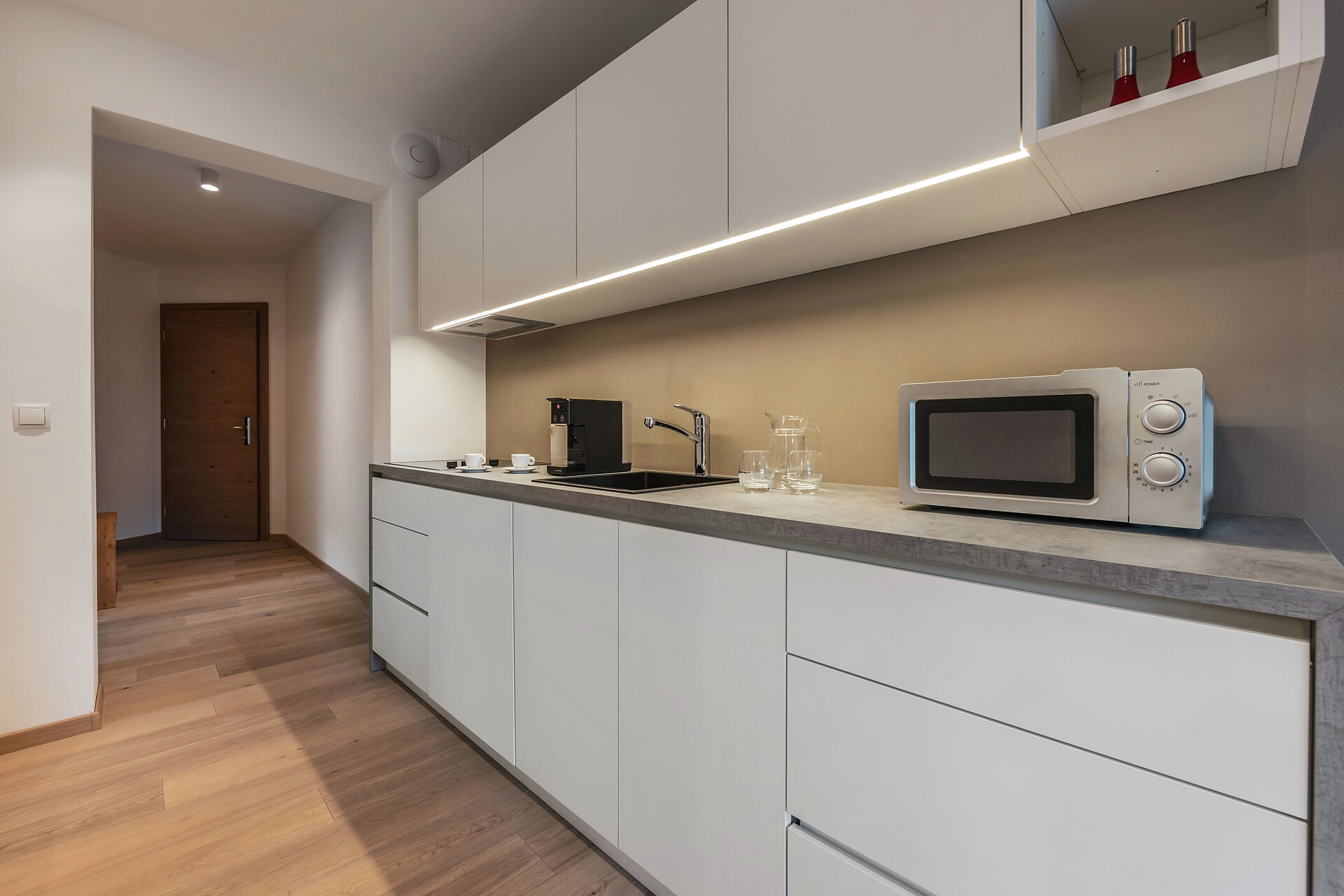 Küche mit Cerankochfeld, Kühlschrank mit Gefrierfach, Mikrowelle und Spülmaschine, Geschirr,