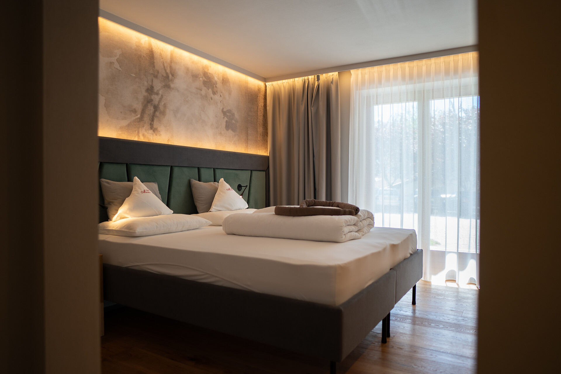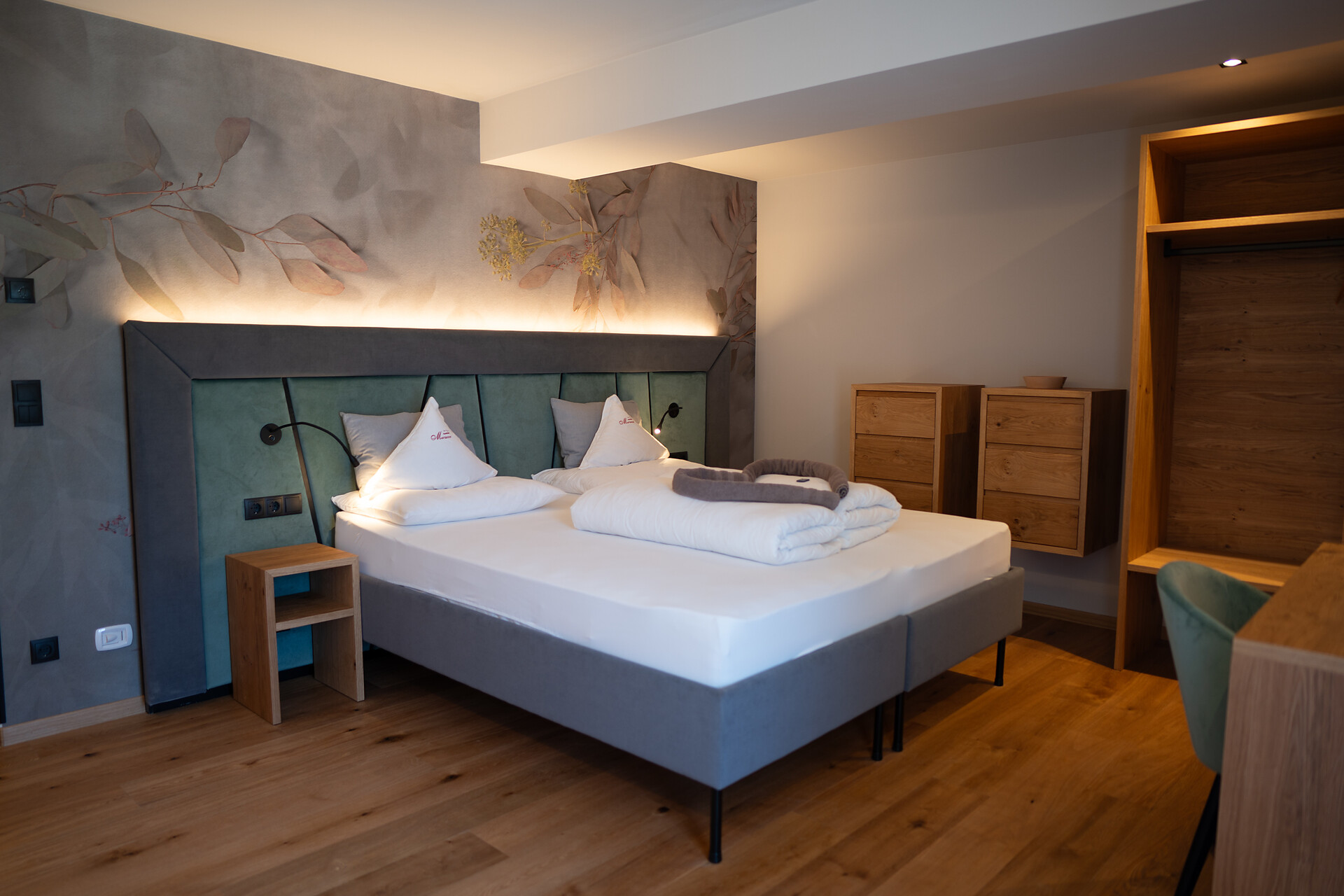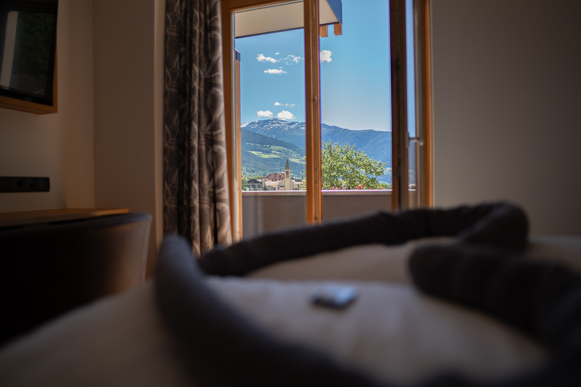 Unser gemütliches Doppelzimmer mit Holzboden verfügt über ein Doppelbett, Sitzmöglichkeiten, TV, Safe, kostenloses WLAN und einen Balkon mit Bergblick. Das Badezimmer ist mit Dusche, WC, Föhn und kostenlosen Pflegeprodukten ausgestattet.