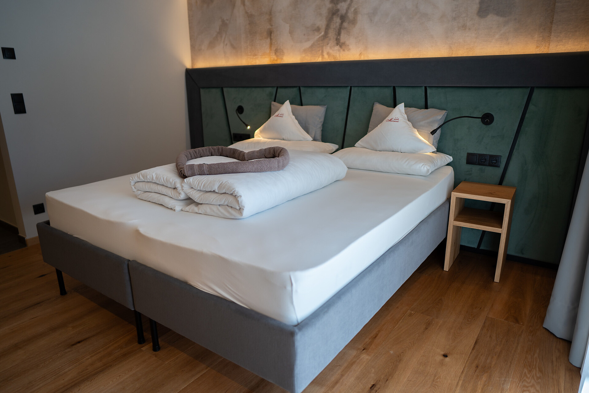 Unser gemütliches Doppelzimmer mit Holzboden verfügt über ein Doppelbett, Sitzmöglichkeiten, TV, Safe und kostenloses WLAN. Das Badezimmer ist mit Dusche, WC, Föhn und kostenlosen Pflegeprodukten ausgestattet.