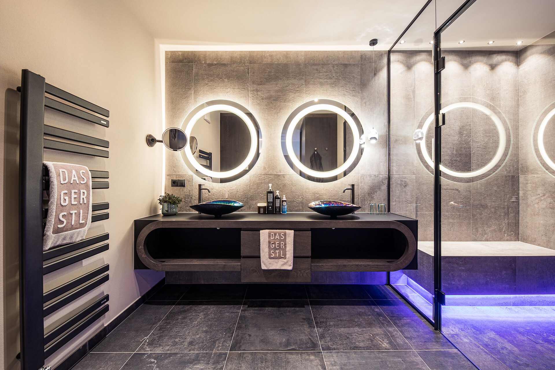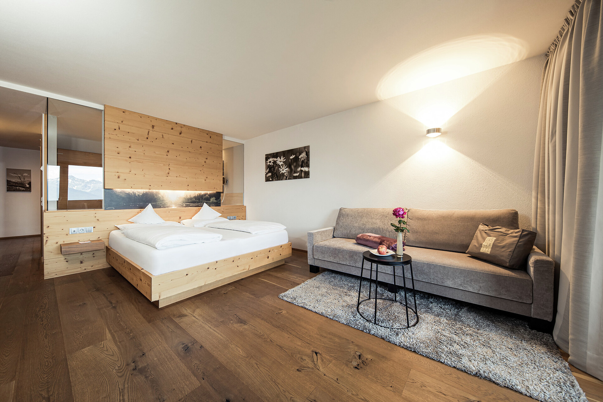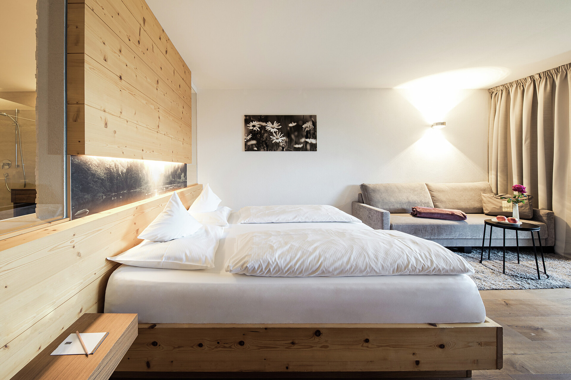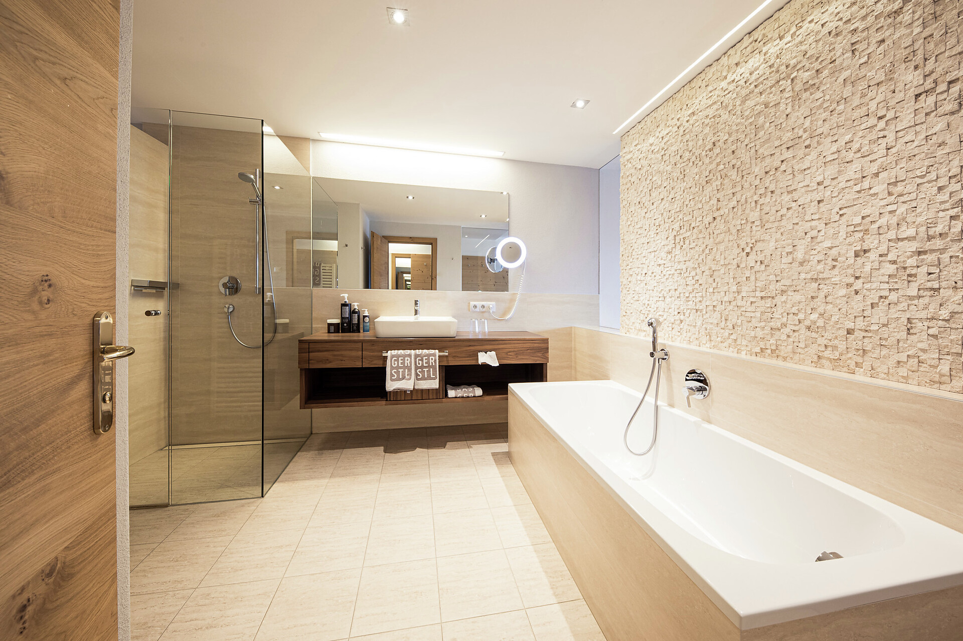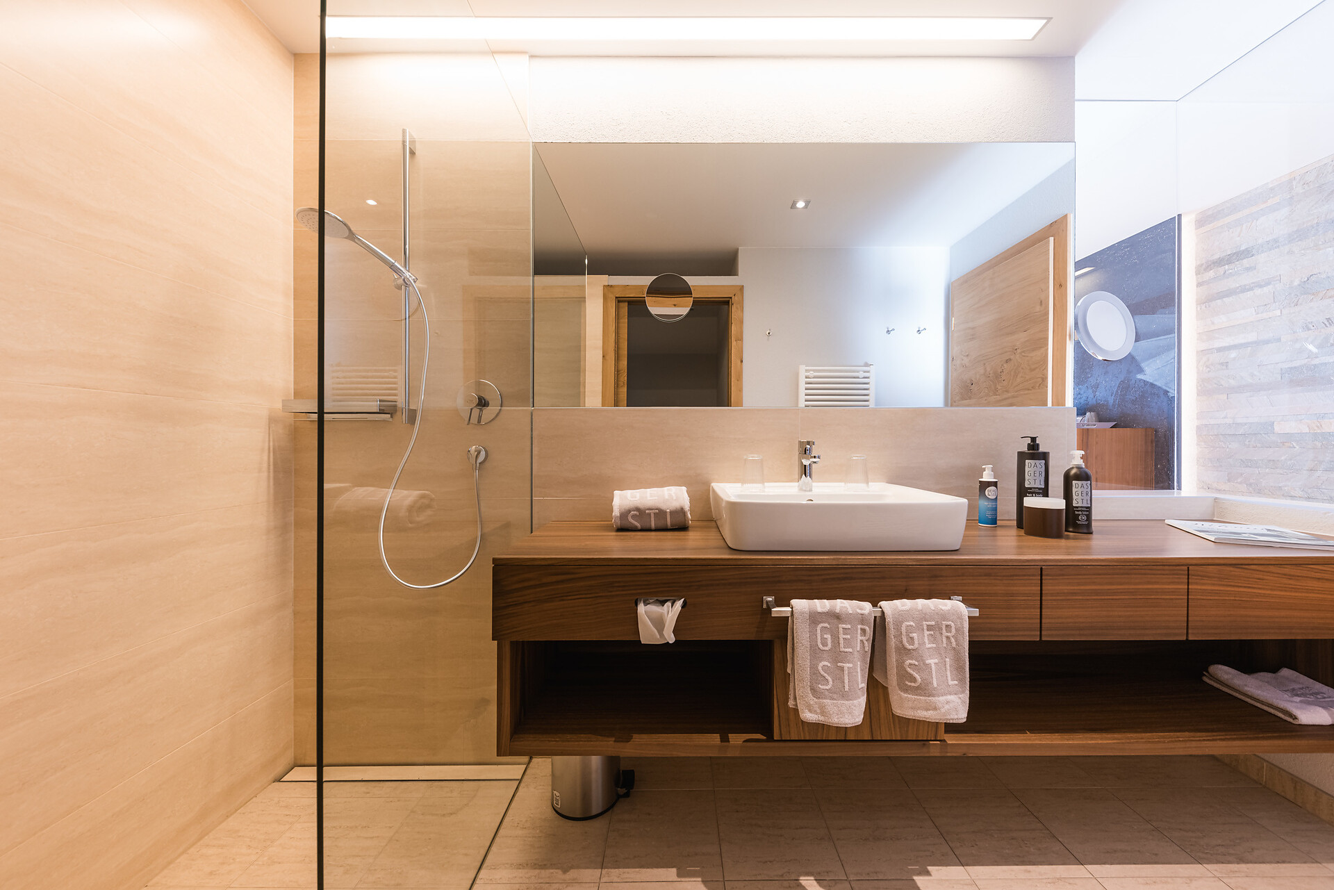 Diese exklusive Suite ist ideal für alle, die sich den privaten Wellnessgenuss gönnen möchten. Die freistehende Luxuswanne im Zimmer mit Blick auf die umliegende Bergwelt und die großzügige Dusche laden zu Wohlfühlmomenten zu Zweit ein.
