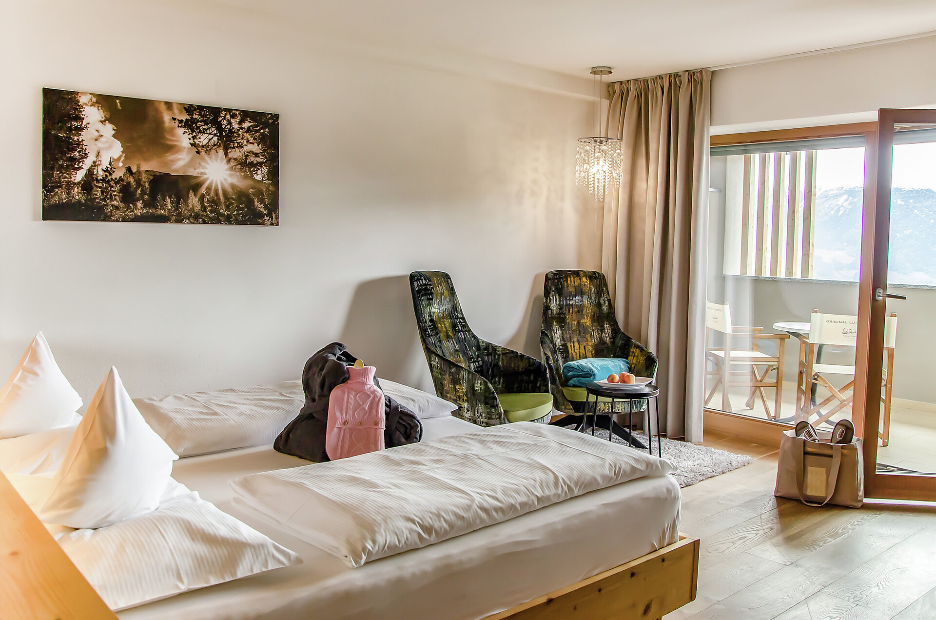 Alle Zimmer | Suiten sind ausgestattet mit Minibar, Sat-TV, Safe, Telefon, kostenlosem WLAN, Wasserkocher und Teebeutel, Kaffeemaschine, Haarföhn, Kosmetikspiegel, Leih-Wellnesstasche mit Bademantel, Badeschuhen, Badetüchern für Sauna und Pool, Leih-Wanderrucksack.