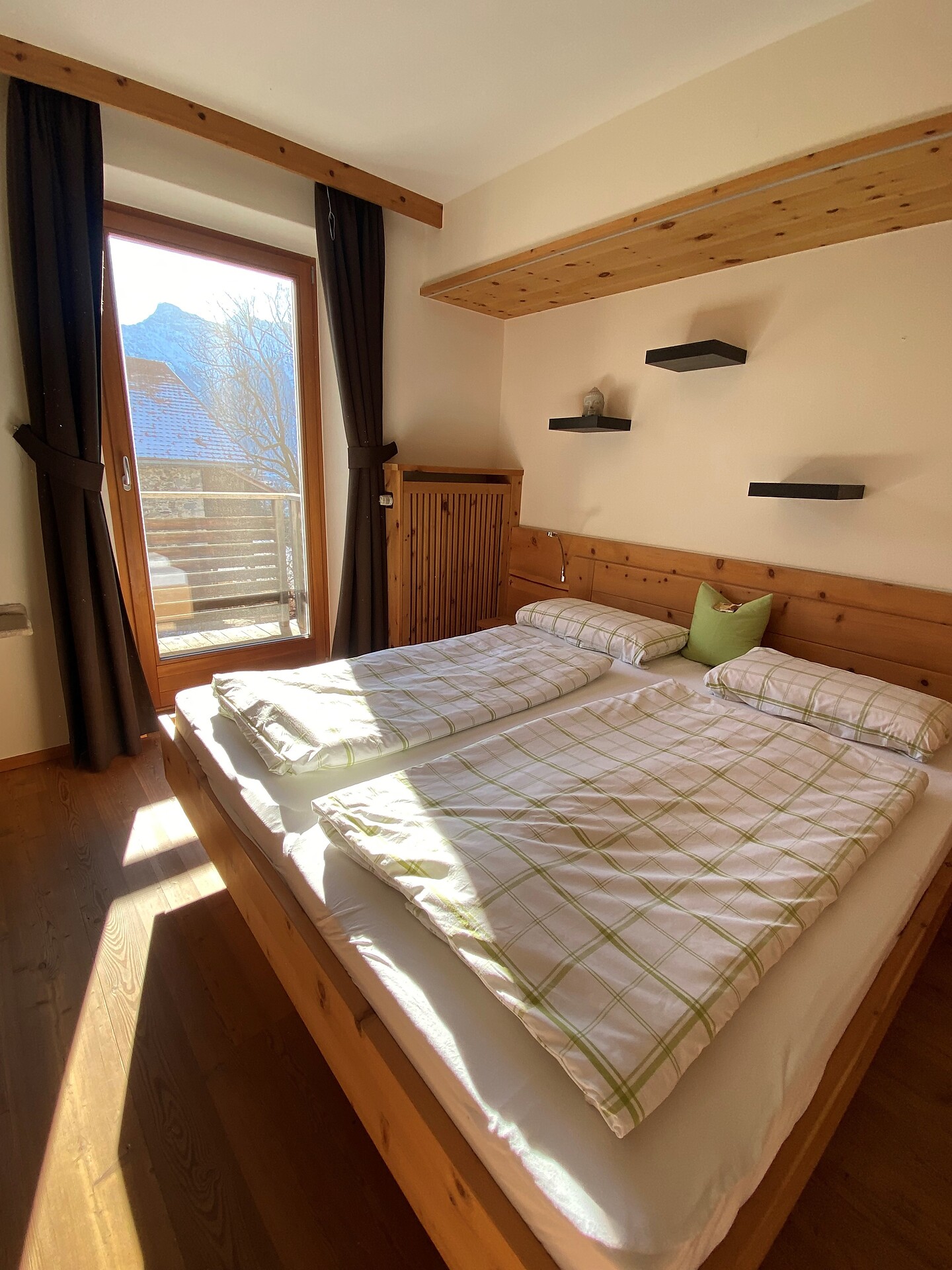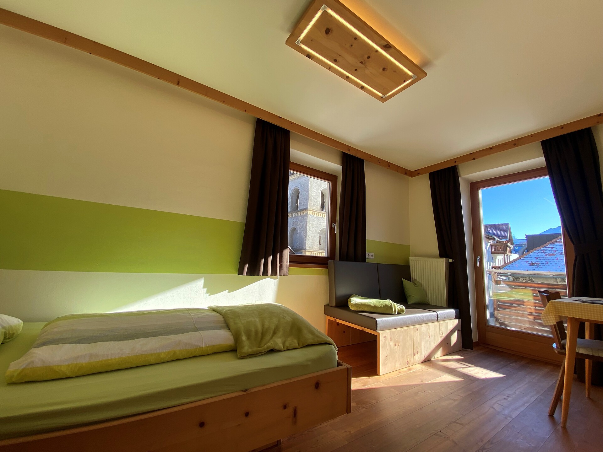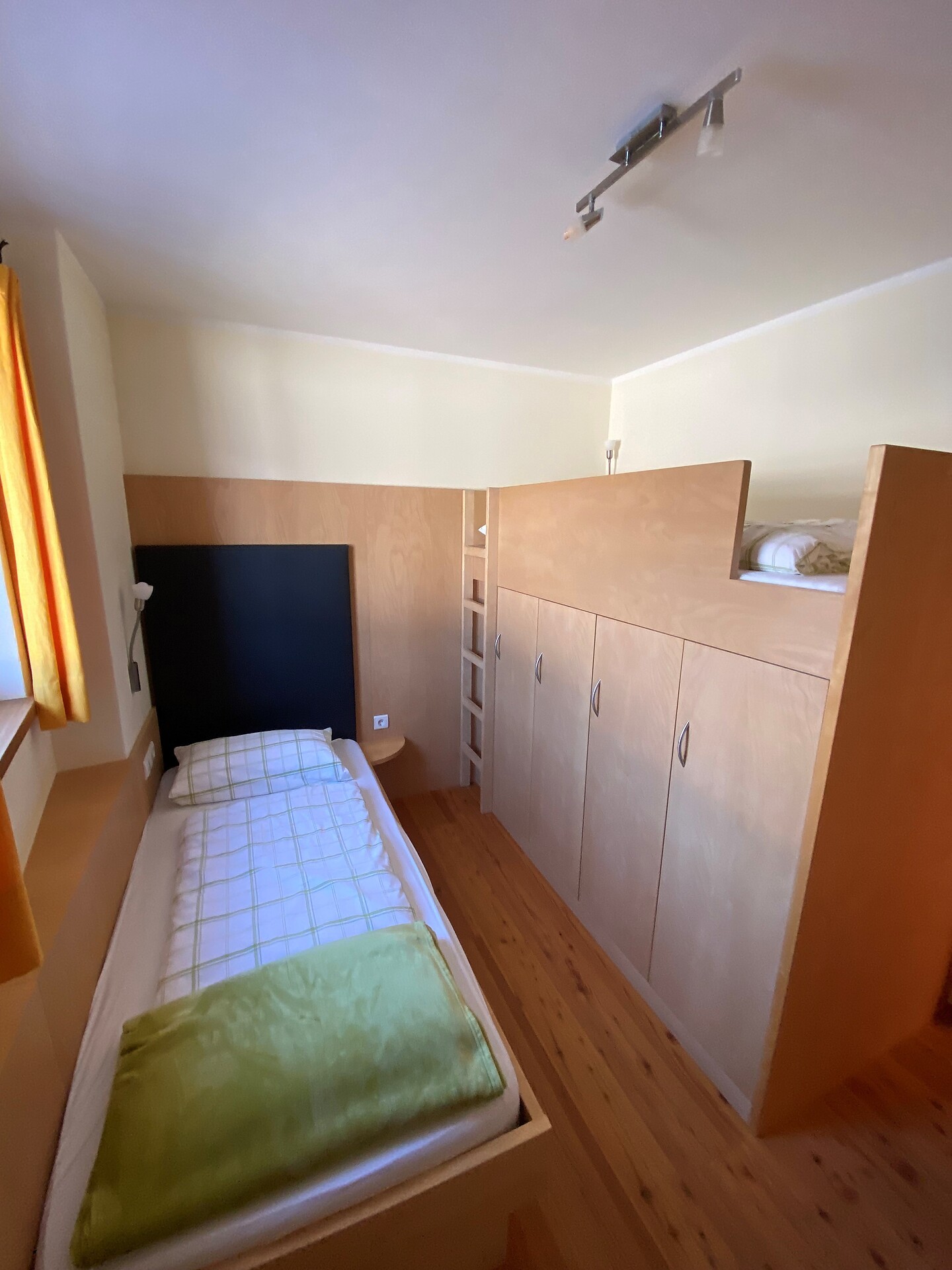 Hier erwartet Euch ein feines Doppelzimmer mit grandiosem Blick auf das Ortlergebirge und ein angeschlossenes Zimmer mit zwei weiteren Einzelbetten, davon ein Hochbett, das Kinder lieben.