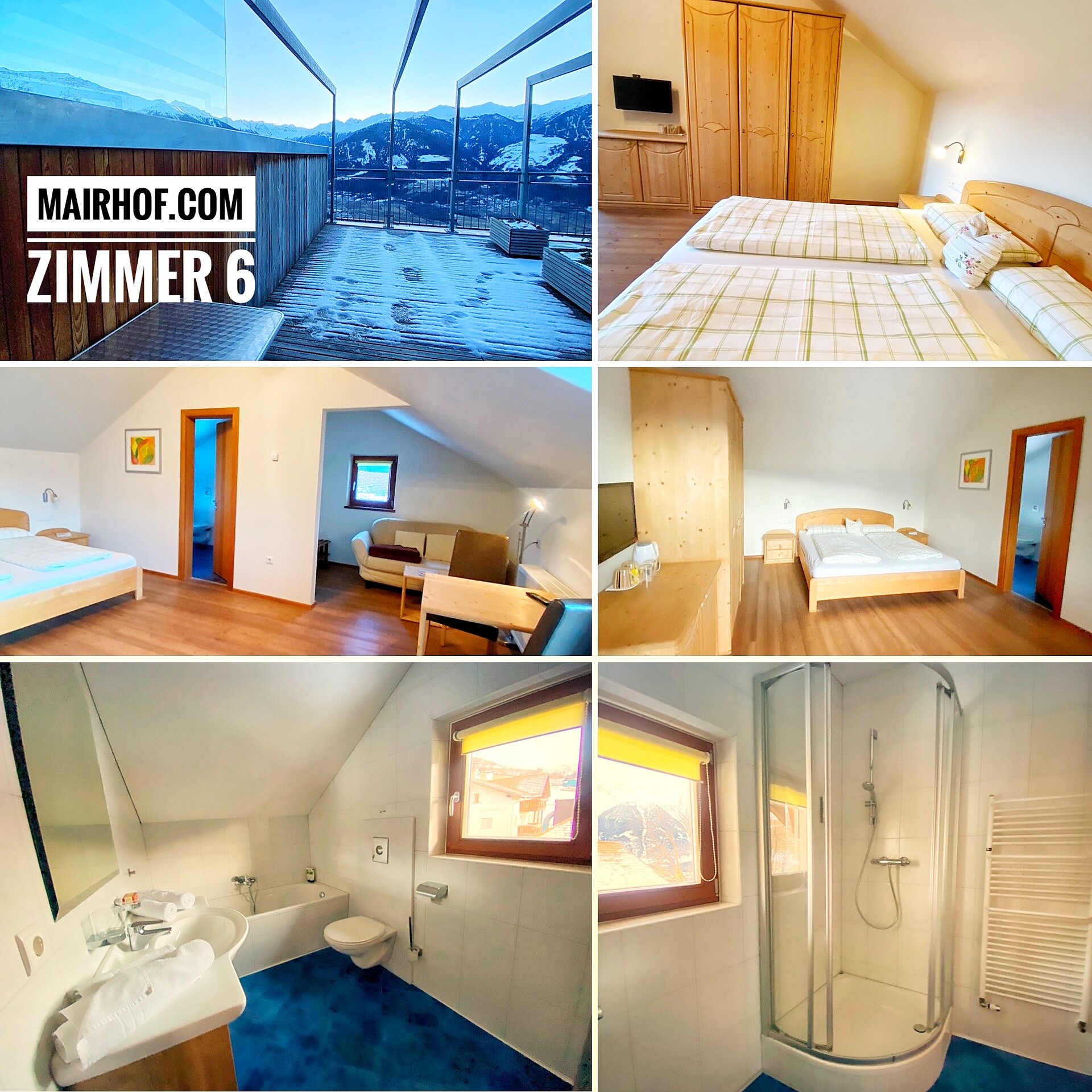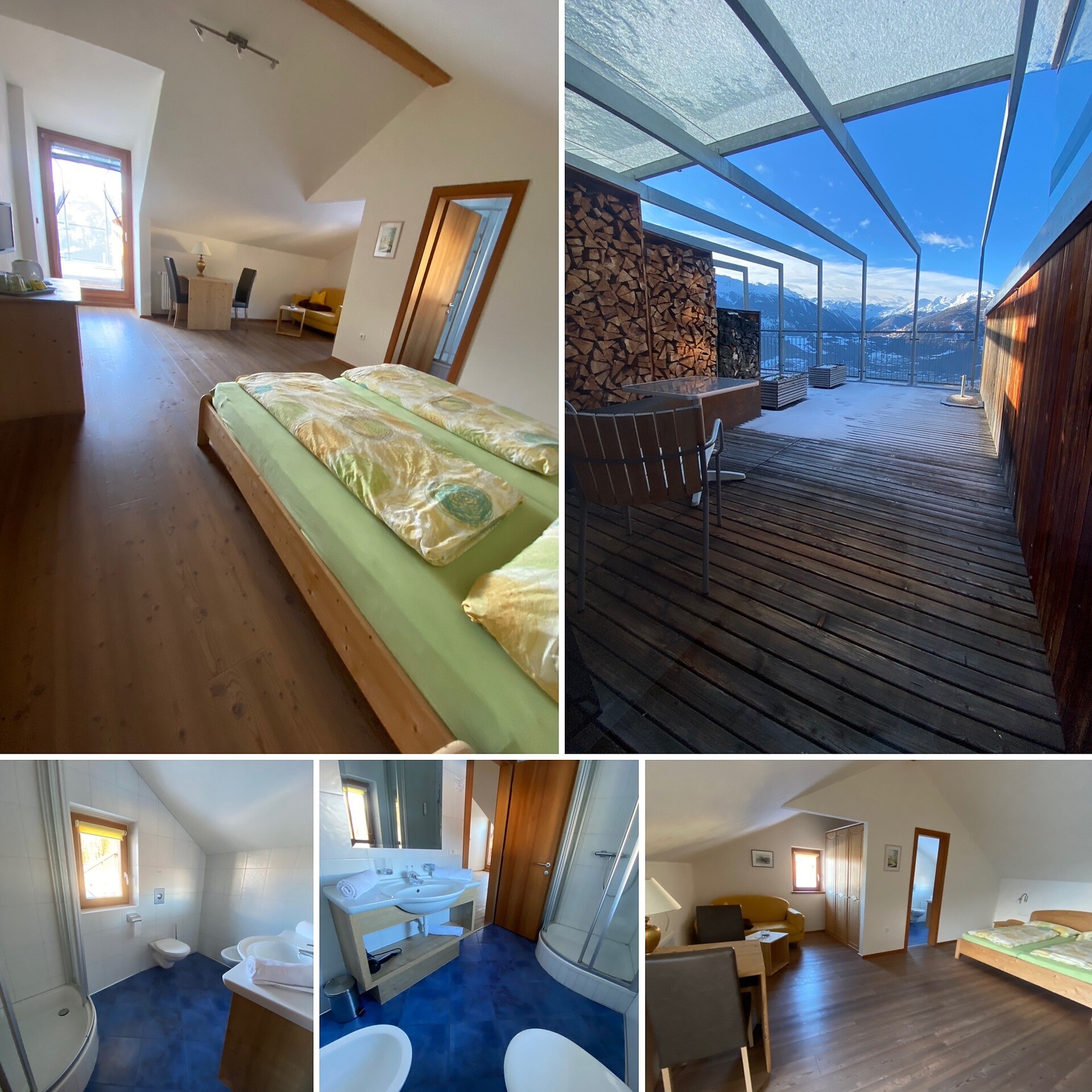 Das Zimmer 5 - Acht Gipfel Marsch - hat einen fantastischen Blick von der eigenen Terrasse auf die Silhouette der bekannten und anspruchsvollen Bergtour. Die 35 m² große Unterkunft besticht durch ein großes Schlafzimmer mit Doppelbett und Schlafcouch sowie Tageslicht Badezimmer mit Bidet. Mit einem weiteren Zustellbett ist es ideal für eine Familie mit bis zu zwei kleinen Kindern Zur Ausstattung des Mairhofs gehören außerdem Wintergarten, Gemeinschaftsküche und-garten, die gute Stube, Wi-Fi, Arbeitsplätze für Homeoffice, sowie Kinderbücher und Spielsachen.
